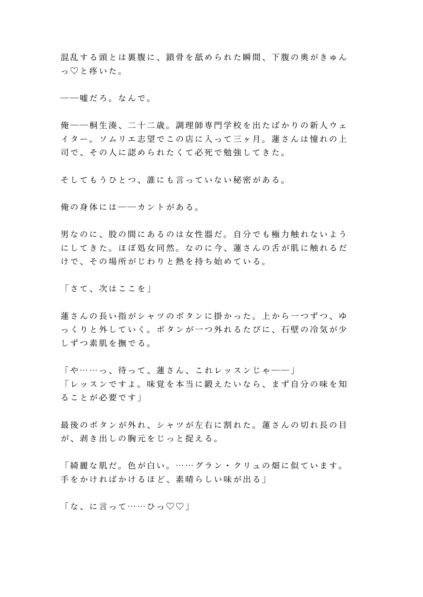 調理師専門学校を卒業したばかりの新人ウェイター・桐生湊、二十二歳。誰にも明かせない秘密を股の間に隠しながら、憧れのヘッドソムリエ・神楽坂蓮のもとでソムリエを目指していた。「テイスティングの特別レッスン」に誘われ、疑いもなくセラーへ降りた夜、地下二階のロックが閉まる音とともに、湊の日常は終わりを告げる。