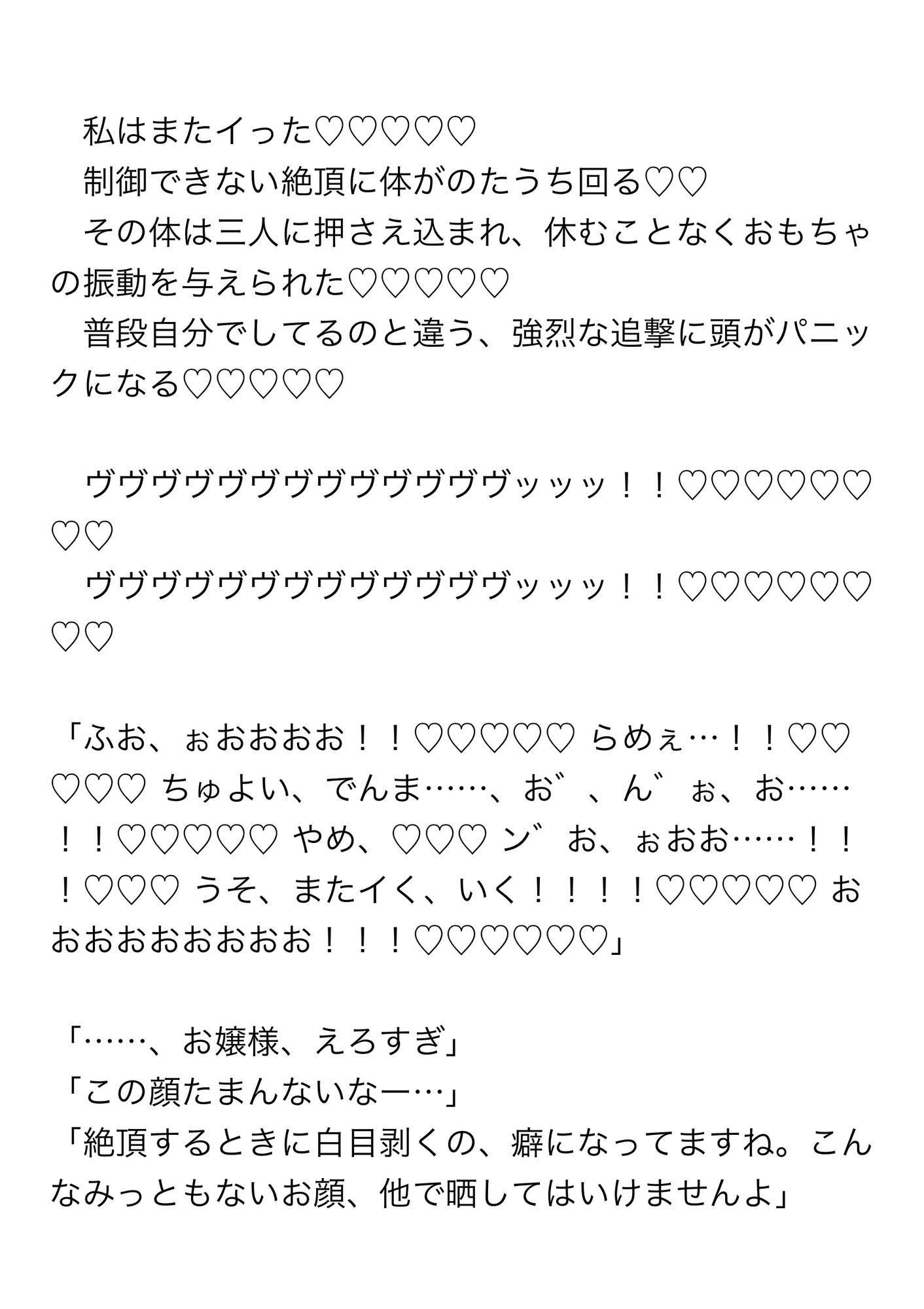 オナニー中毒の「私」を満足させようと、手、口、ちんぽ、それから「私」がいつも使っているおもちゃで休むことなく愛撫し続ける執事たち。