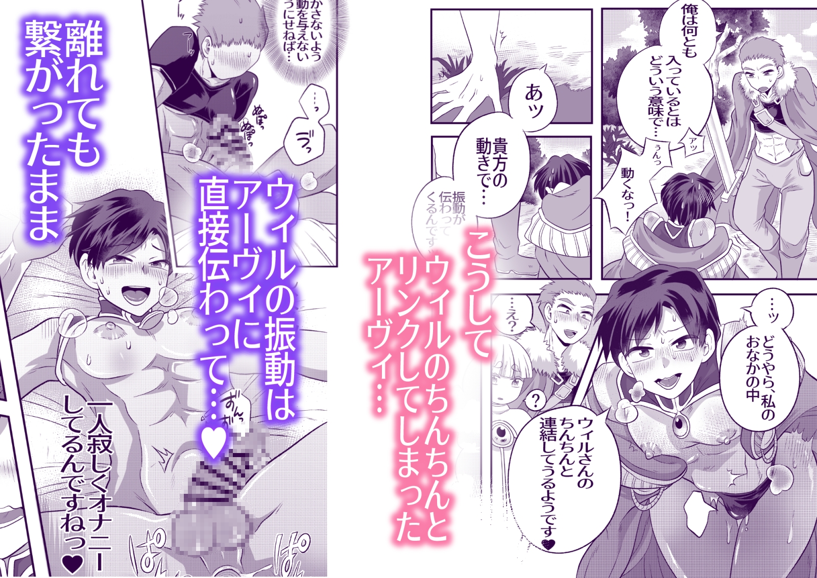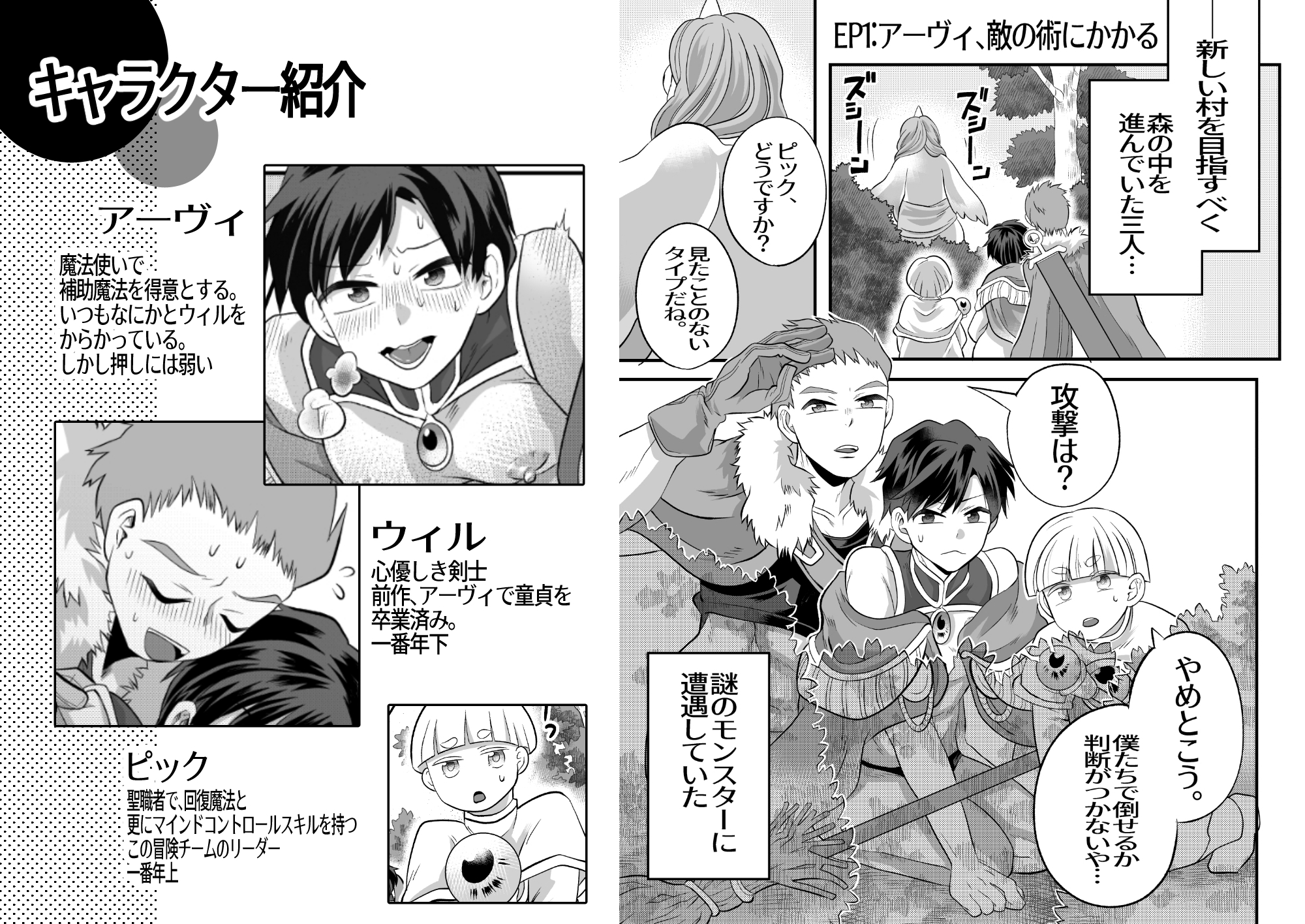 「お尻に何か…入ってます!」冒険者の一行は次の村へ向かう最中、奇妙なモンスターの魔法にかけられてしまう。その中で魔法使いのアーヴィの中に違和感が…。「この身に覚えのある大きさ、同じ冒険者仲間のウィルさん?!」訳も分からず強○的におちんちんが入ったままになったアーヴィは、ウィルが動くたびに中を擦られてしまい…♡剣士×魔法使いの冒険ファンタジーエロ漫画です!