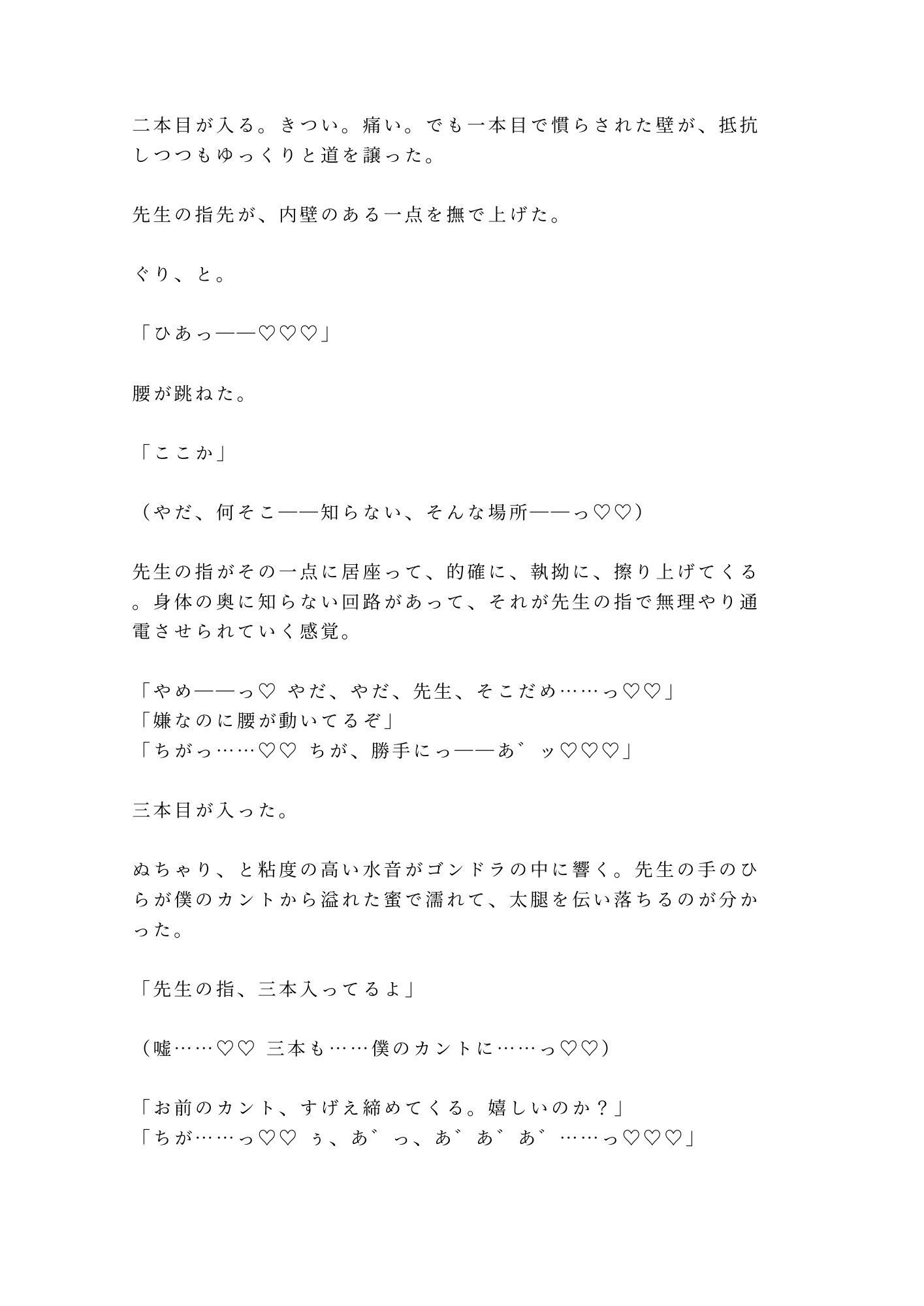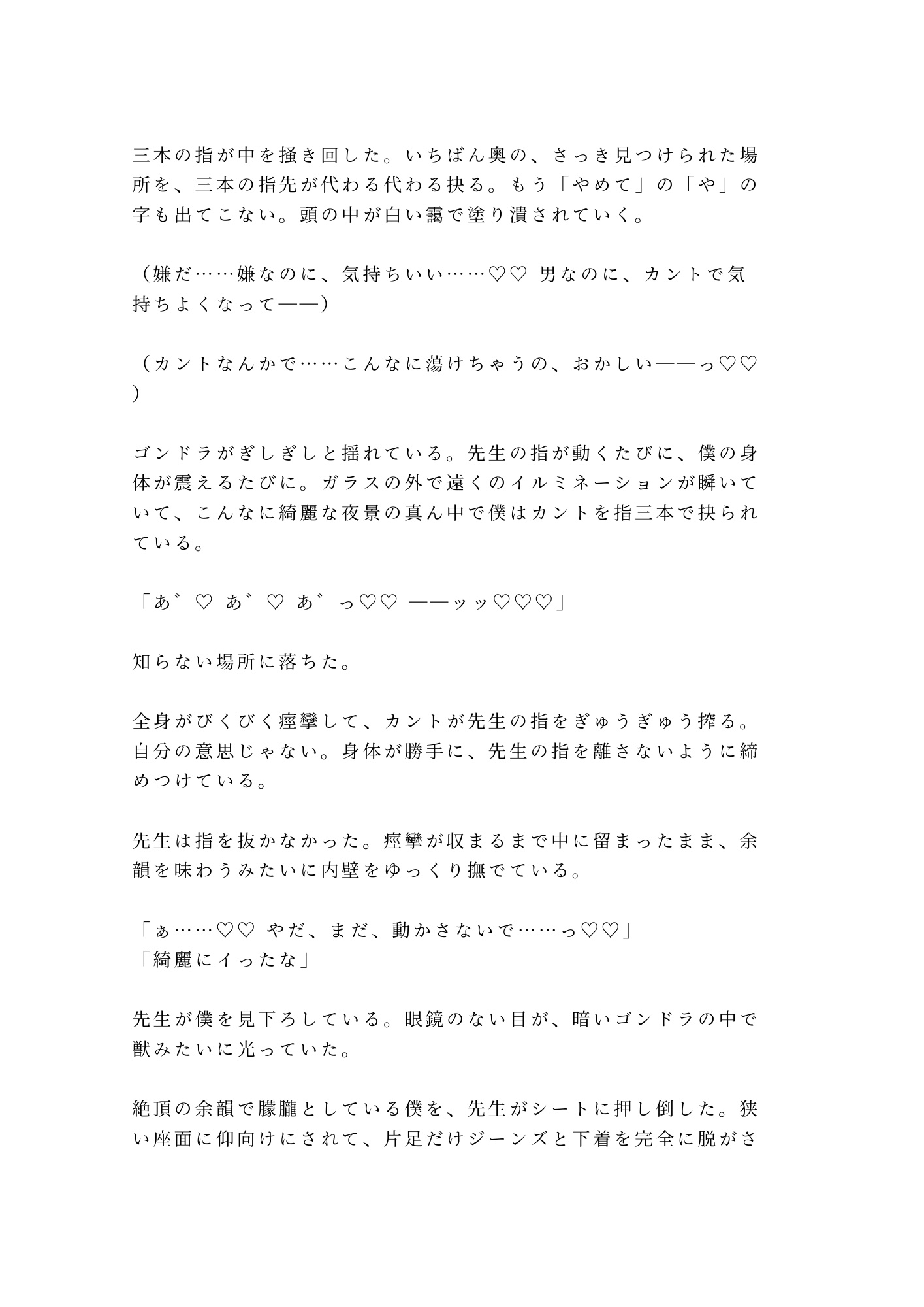 高校時代の元担任・白石と偶然観覧車に乗り合わせた奏汰。頂上で突然停止したゴンドラ——逃げ場のない空中密室で、先生の仮面が剥がれた。「卒業するまで待った」。三年間隠し続けた執着が牙を剥き、地上65メートルの夜景をバックに奏汰のカントが暴かれていく。指で、舌で、そして三回の中出しで完全に堕とされる、逃げ場なしの空中密室カントボーイ