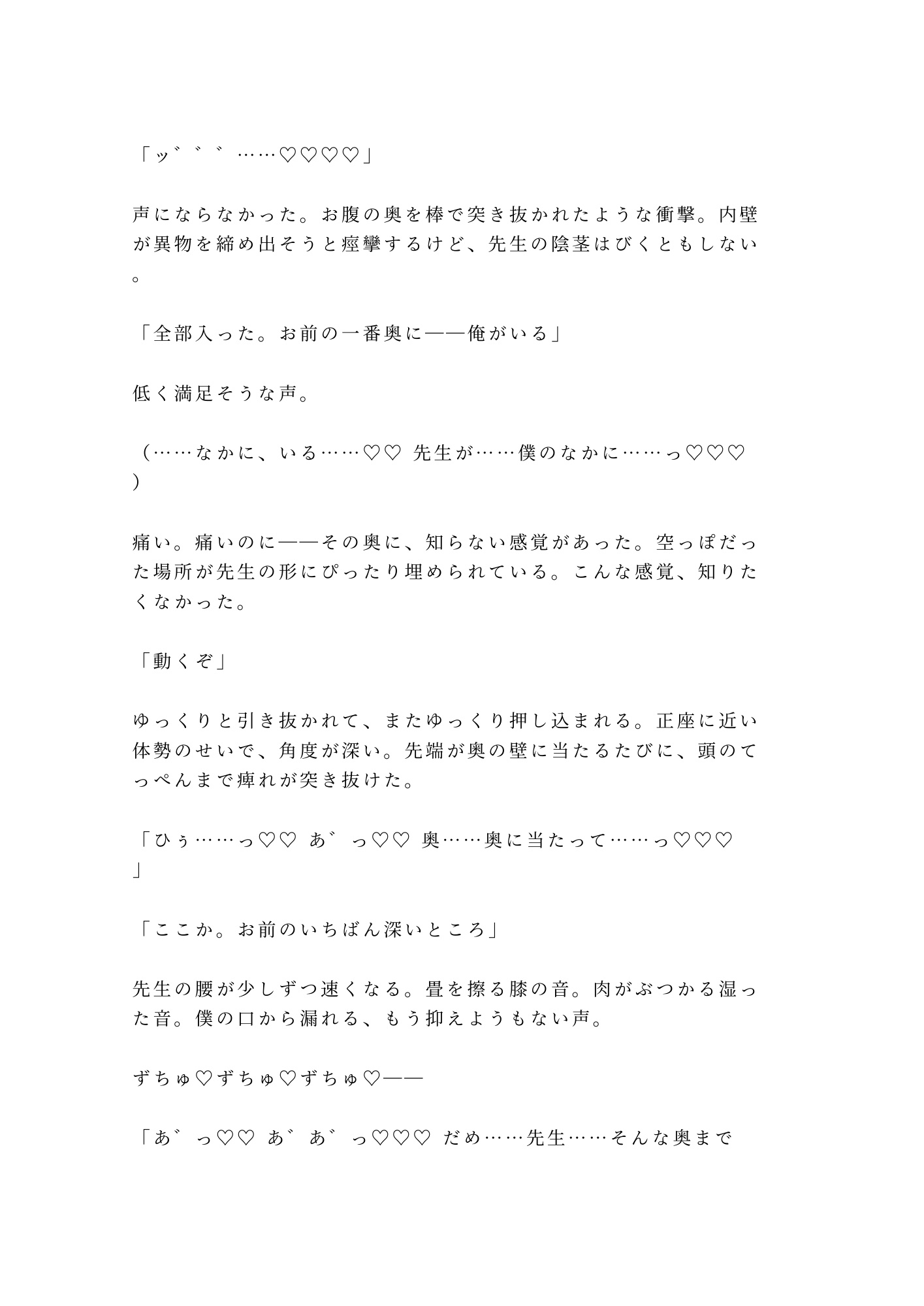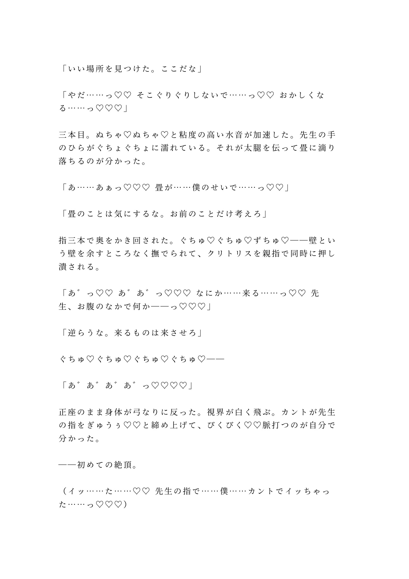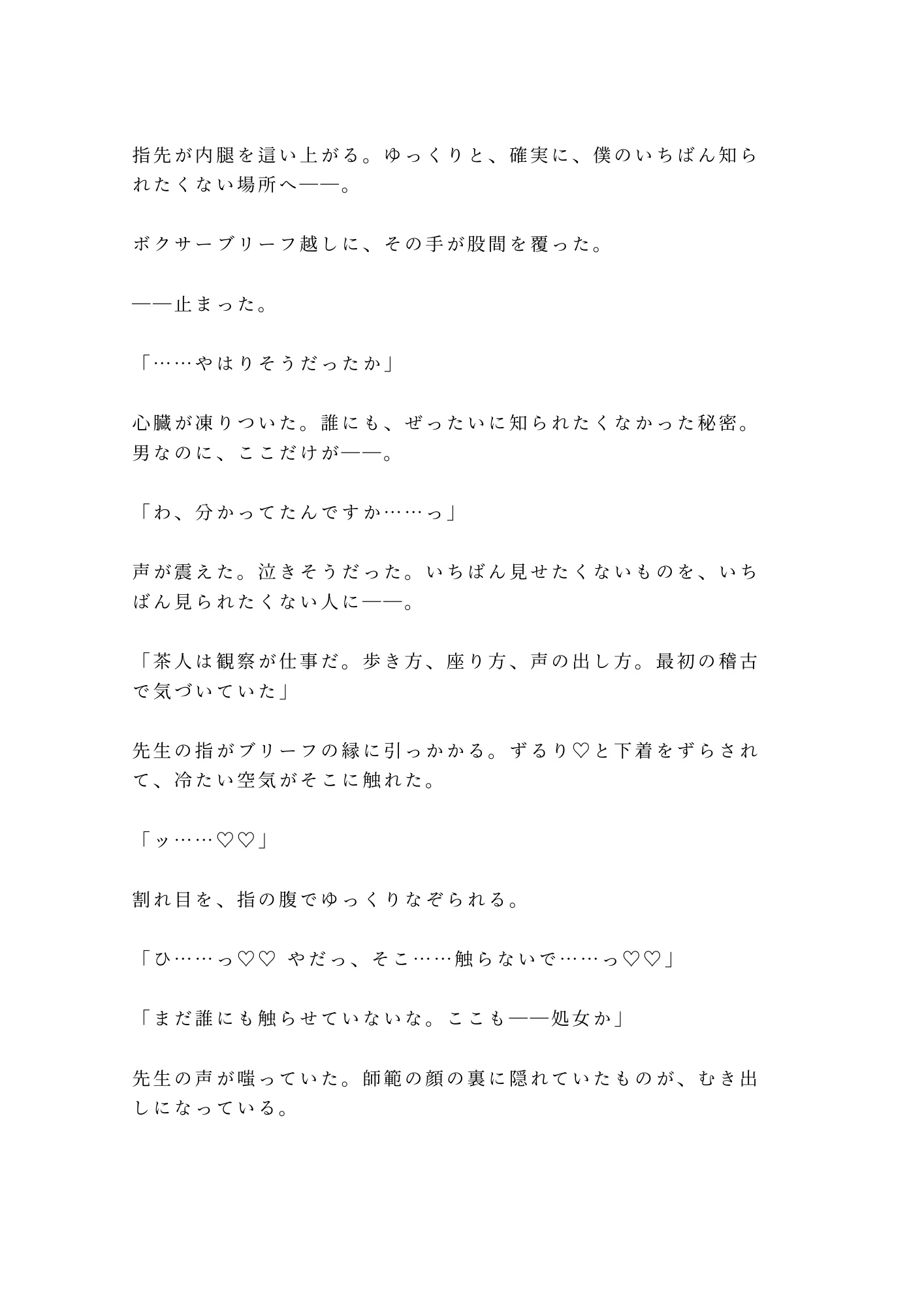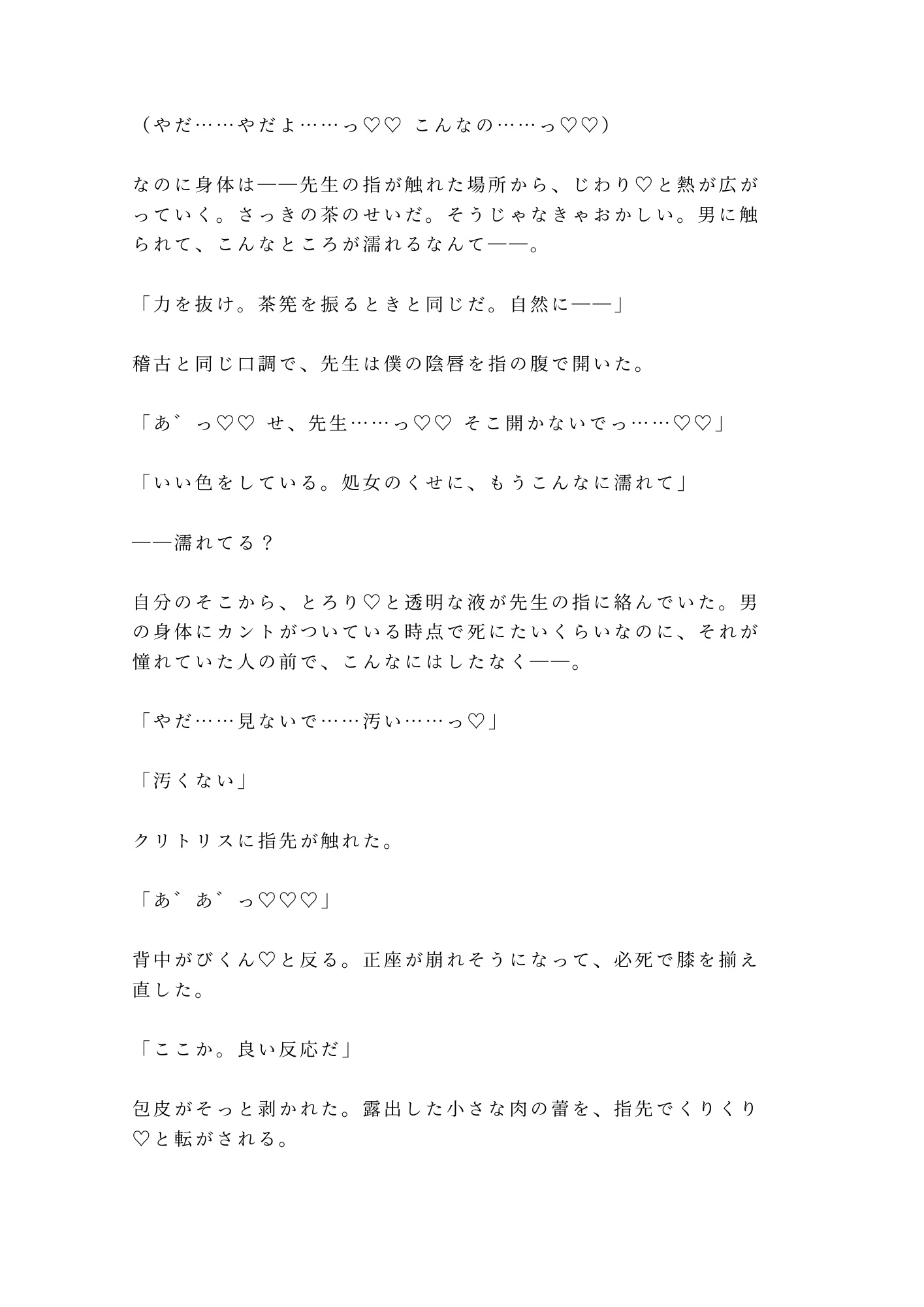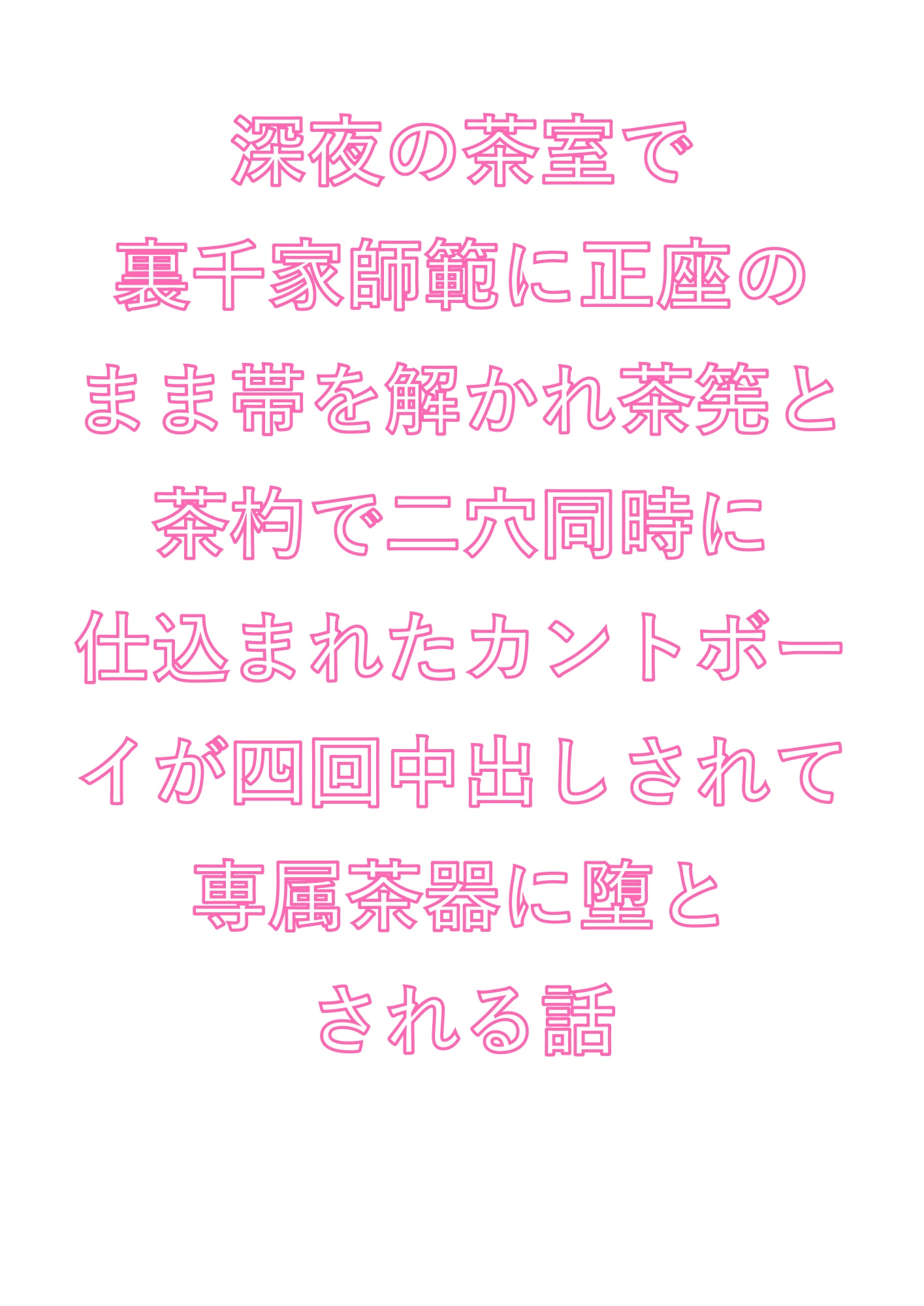 深夜の茶室、四畳半の密室。憧れの裏千家師範・霧島先生に正座のまま帯を解かれた僕の秘密——男なのにカントがある身体が、白檀の香りの中で暴かれていく。「これも稽古だ」と囁く先生の指が処女のそこを開き、茶筅と茶杓で二穴同時に仕込まれ、四回の中出しで理性ごと壊される。もう誰の茶器でもない。先生だけの、専属茶器に堕ちる夜。