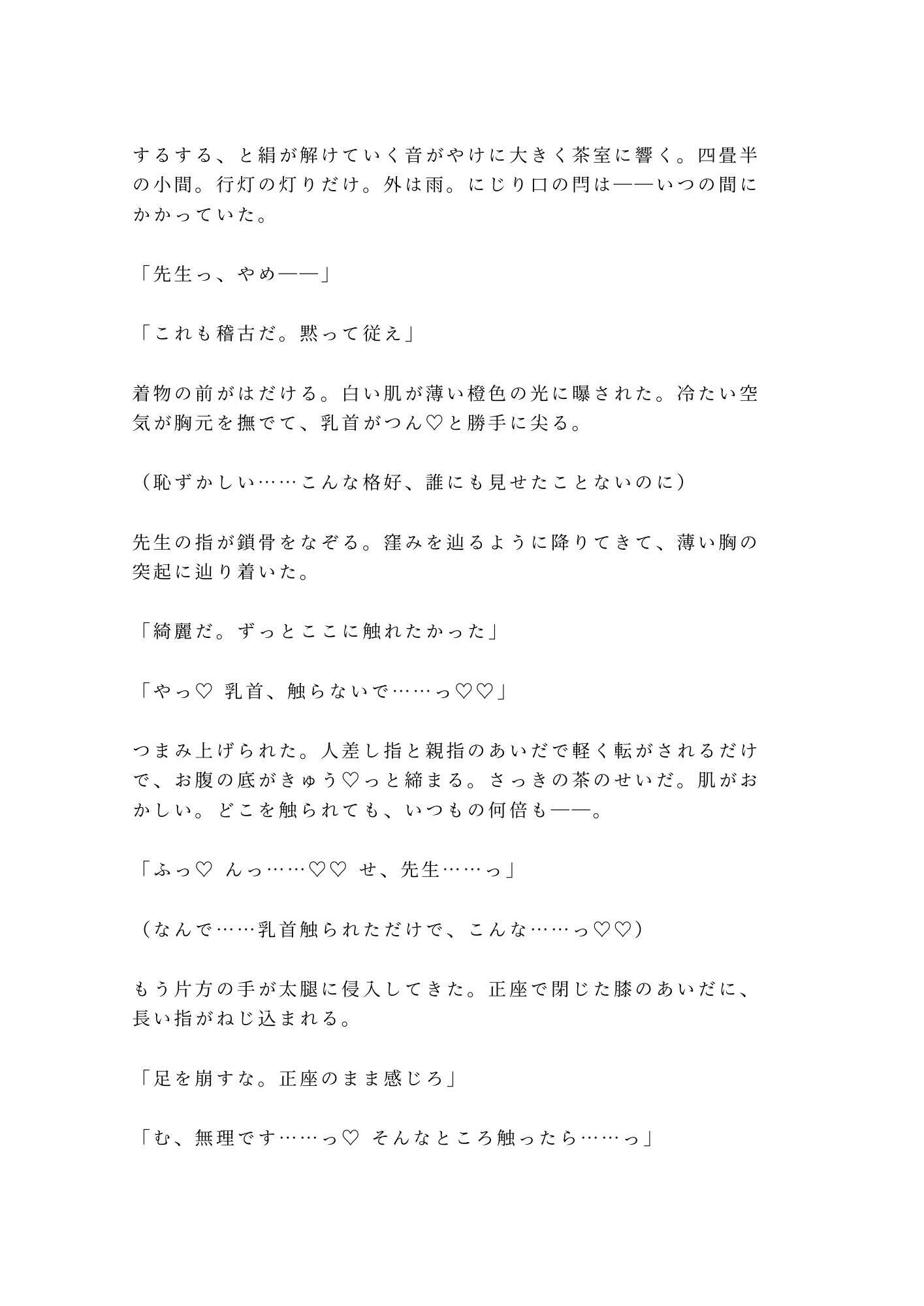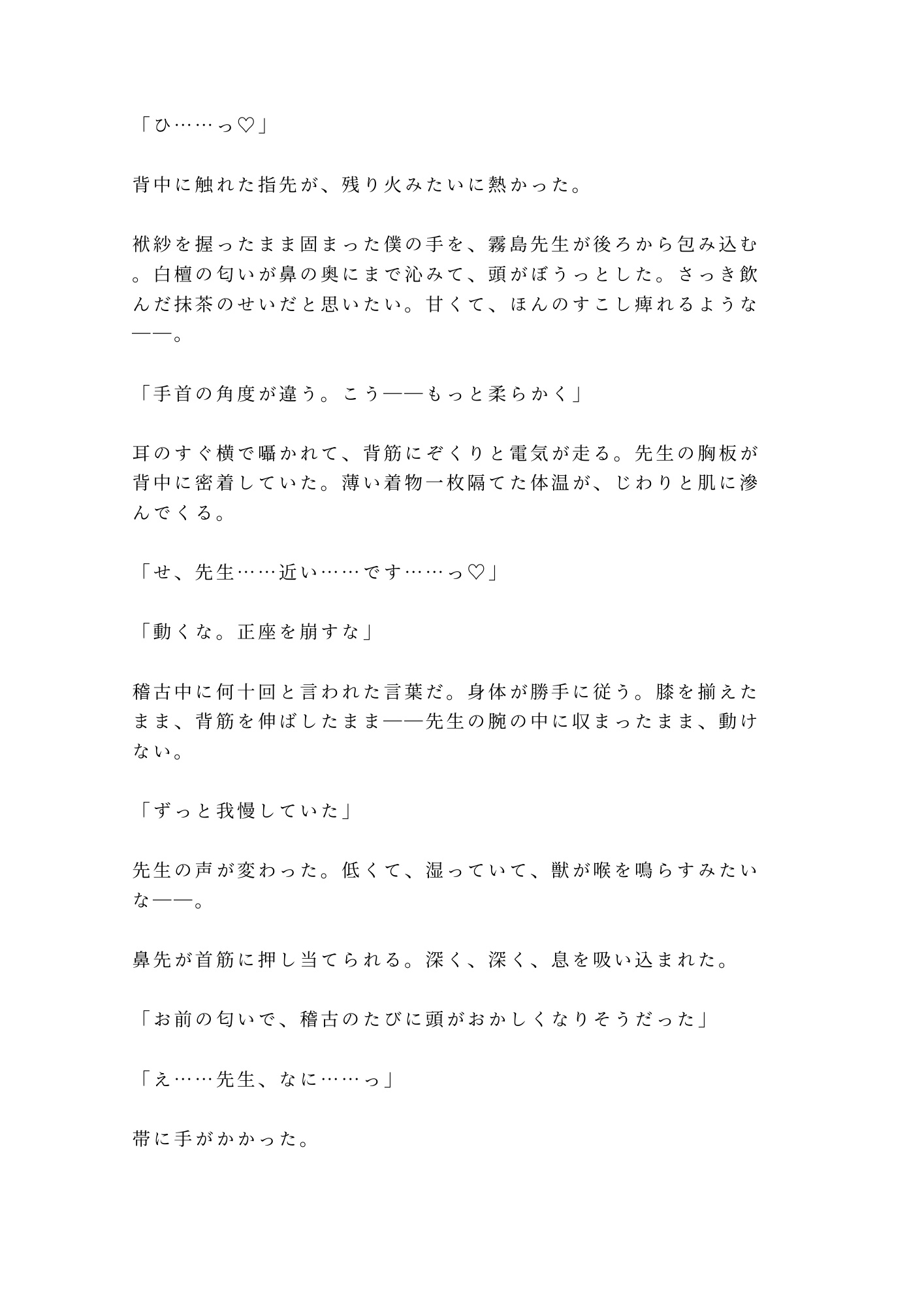 白檀の香り、畳に染みる体液、茶碗に注がれる精液を「お飲みなさい」と差し出す師範の冷たい微笑。和の静謐と獣じみた性愛が同居する、他では読めない異色のシチュエーションBL。