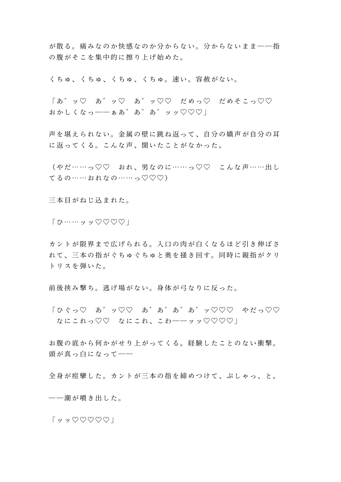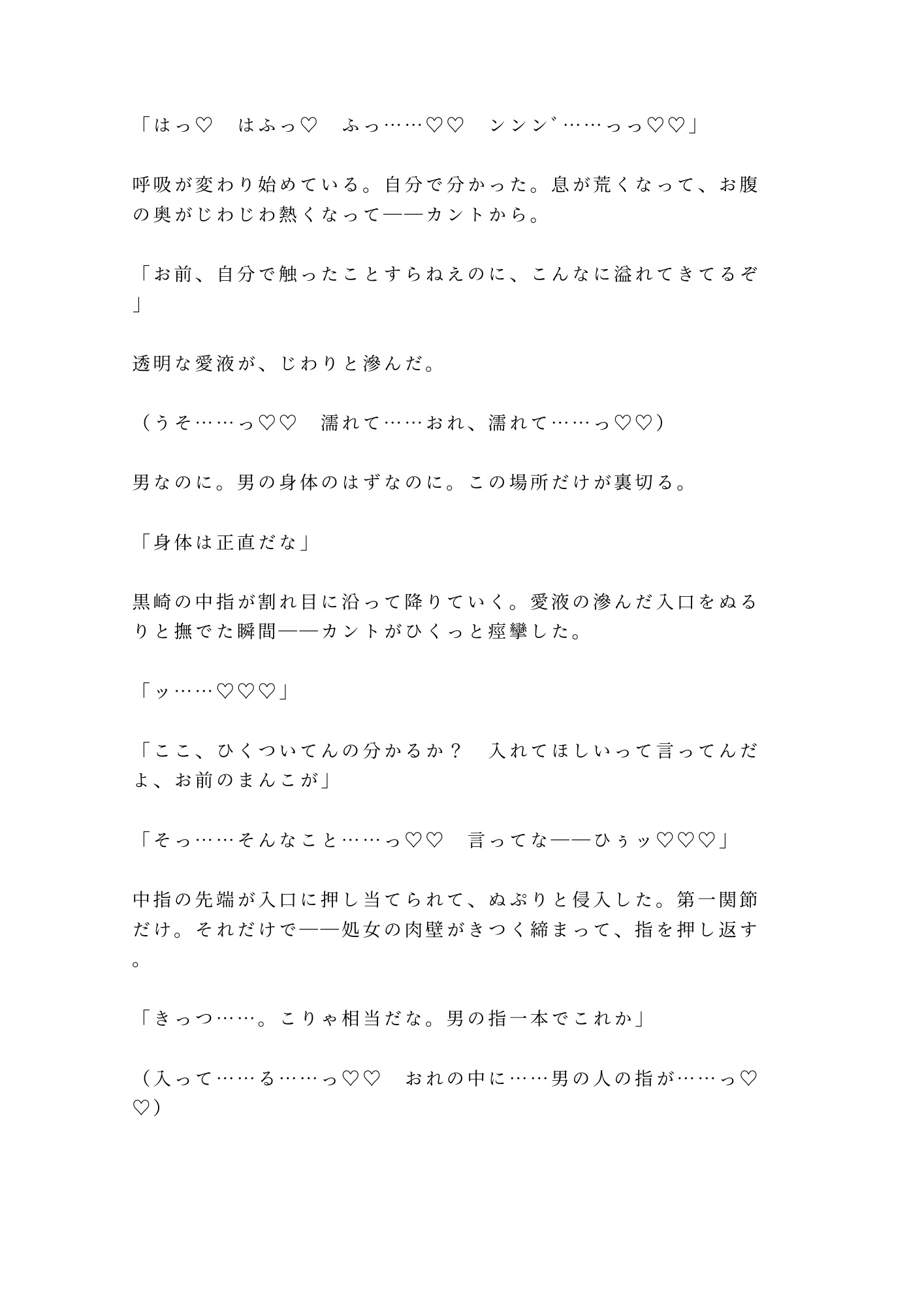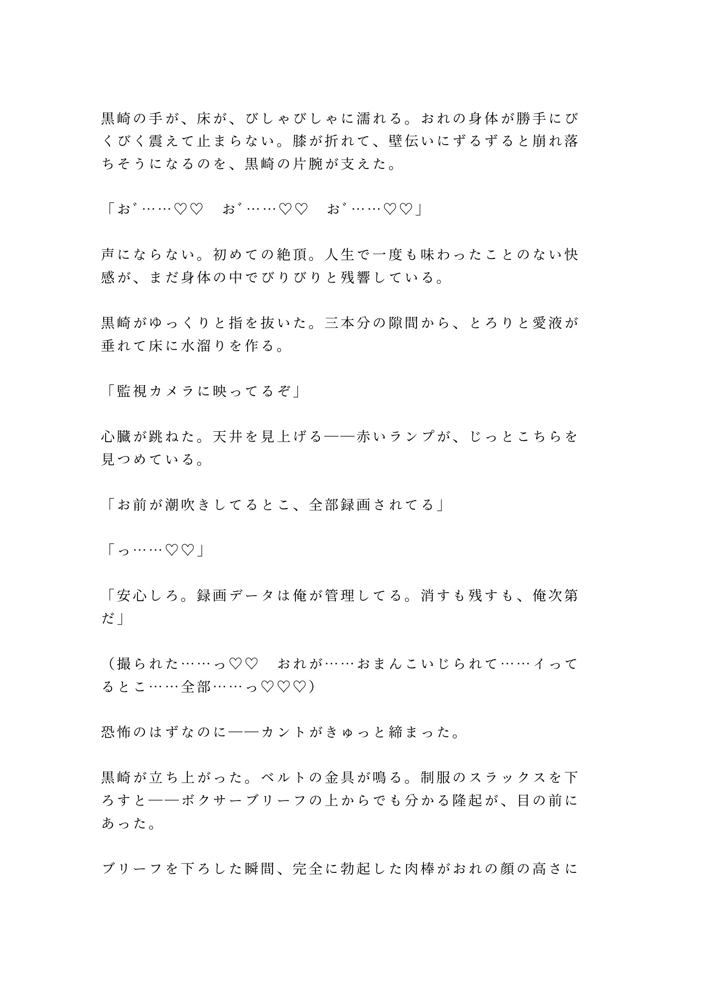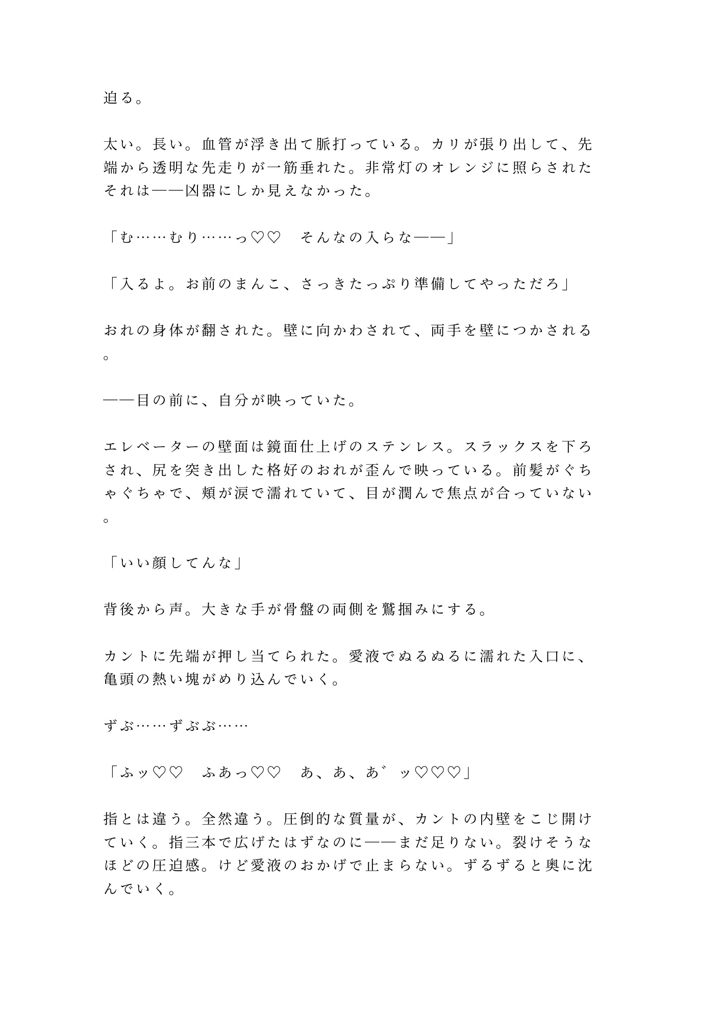 深夜のオフィスビル、突然の停電。閉じ込められたエレベーターの中、逃げ場はない。元機動隊の夜間警備員・黒崎は、IT営業の透がひた隠しにしてきた秘密——カントボーイであることを既に見抜いていた。「確認させろ」。監視カメラの赤いランプが見下ろす密室で、二十四年間誰にも触れさせなかった身体が暴かれていく。処女のカントに指をねじ込まれ、初めての快楽に理性が砕ける。復旧までの二時間、四回の中出しで完堕ちする密室凌○BL