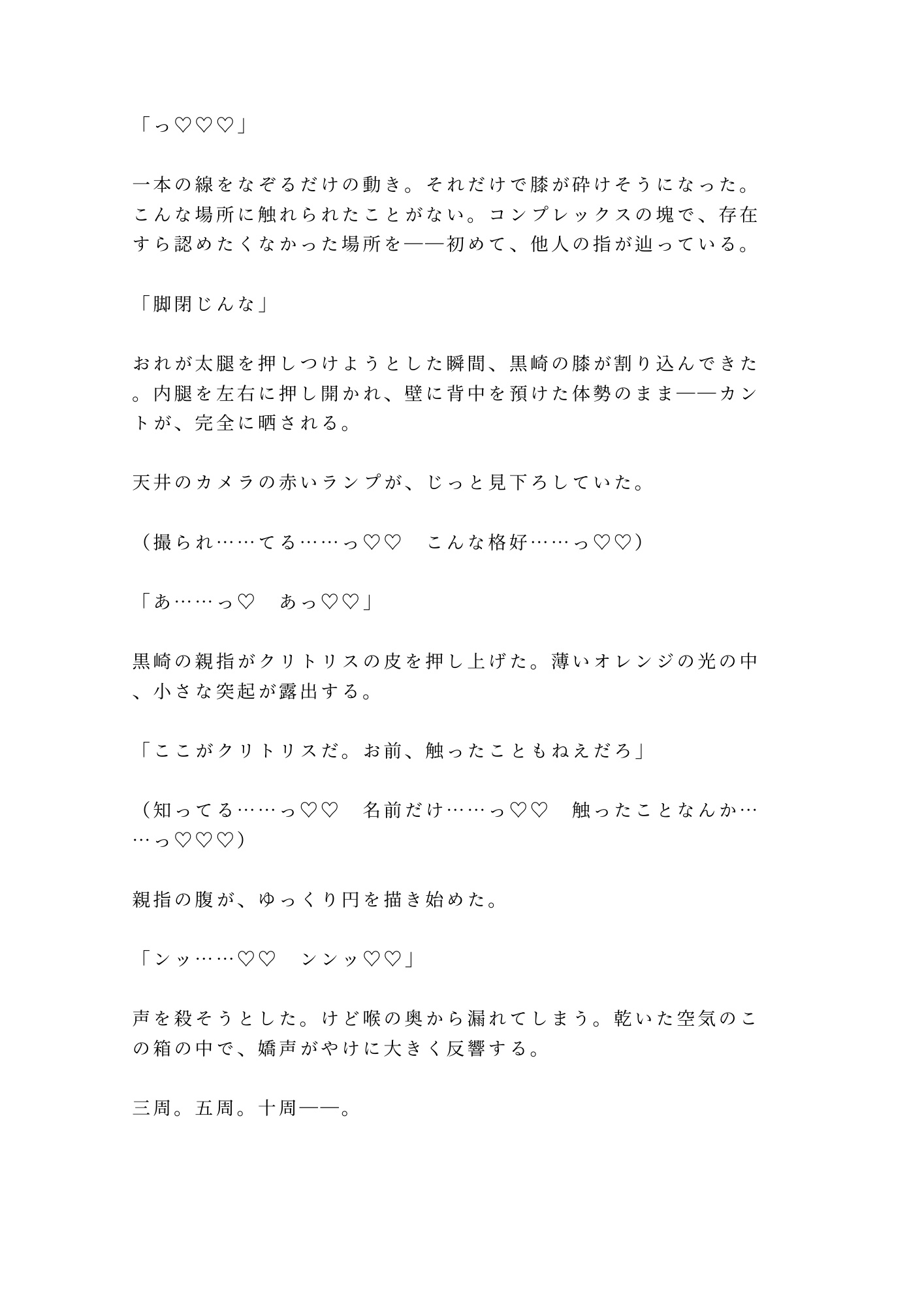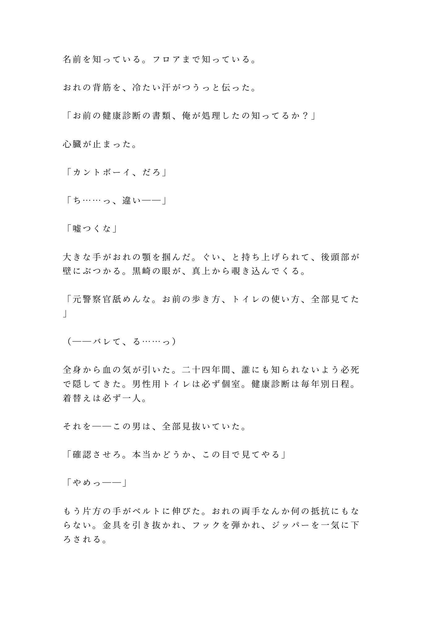 「カントボーイ、だろ」——健康診断の書類、トイレの使い方、歩き方。元警察官の観察眼は、透が二十四年間必死に隠し続けてきた身体の秘密をとうに見抜いていた。非常灯のオレンジだけが照らす密室で、天井の監視カメラの赤いランプが静かに点灯し続ける中、透の最後の砦が剥がされていく。