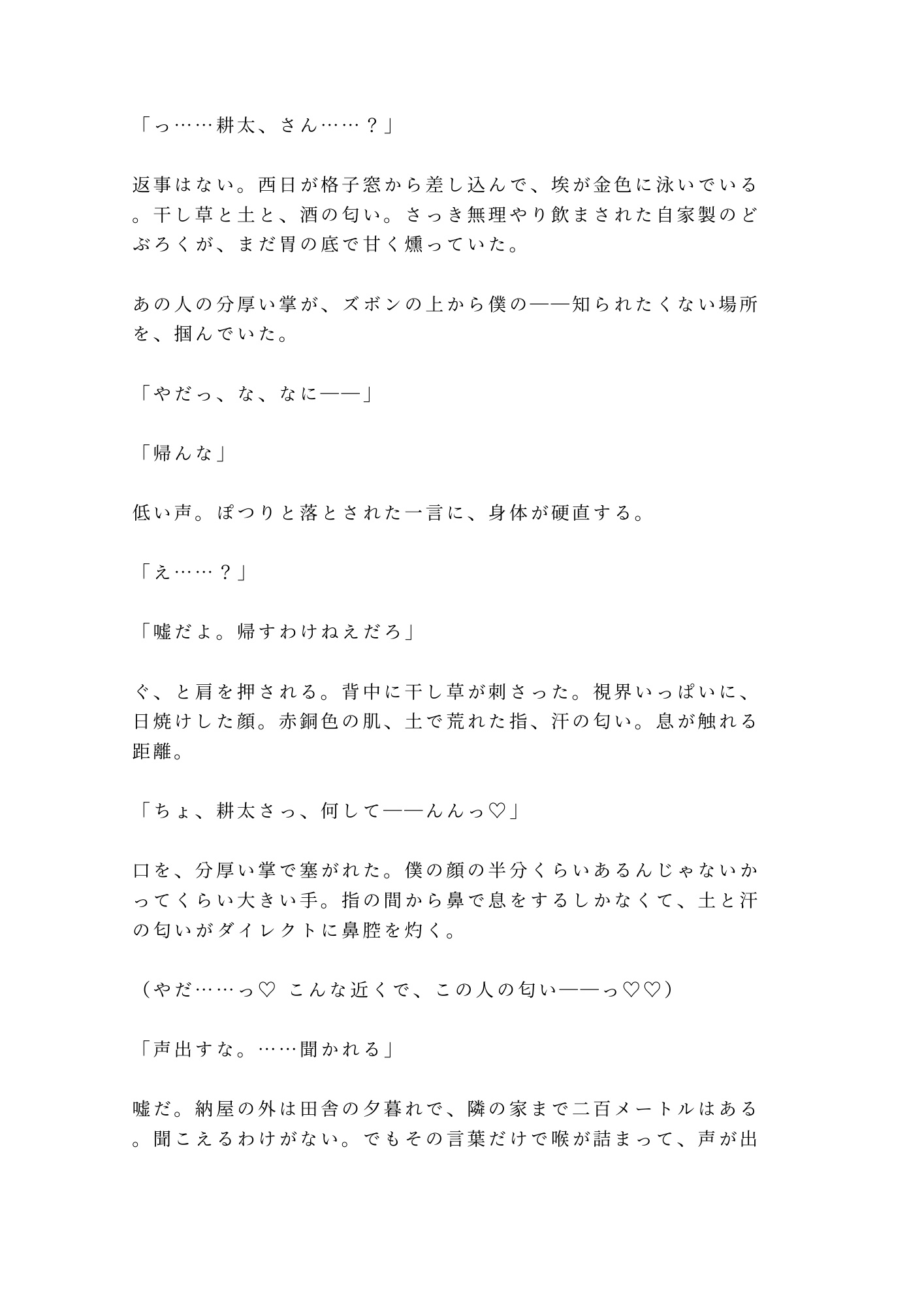 最終日の夕暮れ。「帰んな」と言われて振り向いた瞬間、「嘘だよ。帰すわけねえだろ」。干し草の上に押し倒されて、逃げ場を奪われた。