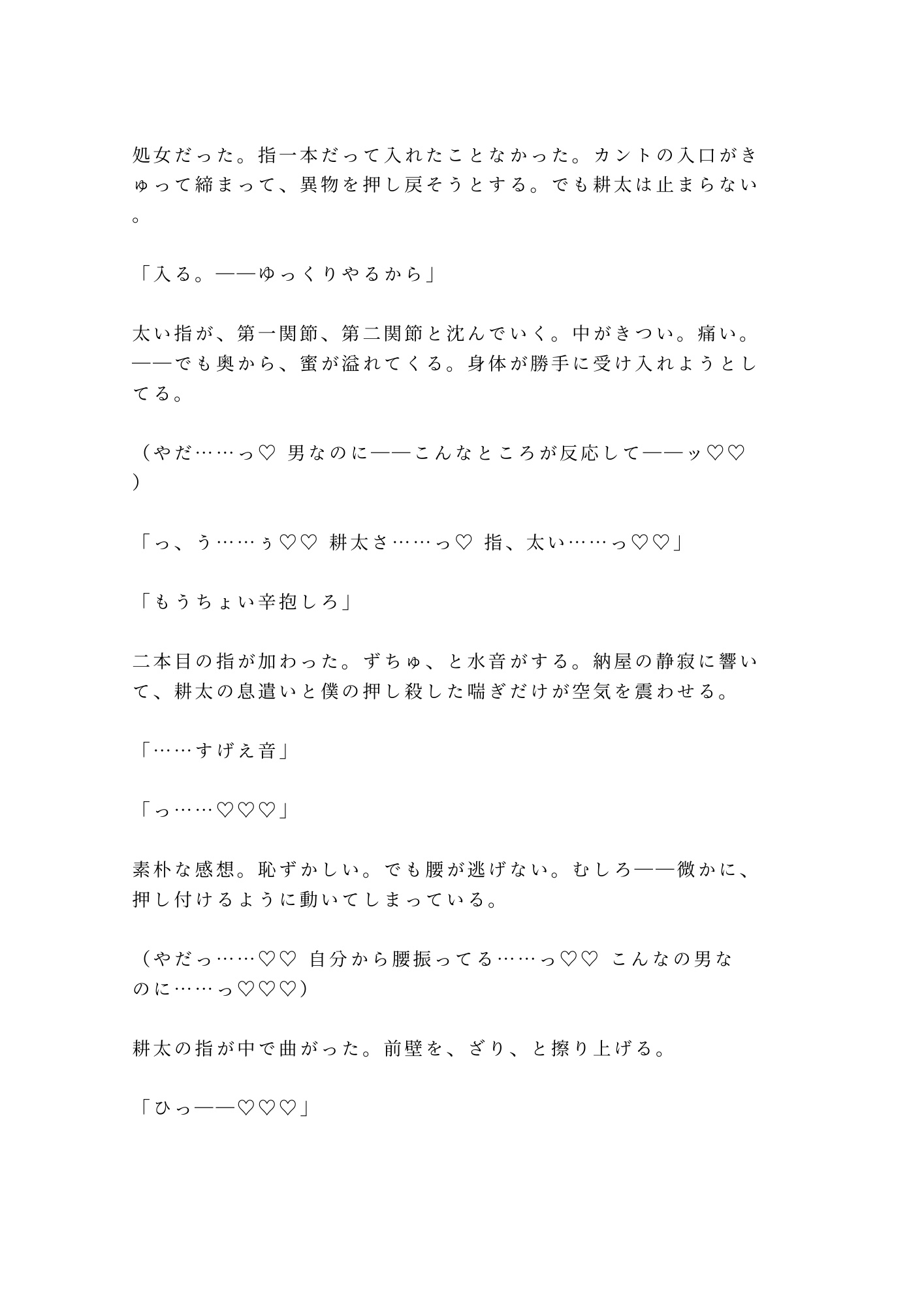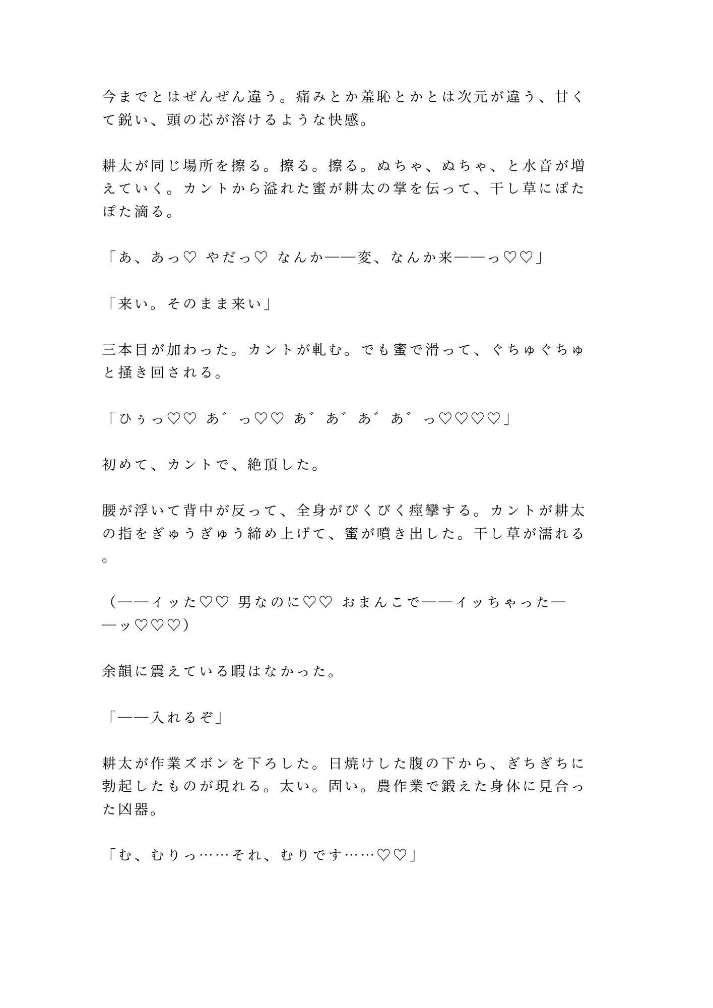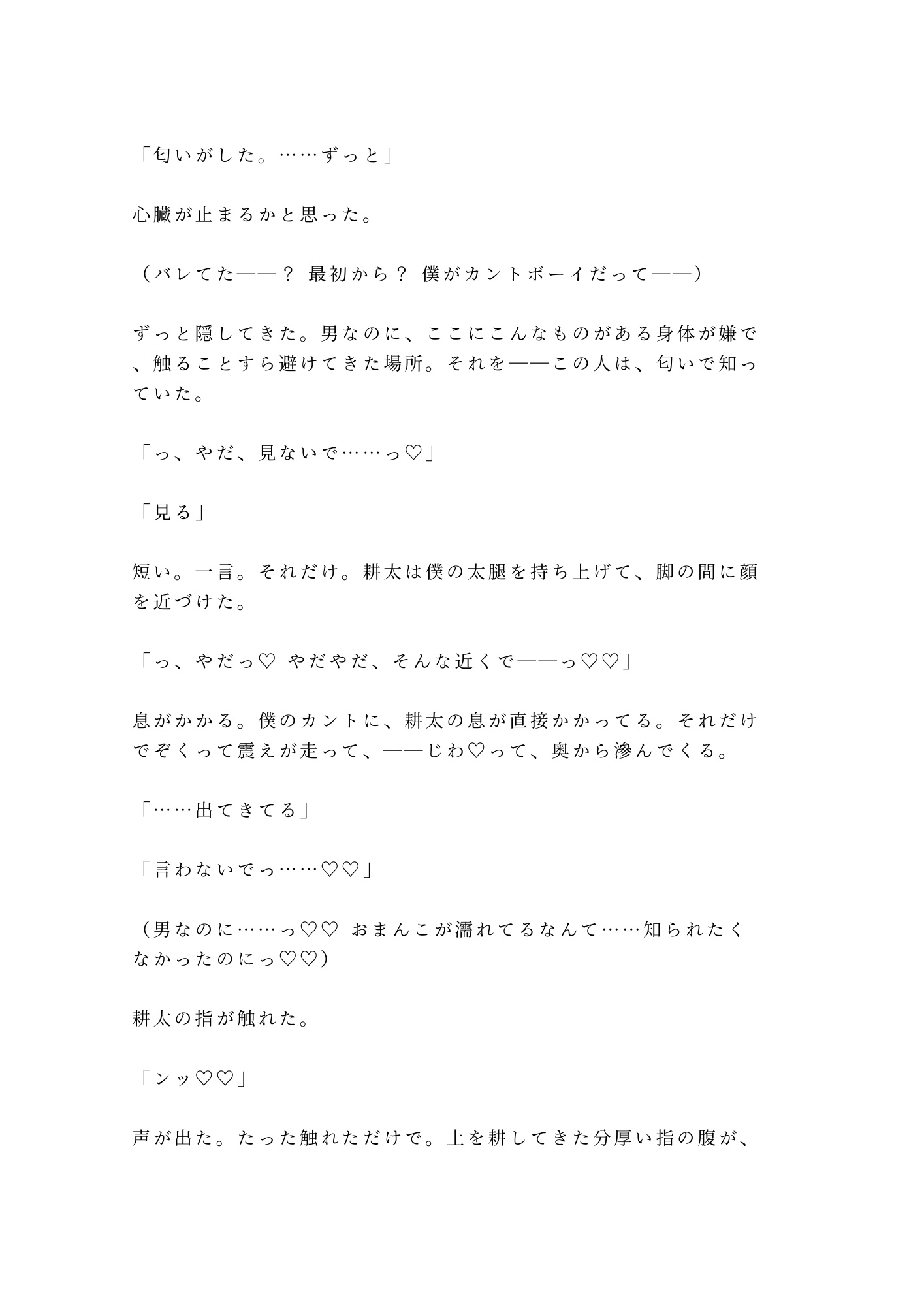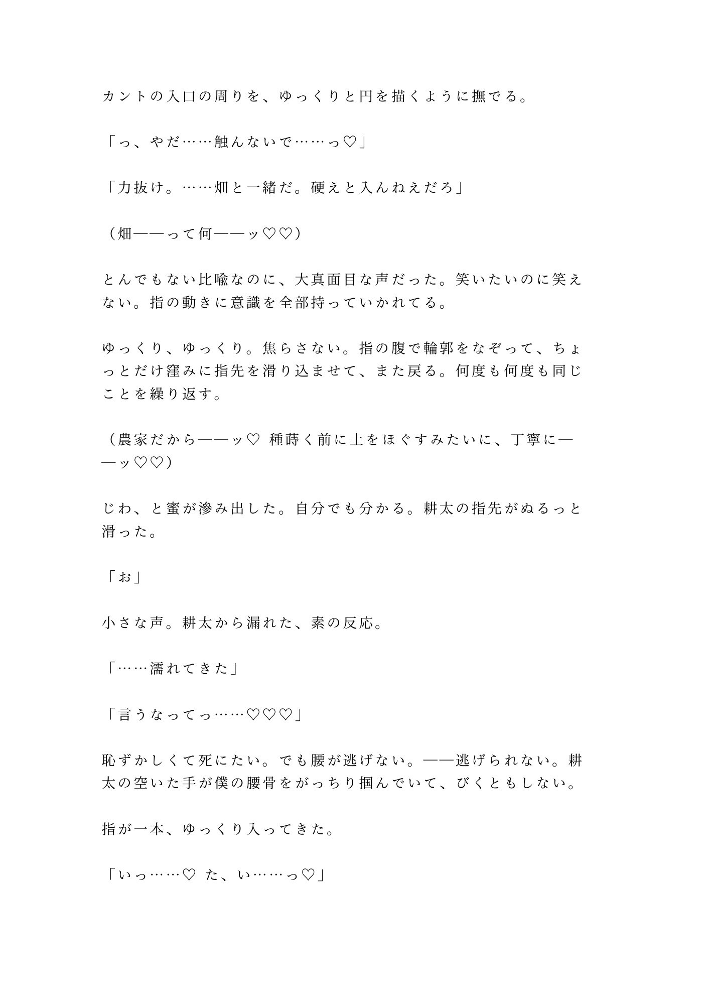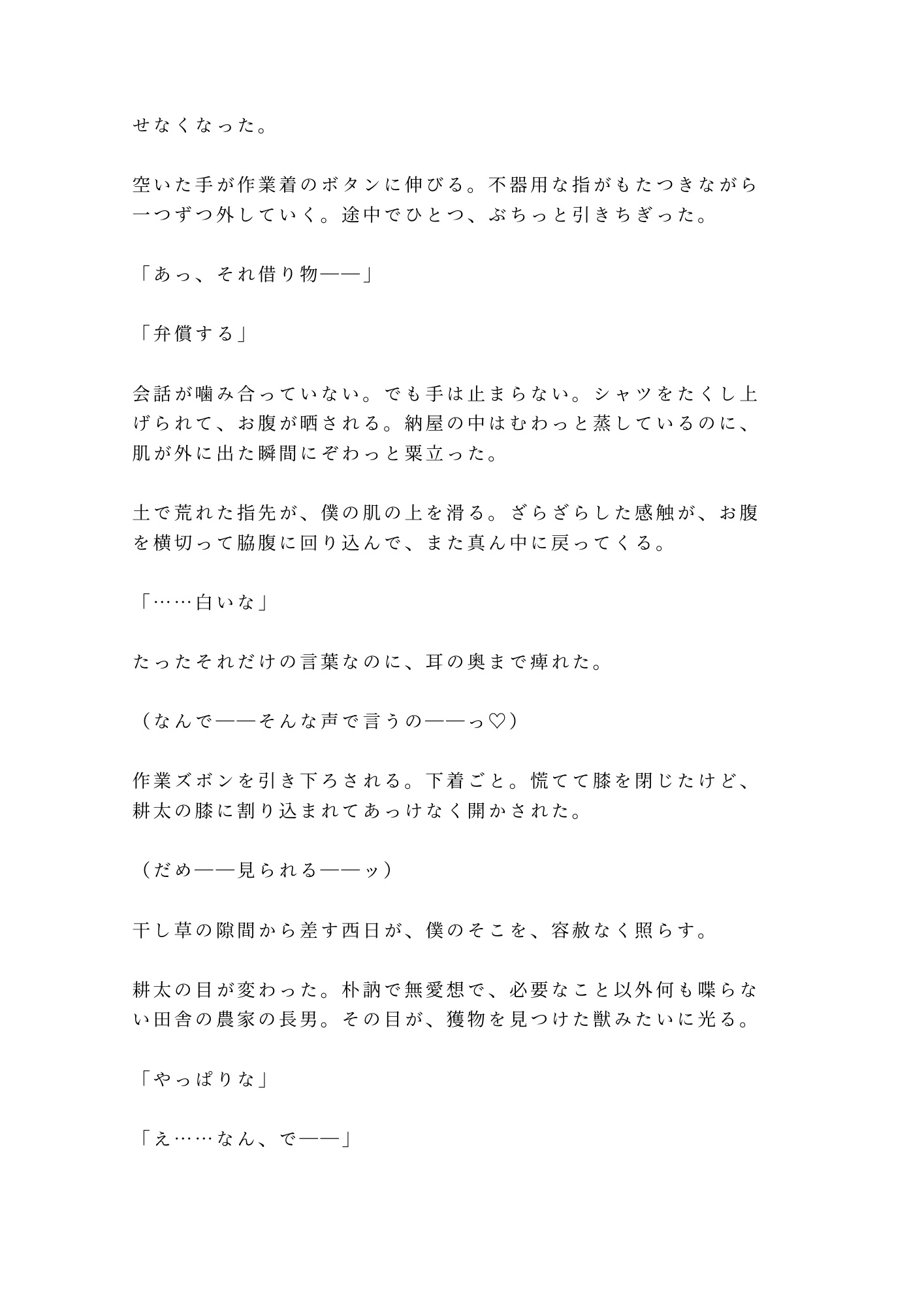 BL / カントボーイ / 処女喪失 / 中出し / 種付け / 複数回戦 / 二穴 / 農家×大学生 / 年上攻め / 体格差 / 田舎 / 執着攻め / 堕ち