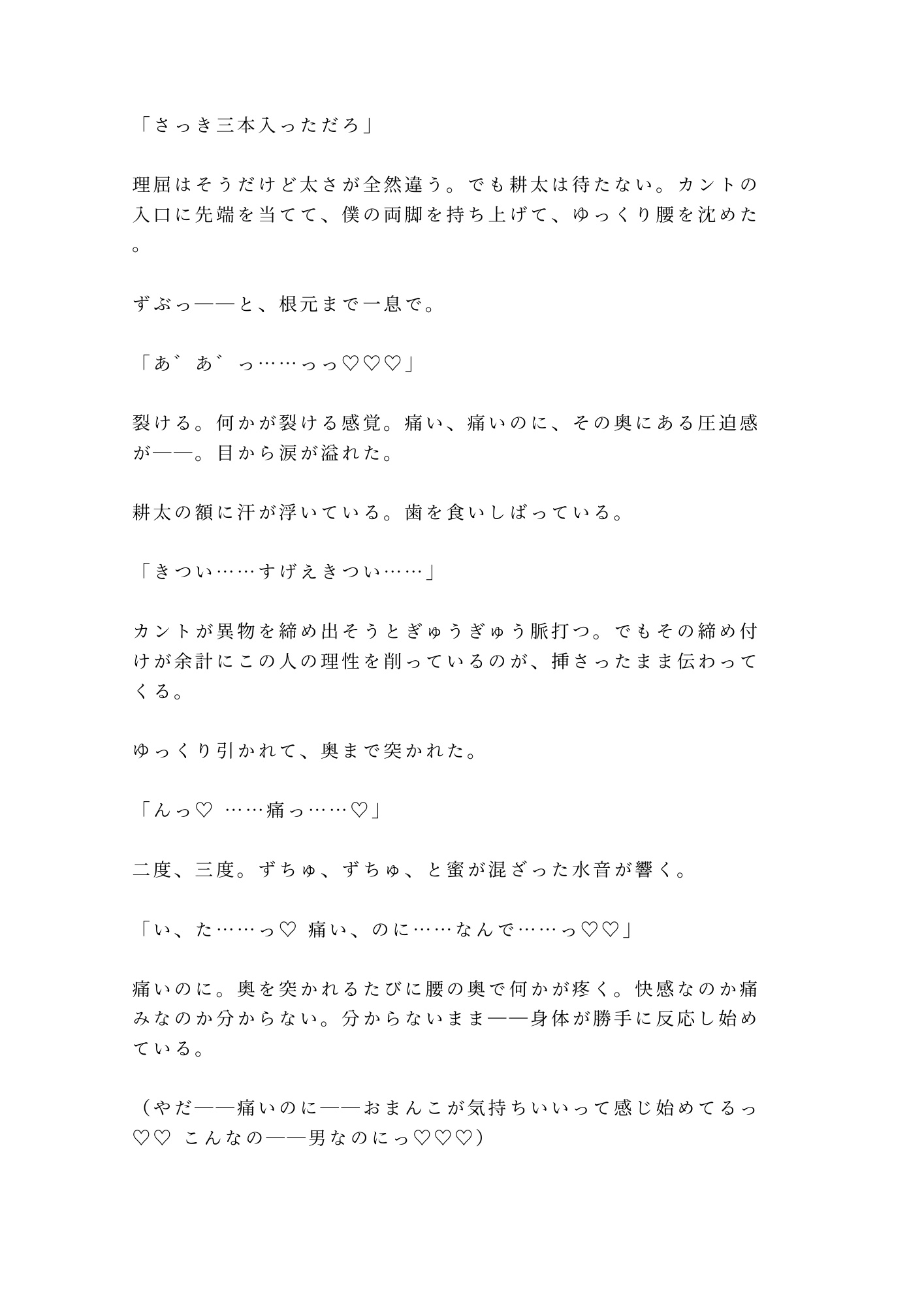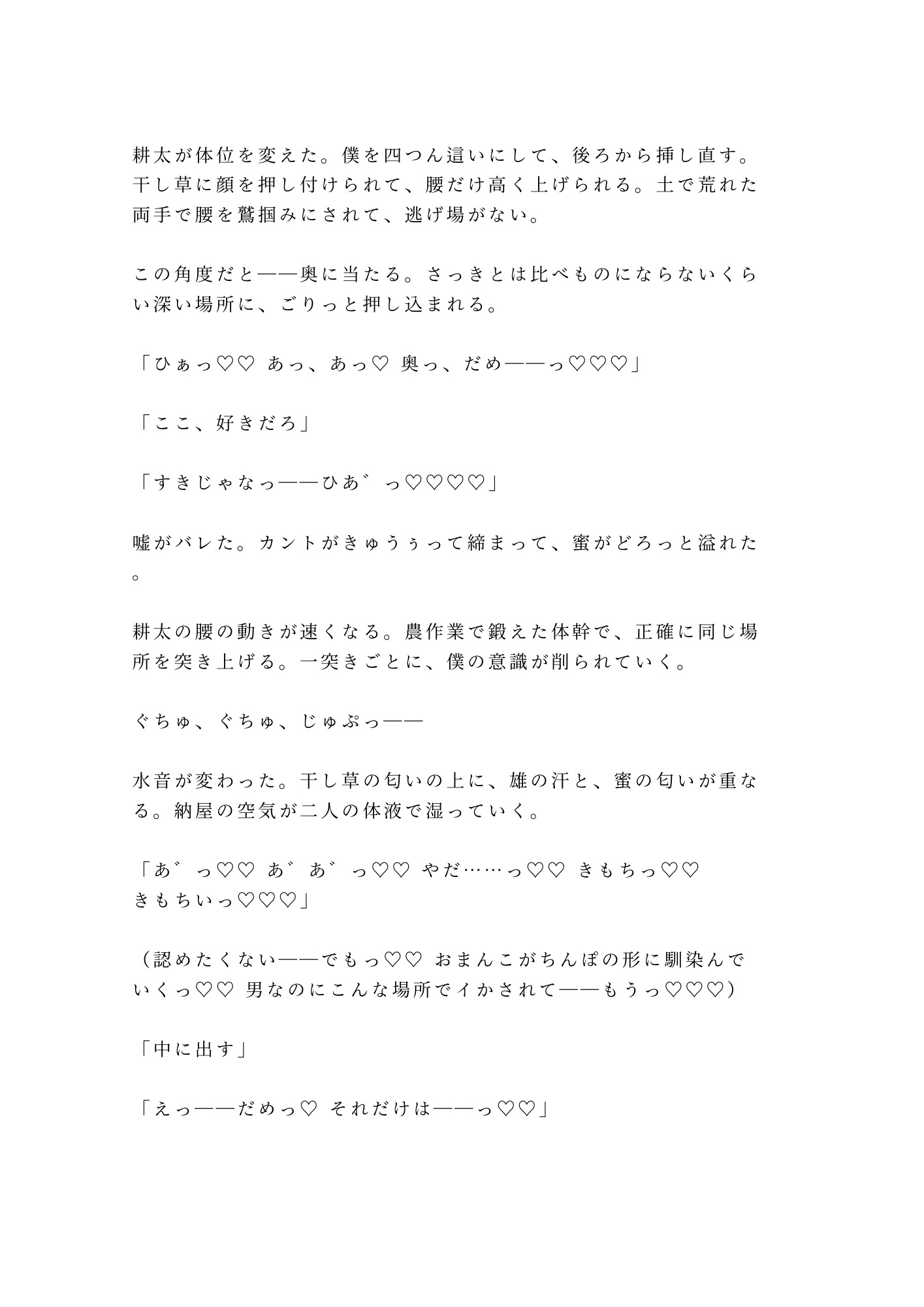 農業体験で田舎にやってきた都会っ子大学生の瑞希には、誰にも言えない秘密がある。男なのに”そこ”がある身体——。寡黙な農家の長男・耕太にその秘密を匂いで見抜かれ、納屋の干し草の上で処女を奪われる。土を耕す指で丁寧にほぐされ、自家製どぶろくで蕩かされ、抵抗する理性ごと犯し尽くされる一夜。「帰んな」「嘘だよ。帰すわけねえだろ」——朝まで五回、一滴残らず中に注がれて、もう帰れない身体にされる
