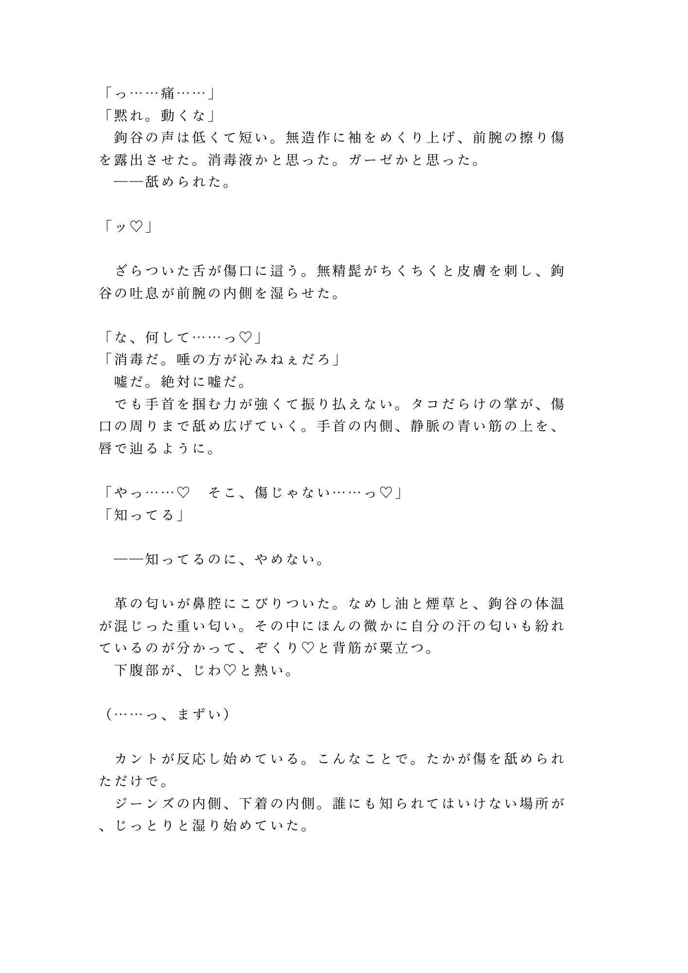 けれど鉤谷は傷を見るなり、消毒液ではなく舌で傷口を舐め、革紐で手首を仕立て台に縛りつけた。「暴れると縫い目が歪む。革も傷も同じだ——固定が先」。有無を言わせない職人の手つきに、抵抗する暇もない。