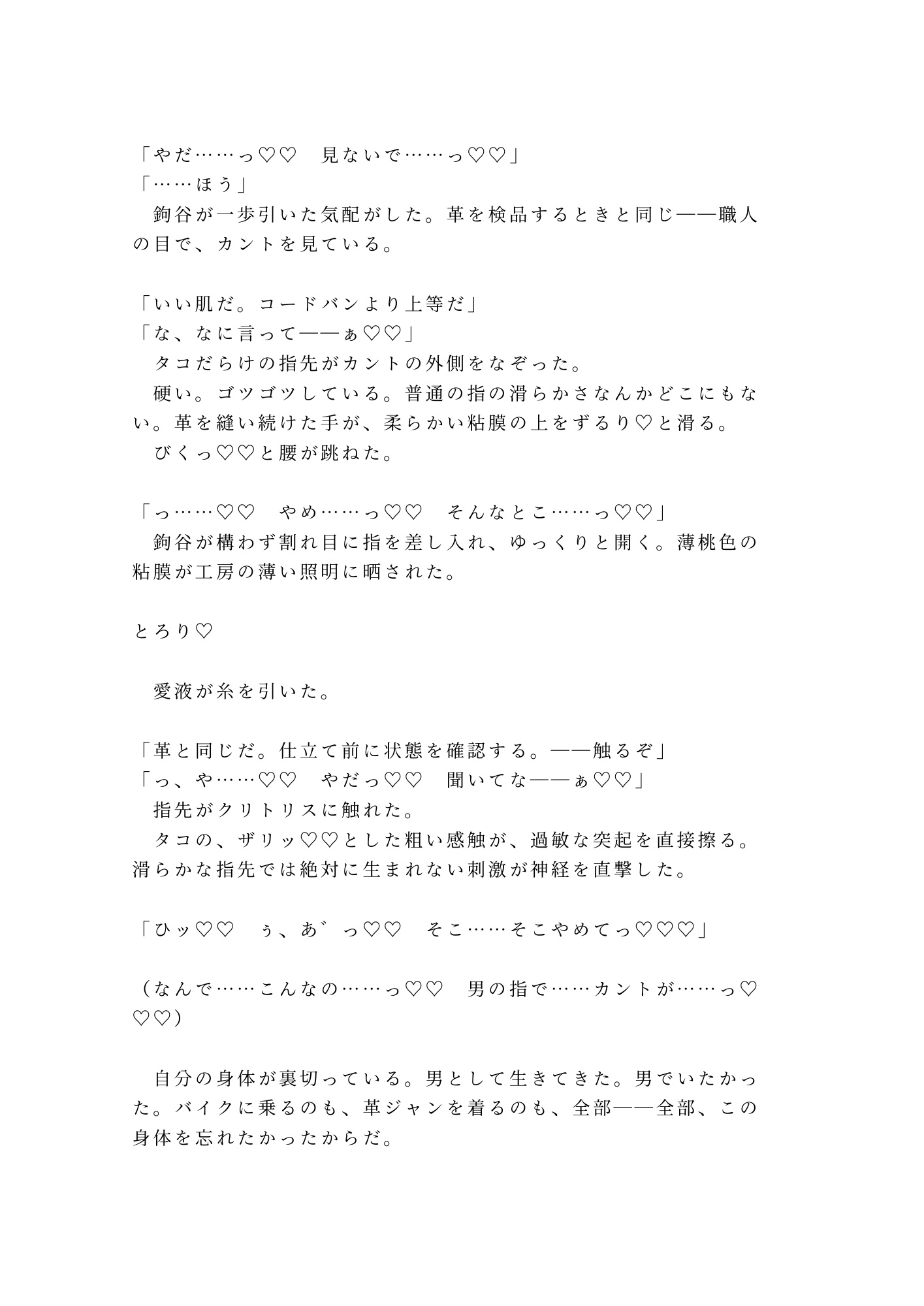 深夜の革工房。バイク事故の傷を見せに来ただけだった。なのに無骨な革職人・鉤谷に手首を革紐で仕立て台に縛りつけられ、「検品」と称してカントを暴かれる。タコだらけの指が粘膜を探り、革を鑑定する舌が秘所を舐め上げる。「いい肌だ。コードバンより上等だ」——職人の手仕事で、身体の奥まで”一点モノ”に仕上げられていく。革の匂いに溺れる、過激カントボーイBL