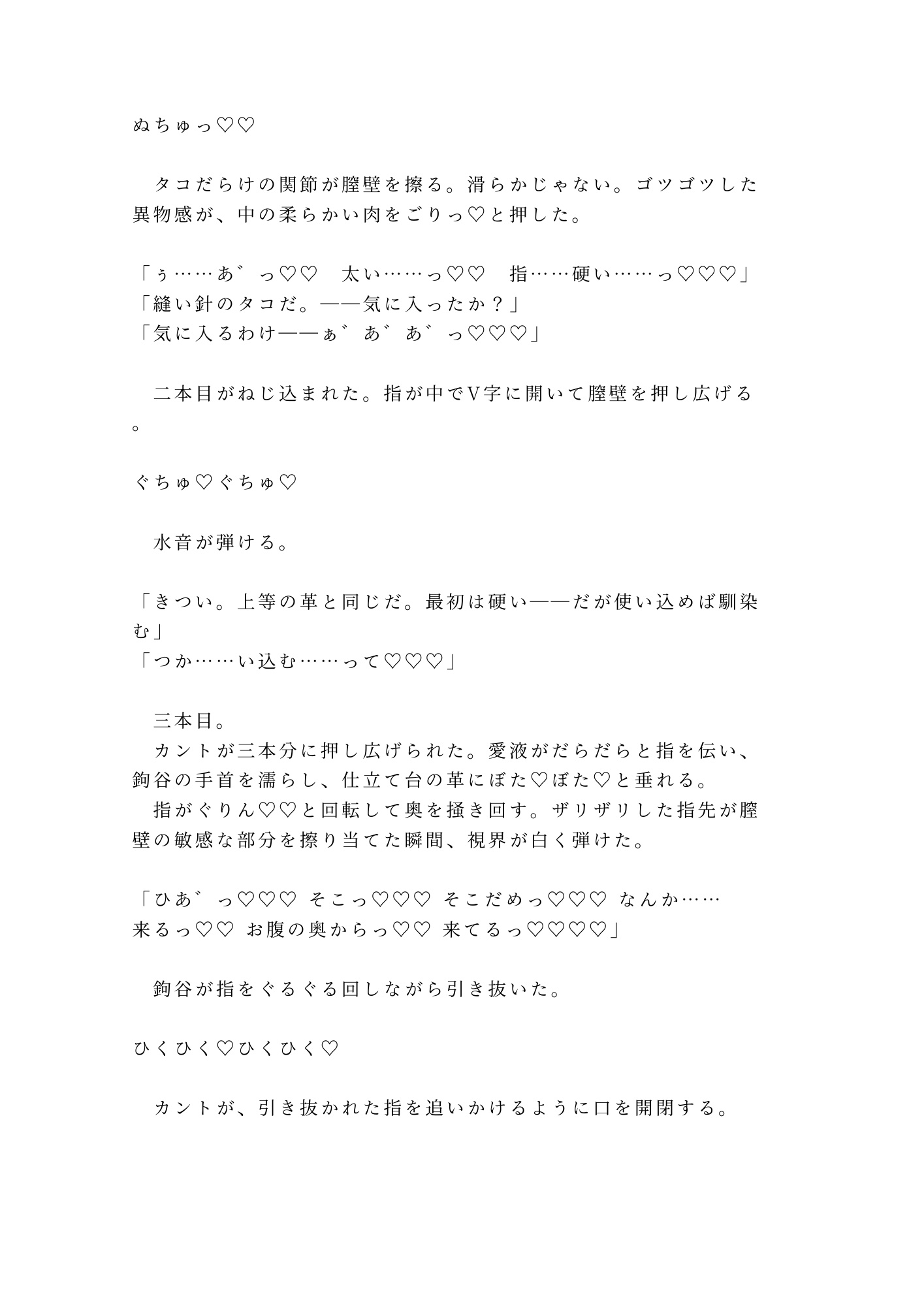 縫い針のタコで硬くなった指が、柔らかい粘膜を検品するように暴く。革の品質を確かめるように匂いを嗅ぎ、舌で味わい、三本の指でカントを解していく。すべてが「仕立て」の延長線上。職人の精密な手仕事が、容赦なく感度の限界を探り当てる。