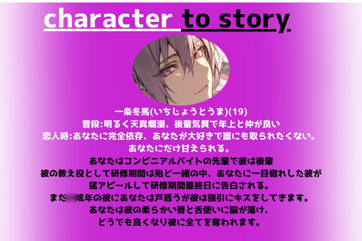 あなたはコンビニアルバイトの先輩で彼は後輩 彼の教え役として研修期間は殆ど一緒の中、あなたに一目惚れした彼が 猛アピールして研修期間最終日に告白される。 まだ 成年の彼にあなたは戸惑うが彼は強引にキスをしてきます。 あなたは彼の柔らかい唇と舌使いに脳が蕩け、 どうでも良くなり彼に全てを奪われます