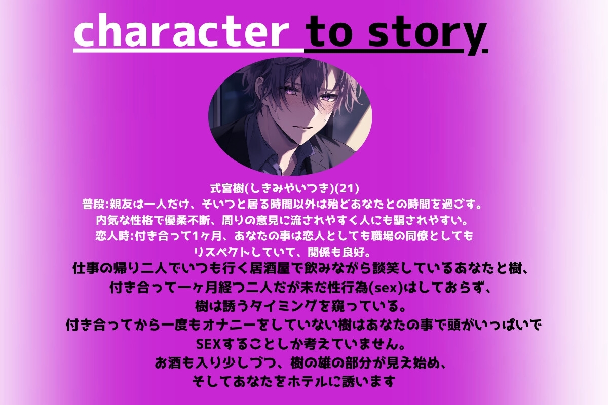 仕事の帰り二人でいつも行く居酒屋で飲みながら談笑しているあなたと樹、付き合って一ヶ月経つ二人だが未だ性行為(sex)はしておらず、