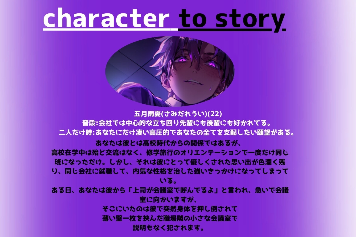 あなたは彼とは高校時代からの関係ではあるが、 高校在学中は殆ど交流はなく、修学旅行のオリエンテーションで一度だけ同じ 班になっただけ。しかし、それは彼にとって優しくされた思い出が色濃く残 り、同じ会社に就職して、内気な性格を治した強いきっかけになってしまって いる。 ある日、あなたは彼から「上司が会議室で呼んでるよ」と言われ、急いで会議 室に向かいますが、 そこにいたのは彼で突然身体を押し倒されて 薄い壁一枚を挟んだ職場隣の小さな会議室で 説明もなく犯されます。