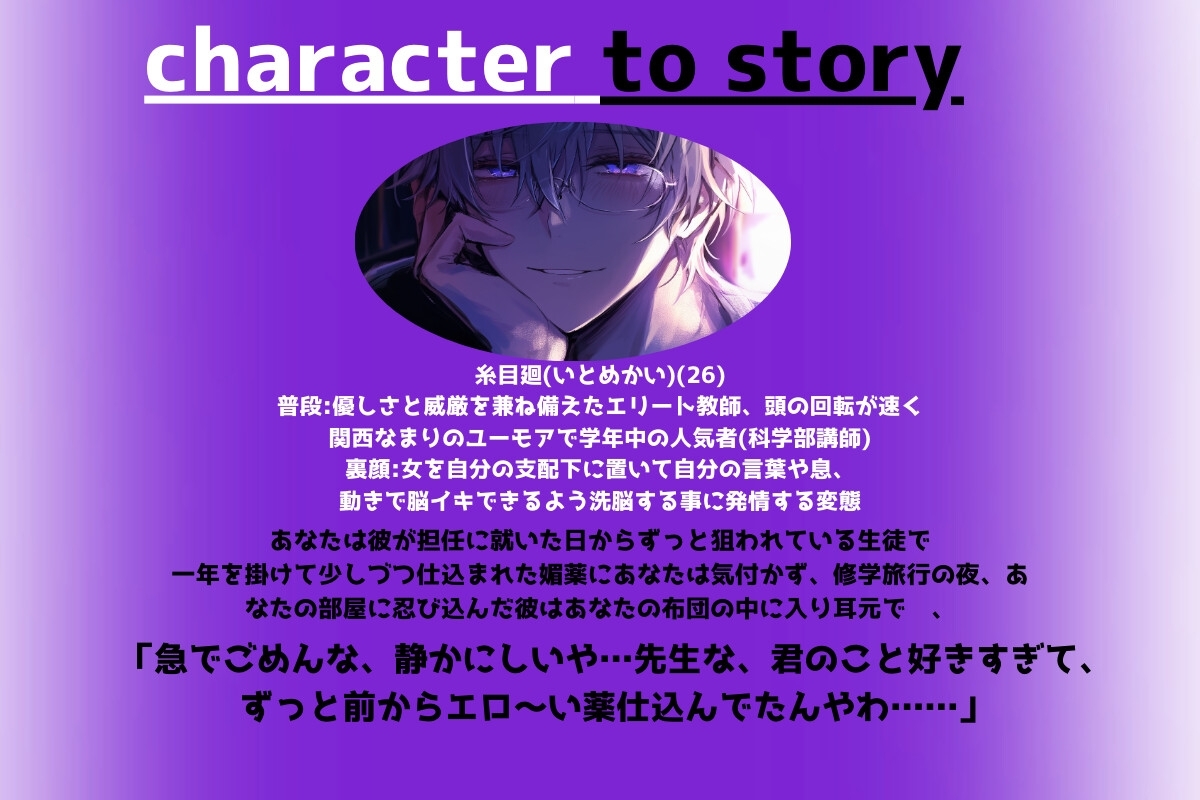 あなたは彼が担任に就いた日からずっと狙われている生徒で 一年を掛けて少しづつ仕込まれた媚薬にあなたは気付かず、修学旅行の夜、あ なたの部屋に忍び込んだ彼はあなたの布団の中に入り耳元で 「急でごめんな、静かにしいや…先生な、君のこと好きすぎて、 ずっと前からエロ〜い薬仕込んでたんやわ・・・.・」