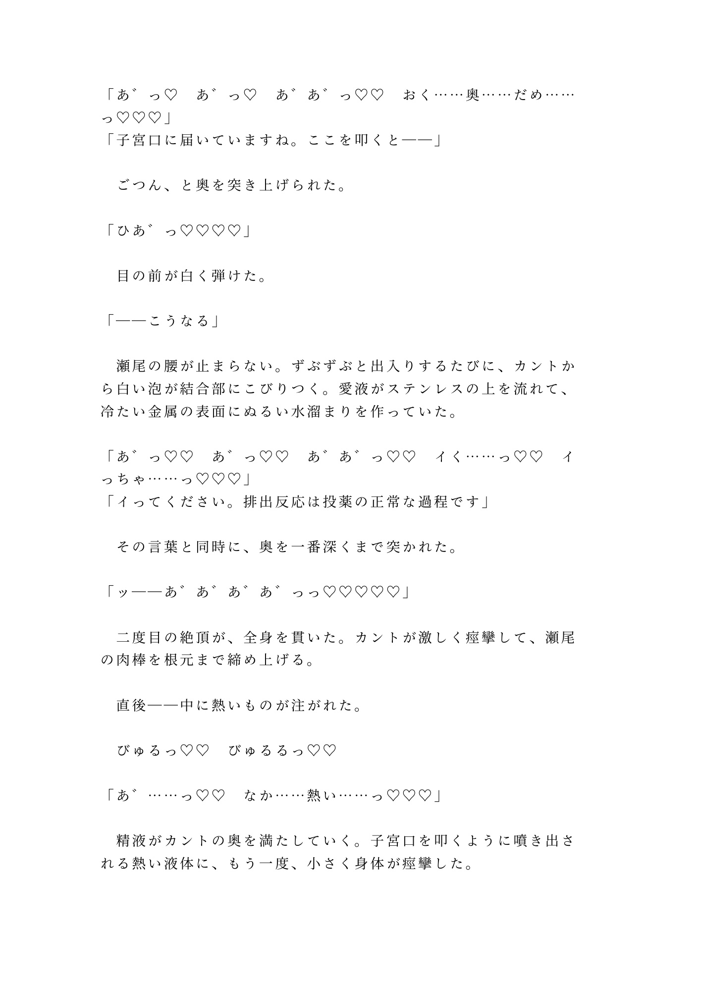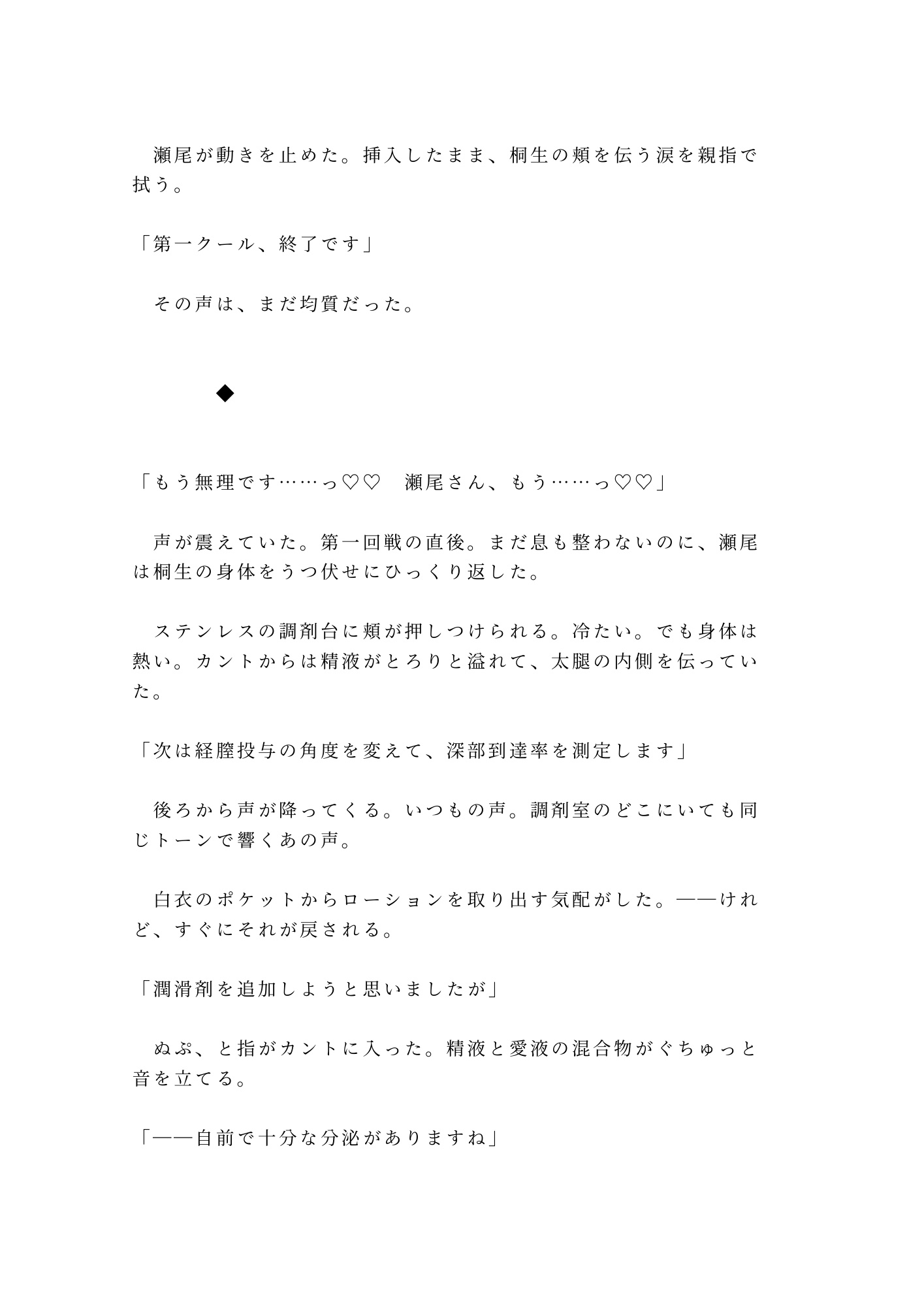 二十二年間「存在しないこと」にしてきたカントを暴かれ、指で、そして直接で何度も奥を突かれるたび、桐生の抵抗は甘い嬌声に塗り替えられていく。四回の「臨床試験」を経て、桐生の身体は完全に瀬尾の「処方」なしでは眠れなくなる——毎晩通院する身体の完成である。