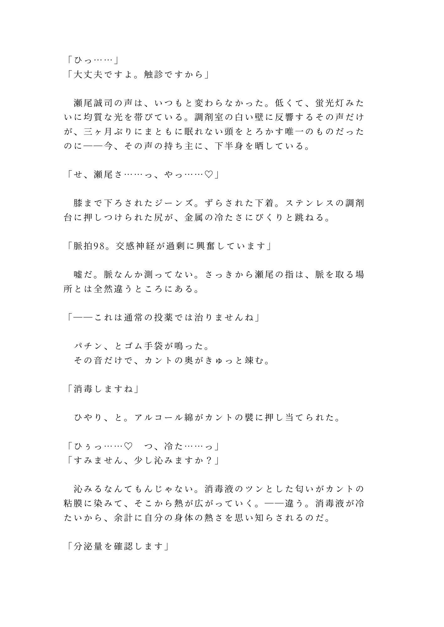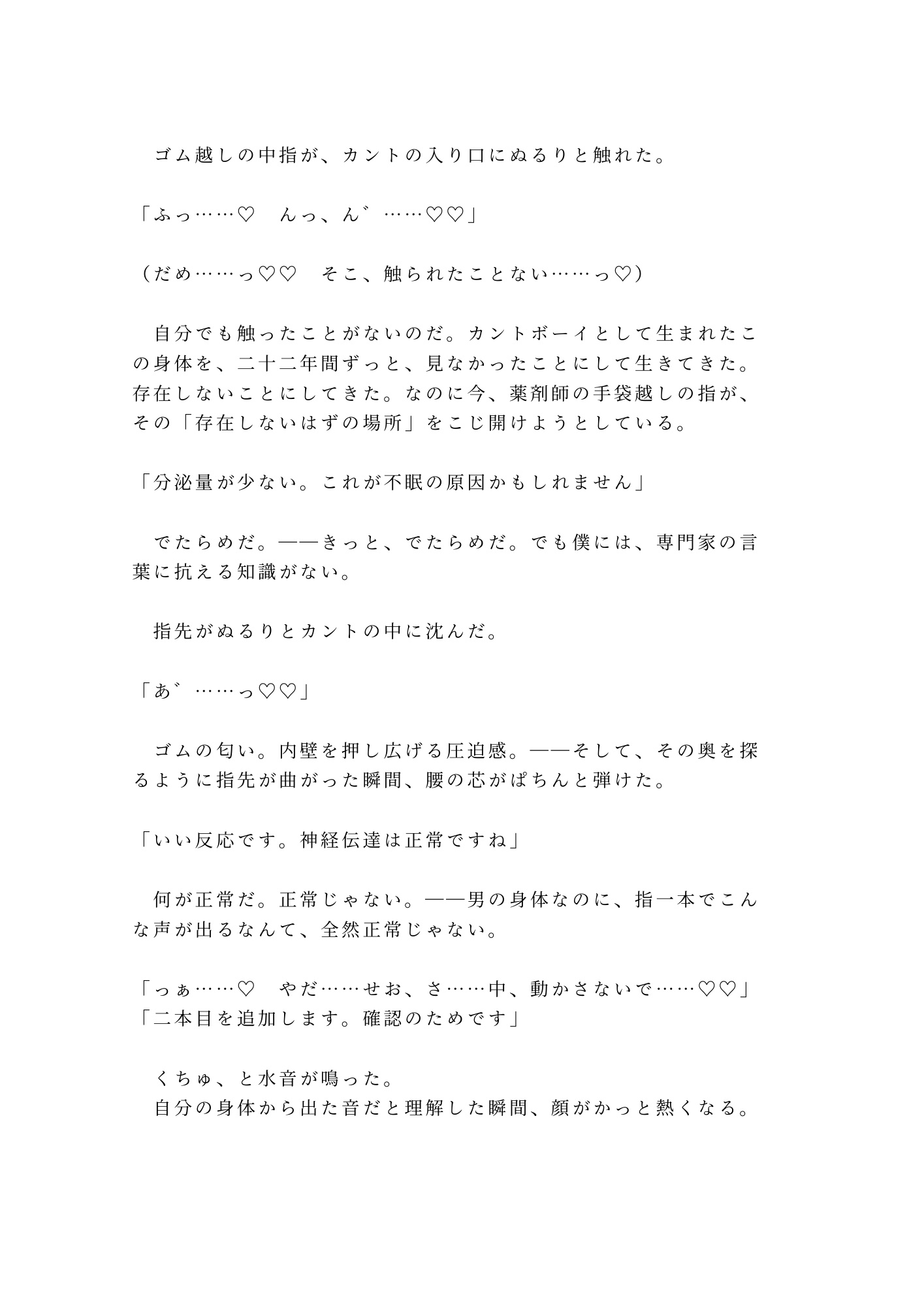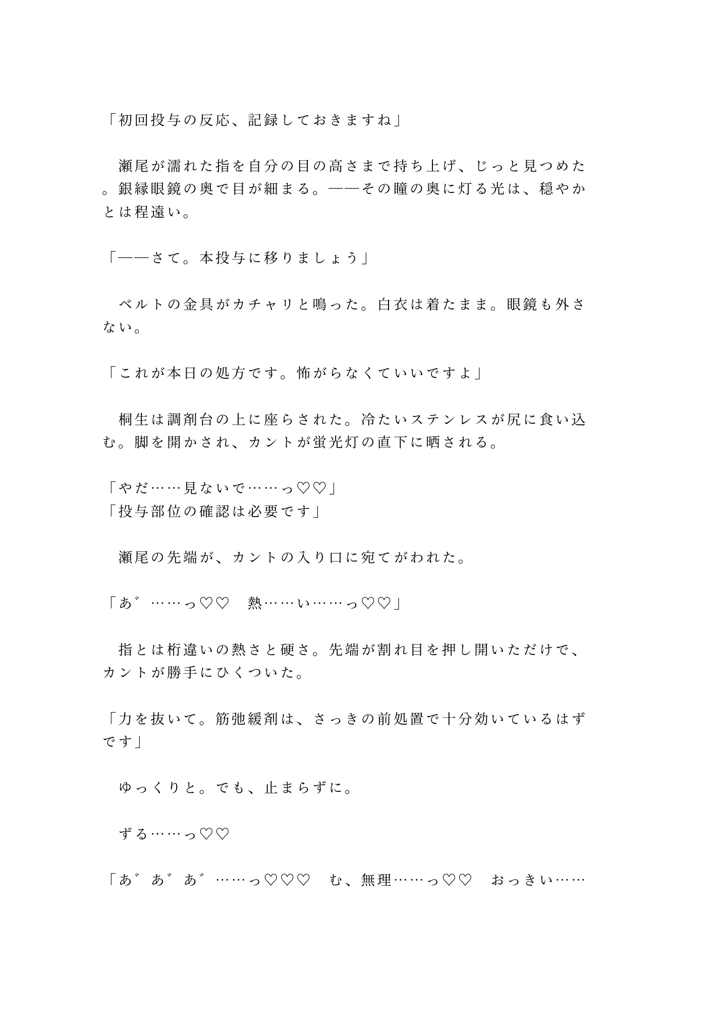 知的で冷静な攻め×自分の身体を受け入れられない受け。医療プレイ×カントボーイ。「嘘だと分かっているのに気持ちいい」、その背徳ごと呑み込まれたい方に。