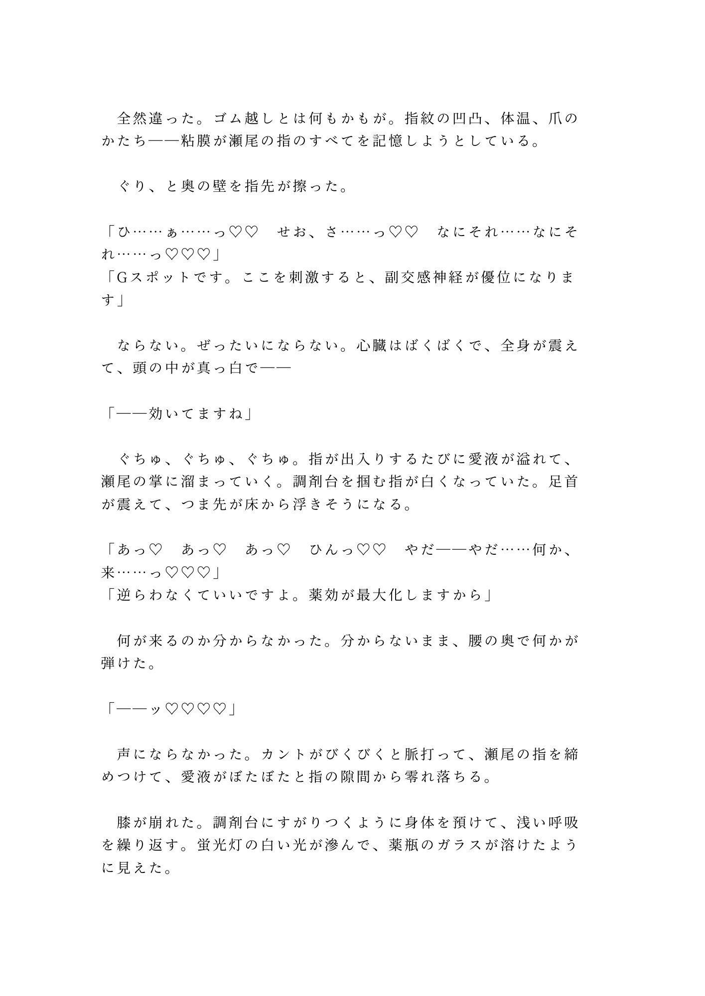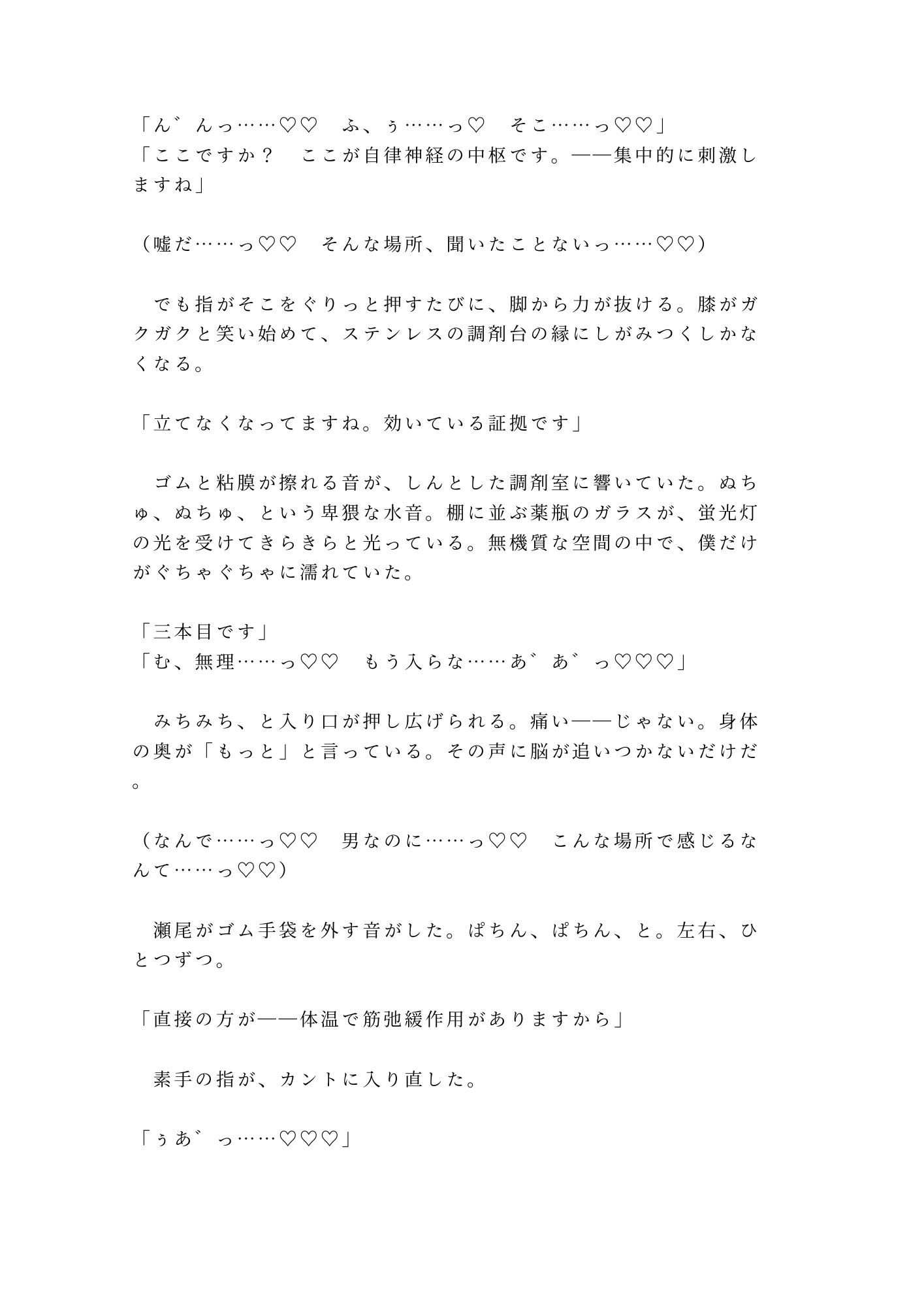 三ヶ月間、不眠に苦しむカントボーイの桐生。唯一の拠り所は、かかりつけ薬局の薬剤師・瀬尾誠司の低く均質な声だけだった。「触診です」「消毒しますね」「分泌量を確認します」——白衣の下に隠された執着が、医療用語という名の嘘で桐生の身体をこじ開けていく。