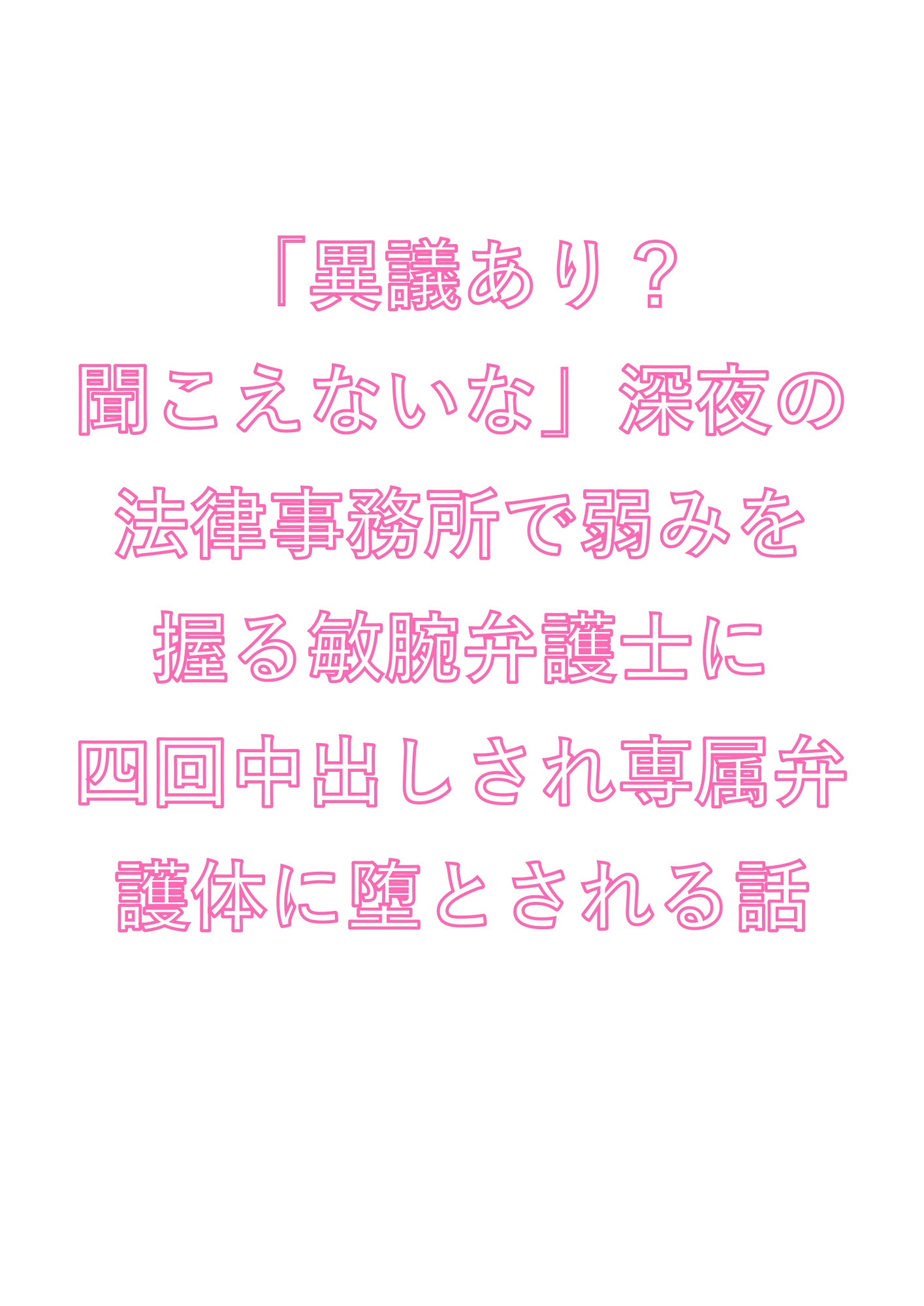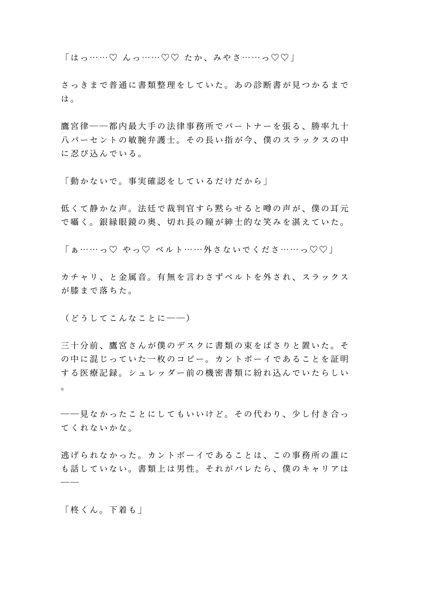 深夜の法律事務所。パラリーガルの柊は、敏腕弁護士・鷹宮にカントボーイの秘密を握られた。「見なかったことにしてもいい。その代わり——」逃げ道を塞がれ、誰にも触れさせたことのない処女カントを暴かれていく。法廷仕込みの冷静な指と言葉で初絶頂を教え込まれ、四回の中出しで理性ごと壊される。「異議あり?——聞こえないな」弱みを握る鬼畜弁護士×秘密を抱えるカントボーイの、逃げ場なし深夜オフィスBL