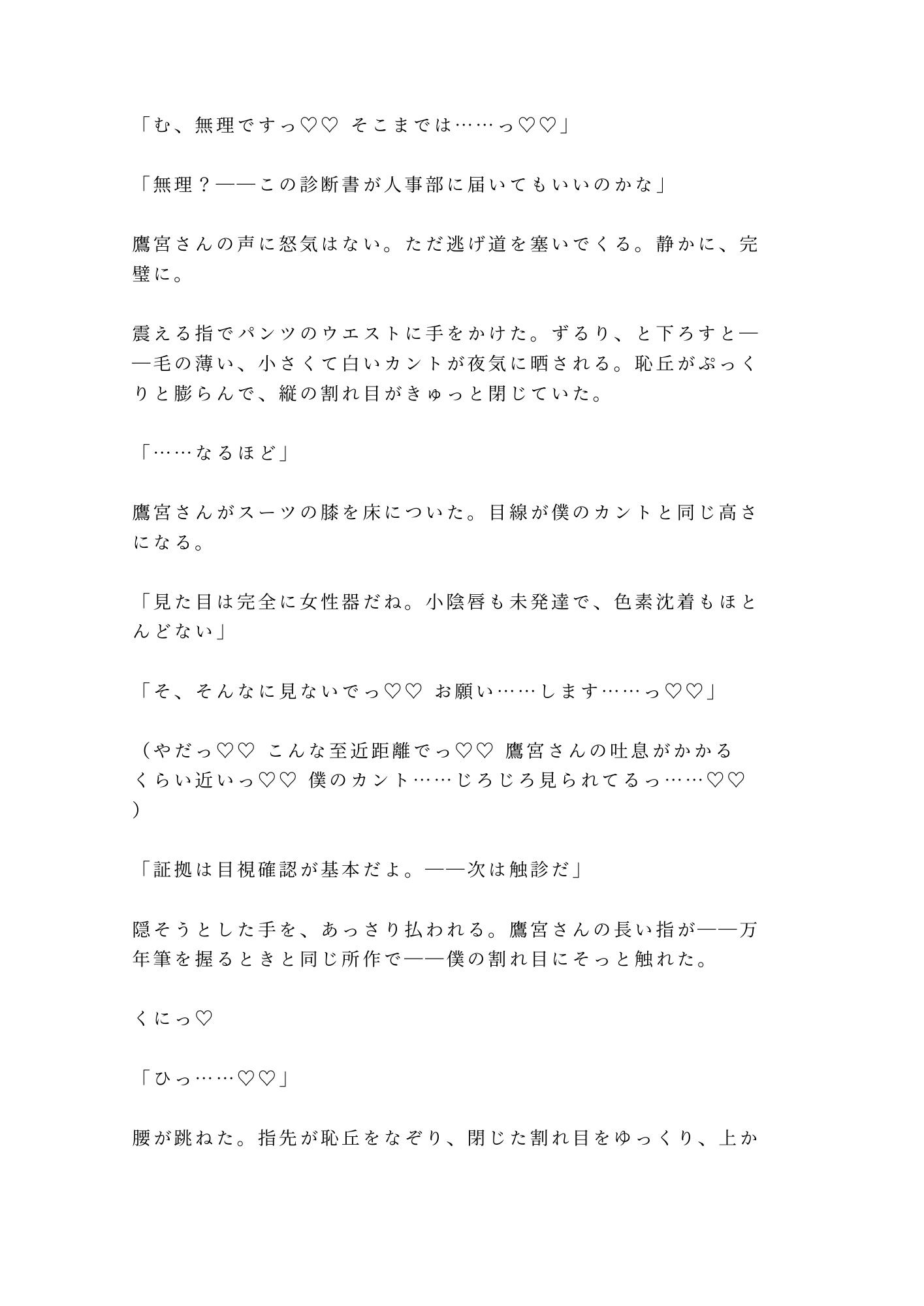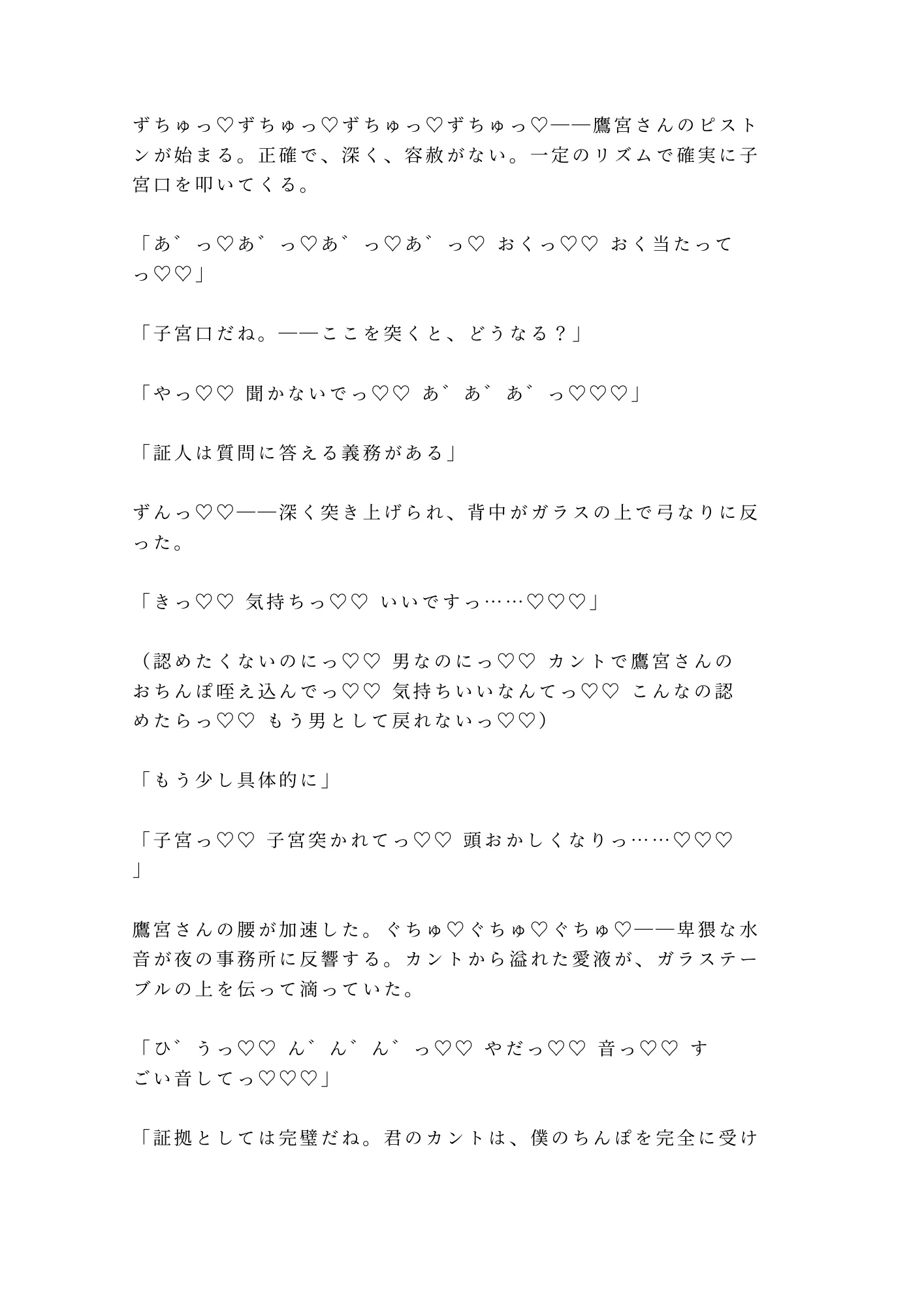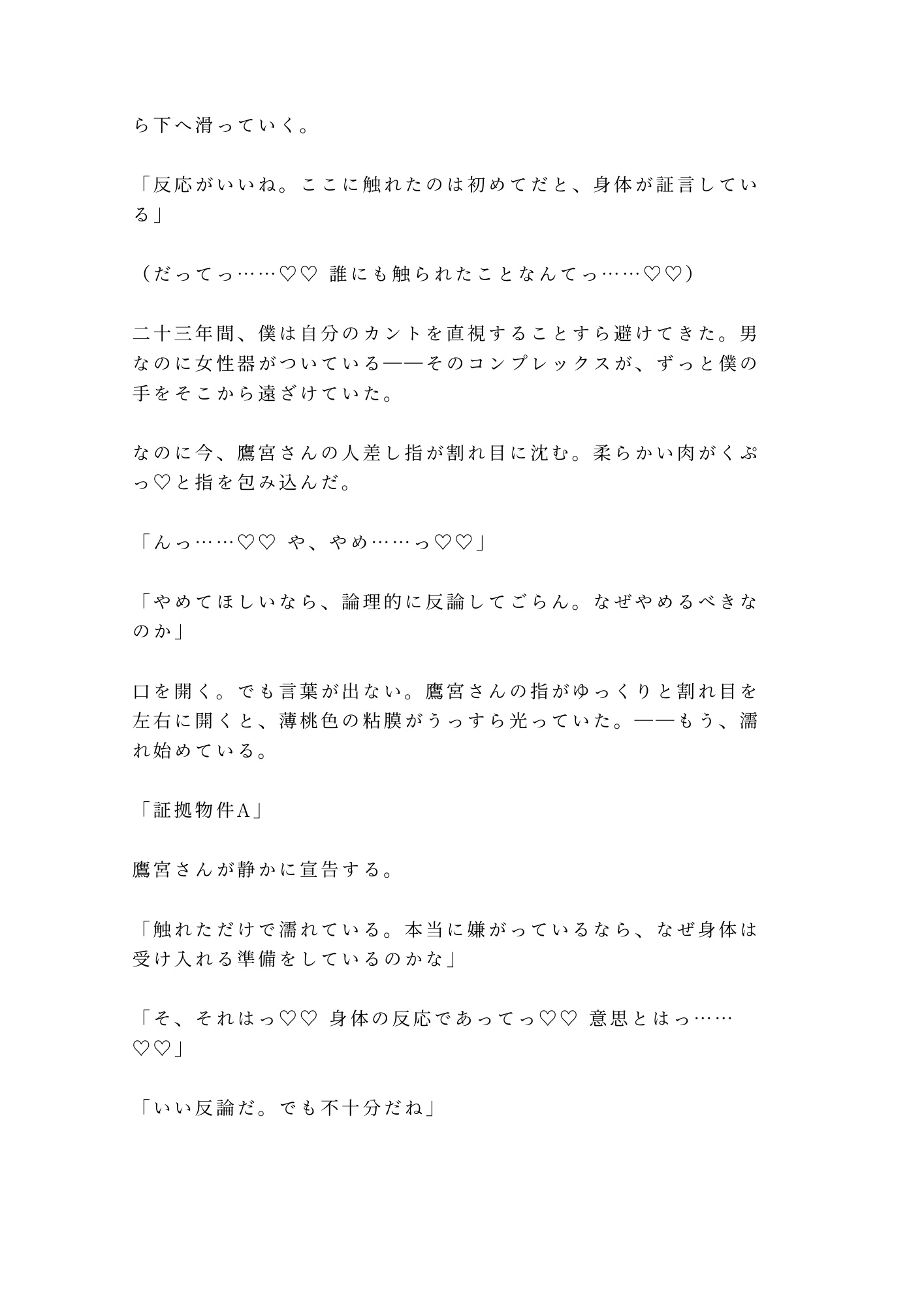 カントボーイであることを隠して男として生きてきた柊。二十三年間、自分の身体から目を背けてきた。触れたことすらないその場所を、鷹宮の長い指が暴き、法廷用語で「証拠」と名づけていく。「異議はある?」「……あります」「却下」——反論のすべてを快楽で封じられ、三十四階の夜景をバックに、四度の中出しで完全に堕とされる。