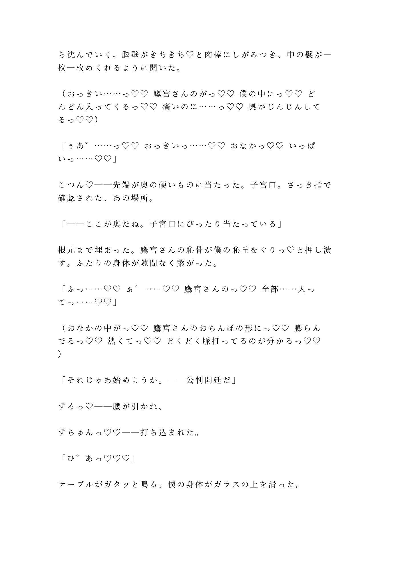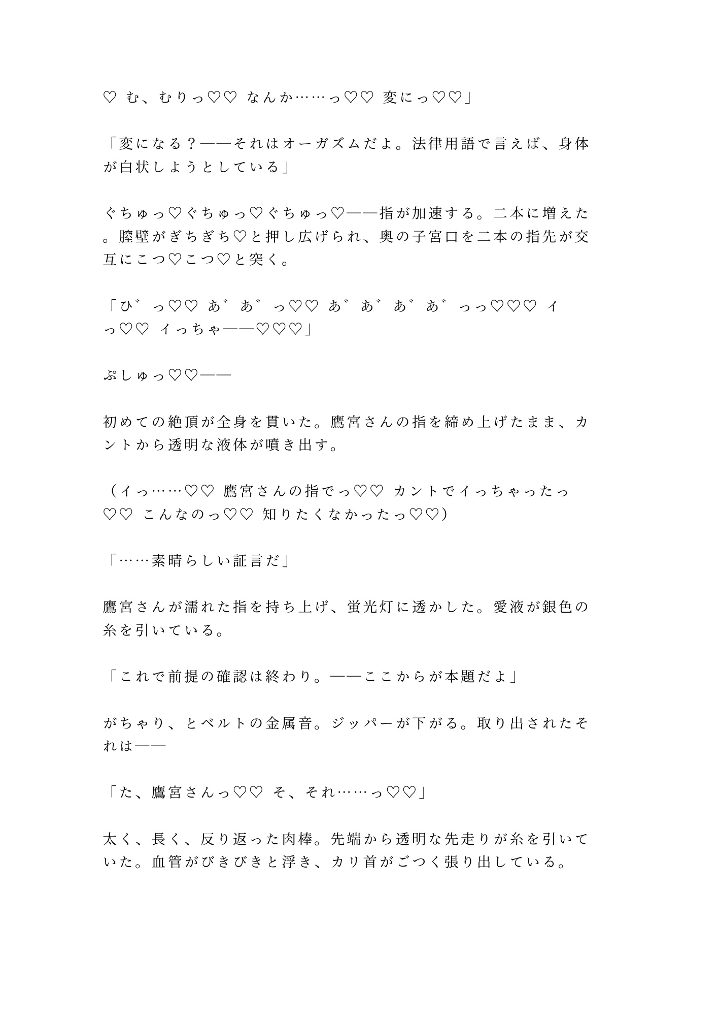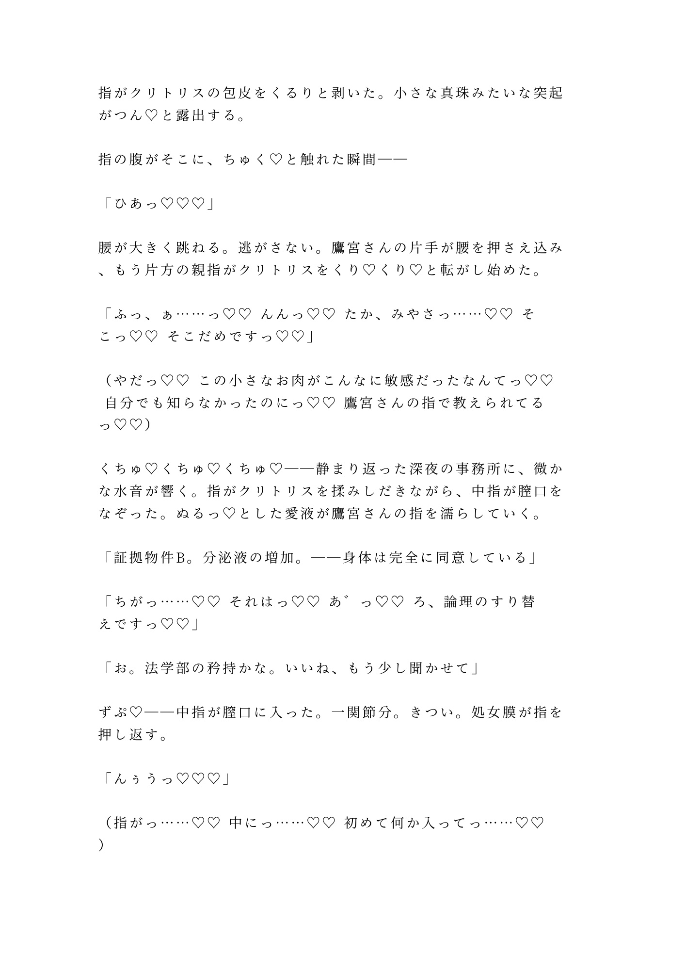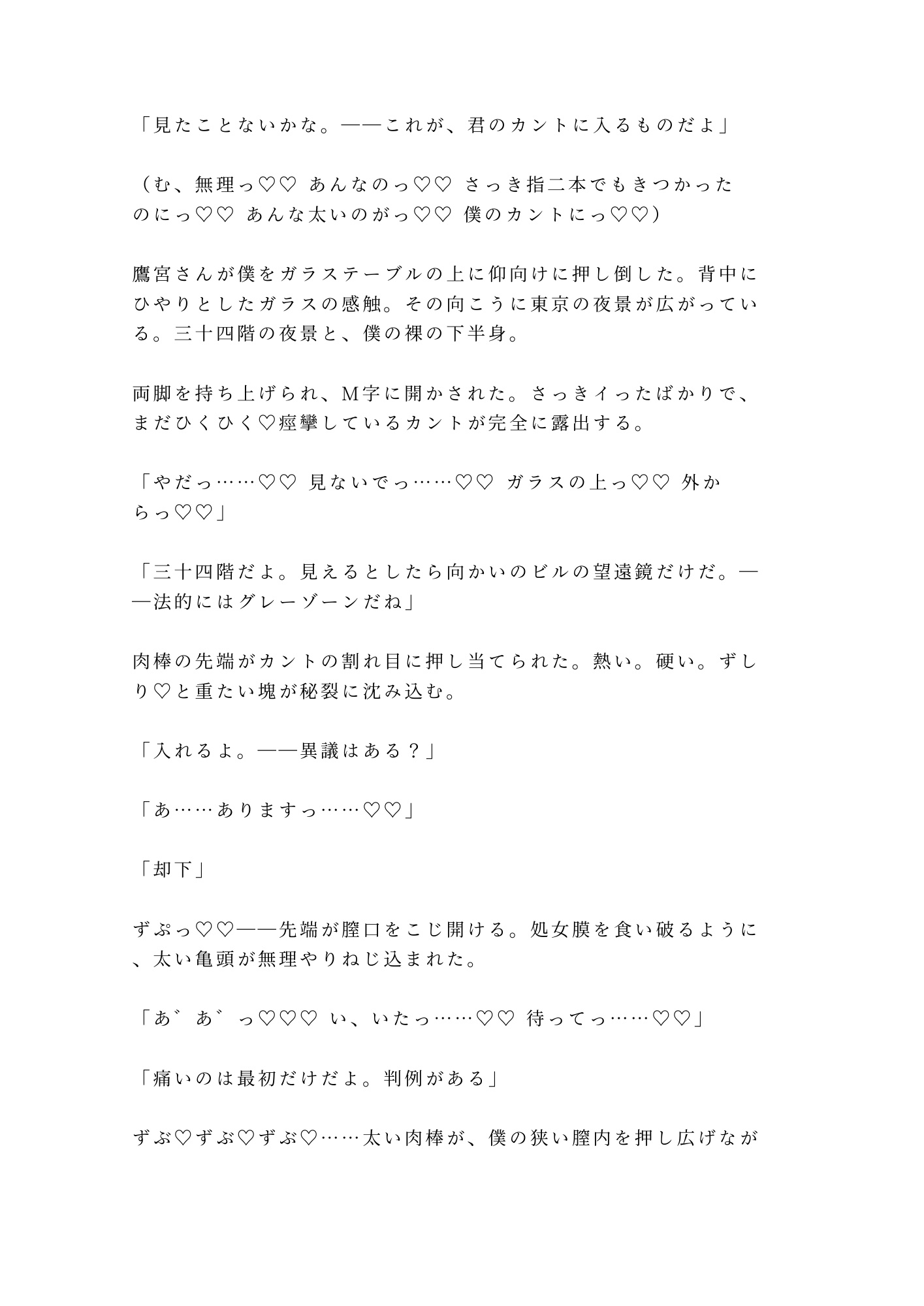 カントボーイであることを隠して男として生きてきた柊。二十三年間、自分の身体から目を背けてきた。触れたことすらないその場所を、鷹宮の長い指が暴き、法廷用語で「証拠」と名づけていく。「異議はある?」「……あります」「却下」——反論のすべてを快楽で封じられ、三十四階の夜景をバックに、四度の中出しで完全に堕とされる。