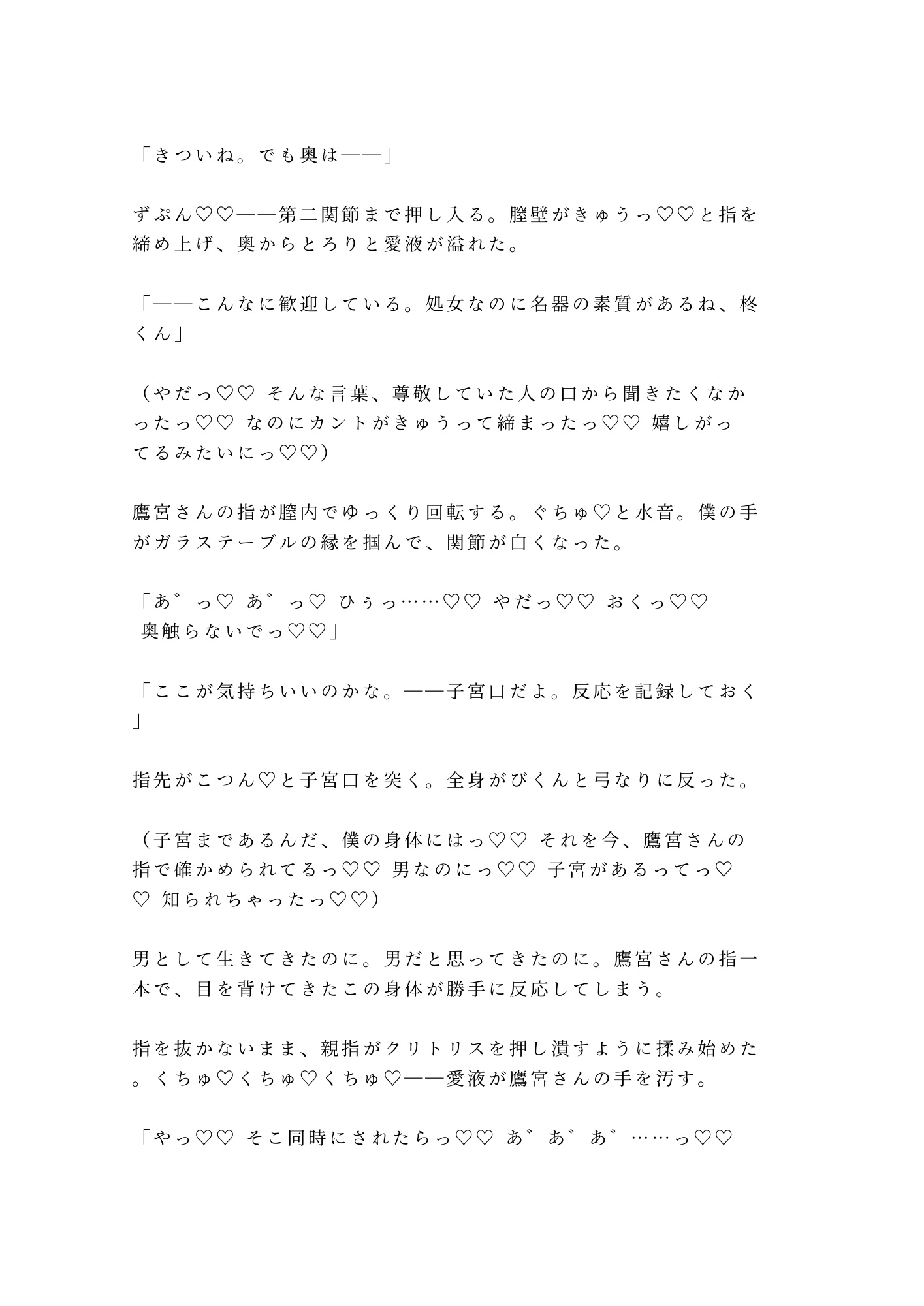 本作の見どころは、鷹宮の異常な冷静さと、柊が壊れていく落差。法律用語を性技に織り交ぜる知的な攻めと、理性が剥がれるたびに本音が零れる受けの対比が、ページをめくる手を止めさせません。指で初絶頂を教えられ、処女を奪われ、何度も子宮口を突かれて——「もう男には戻れない」と悟った瞬間の、快楽と絶望が入り混じった描写は圧巻です。