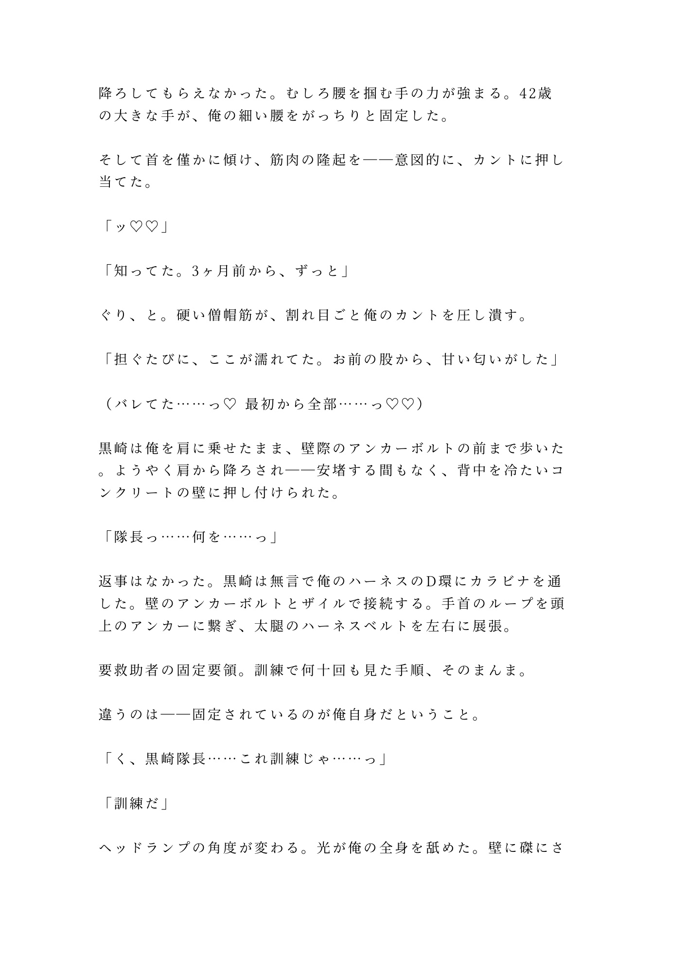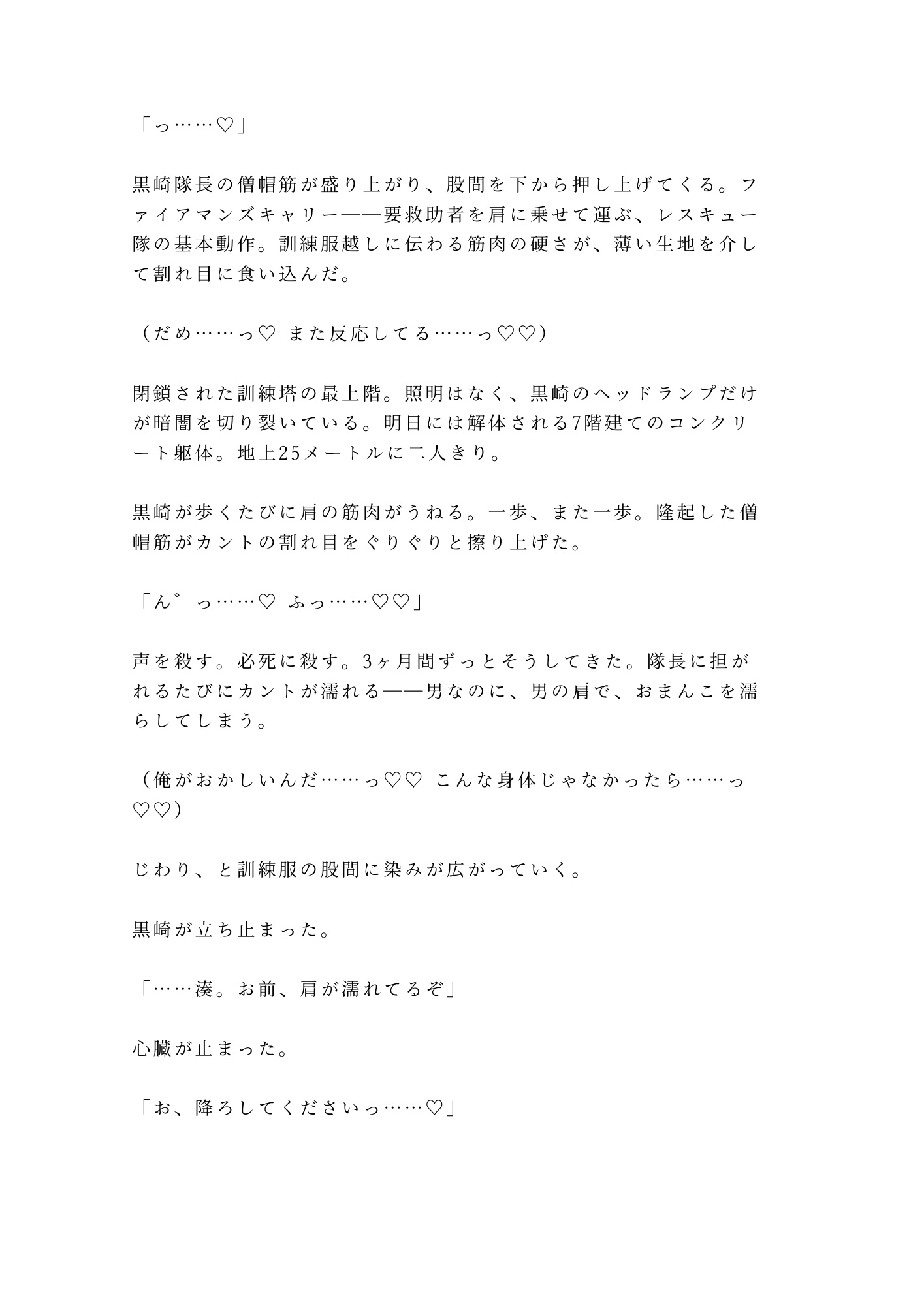 新人レスキュー隊員・湊には、誰にも言えない秘密があった。隊長のファイアマンズキャリーで担がれるたびに、身体が勝手に反応してしまう。盛り上がった僧帽筋が股間を擦り上げるだけで、訓練服の内側はぐしょぐしょに濡れていた。3ヶ月間、必死に隠し通してきたその秘密を——42歳のベテラン隊長・黒崎は、最初から全部知っていた。