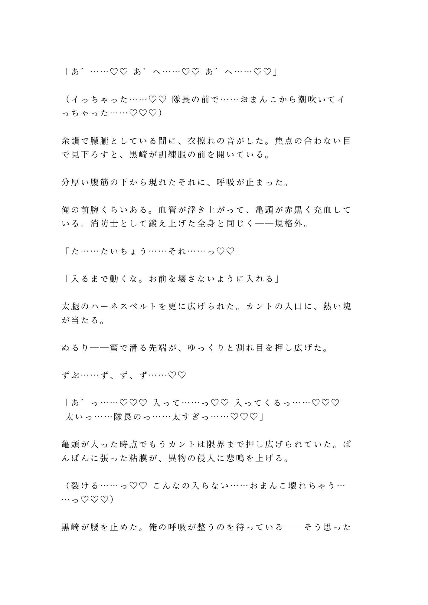 BL / カントボーイ / 年の差 / 消防士×新人 / 拘束・ハーネス / 中出し・種付け / 複数回戦 / 筋肉 / 高所プレイ / 雌堕ち