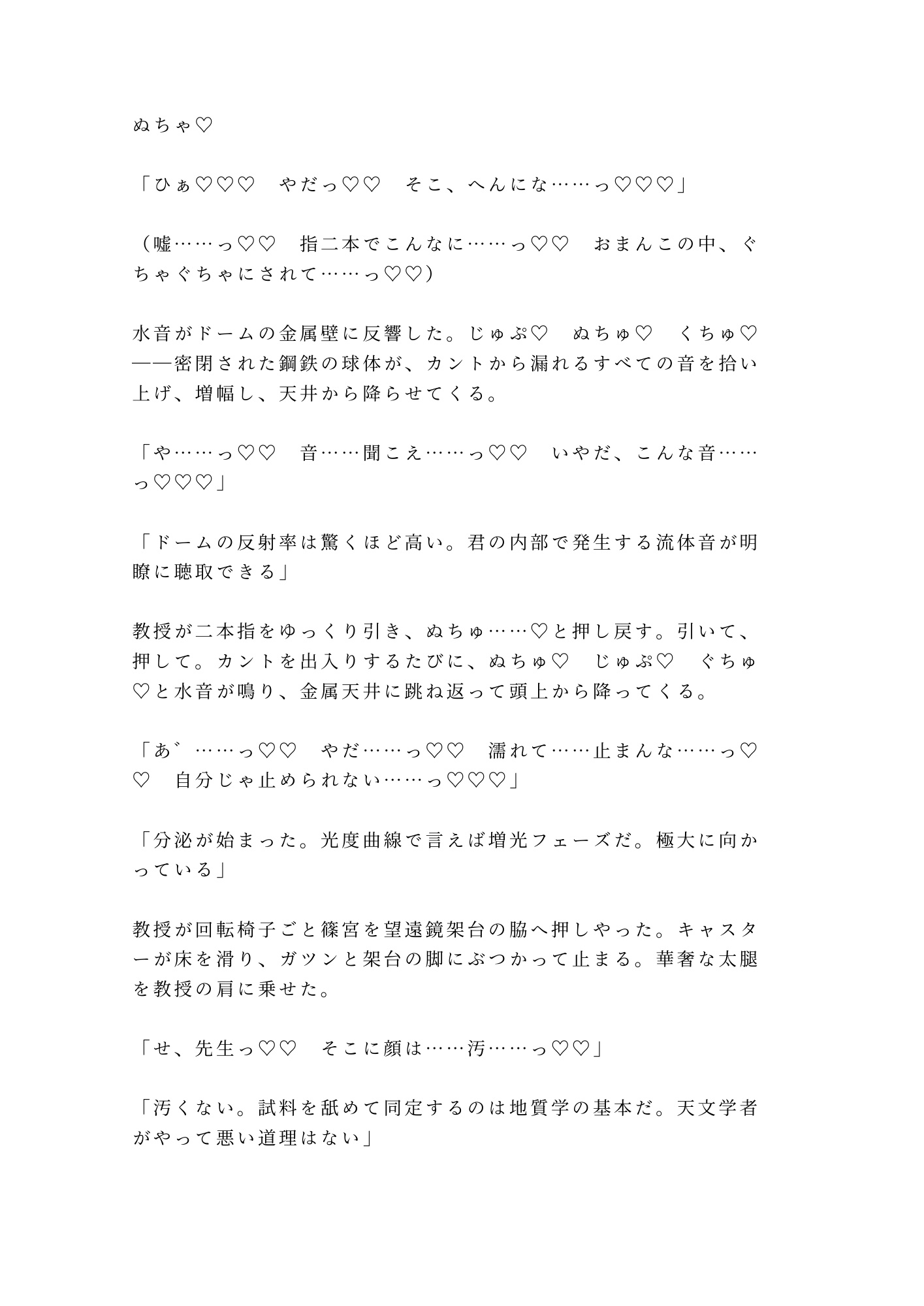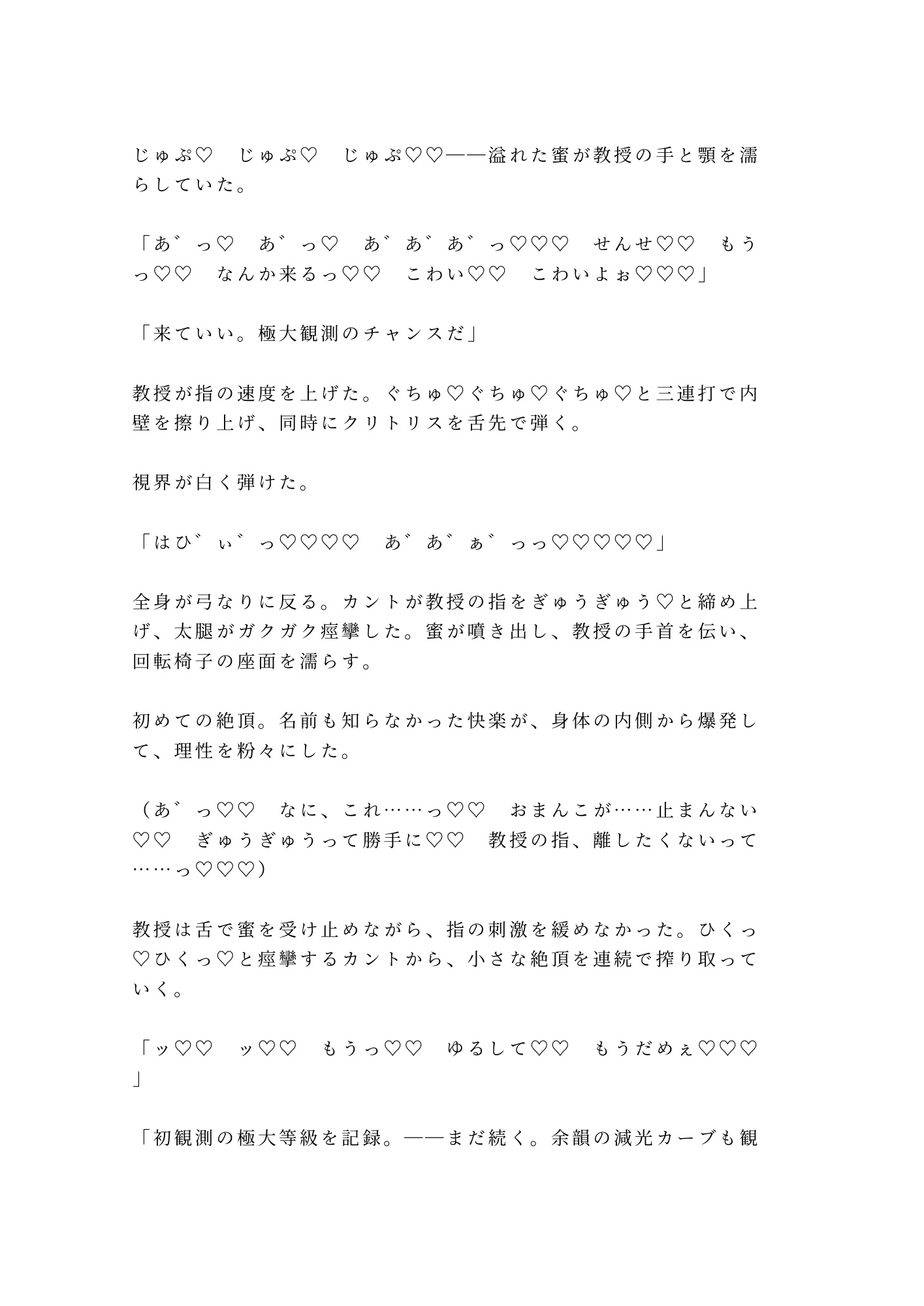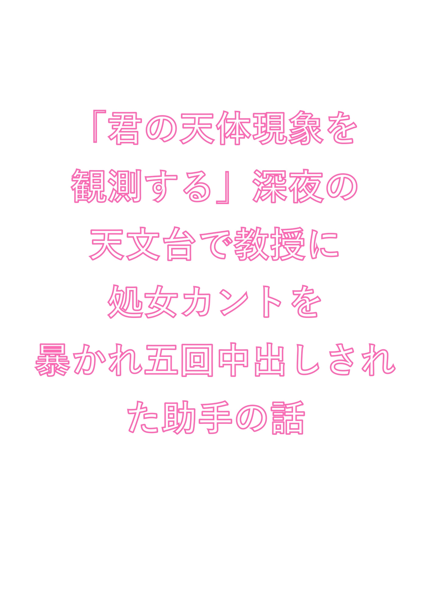 処女カントを指で、舌で、そして五回の中出しで徹底的に開発される助手。博士論文の審査を盾に取られ、車の鍵を握られ、それでもお腹の奥がきゅんと疼いてしまう——抗えない快楽への堕落を、天文台という異空間の中で濃密に描きます。