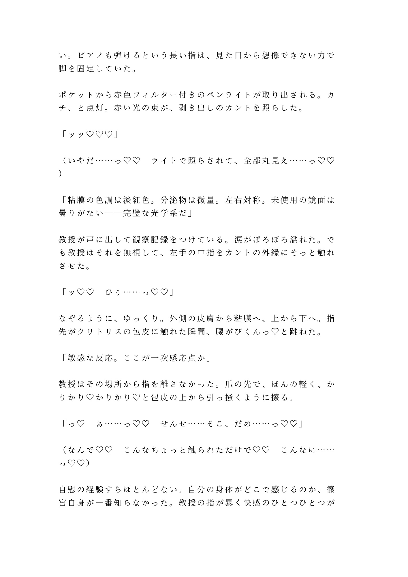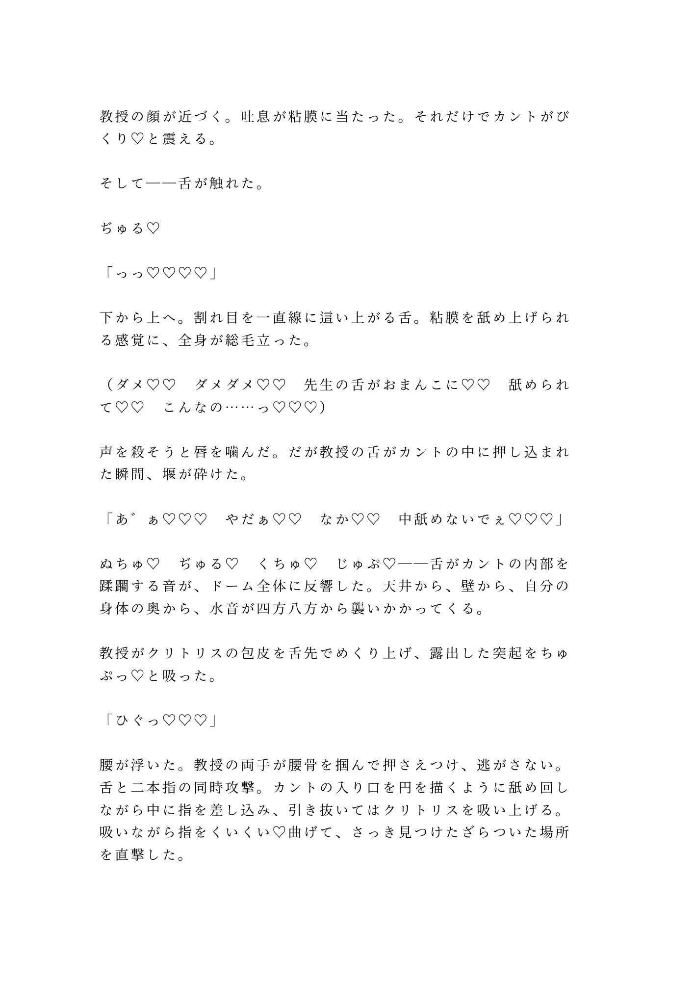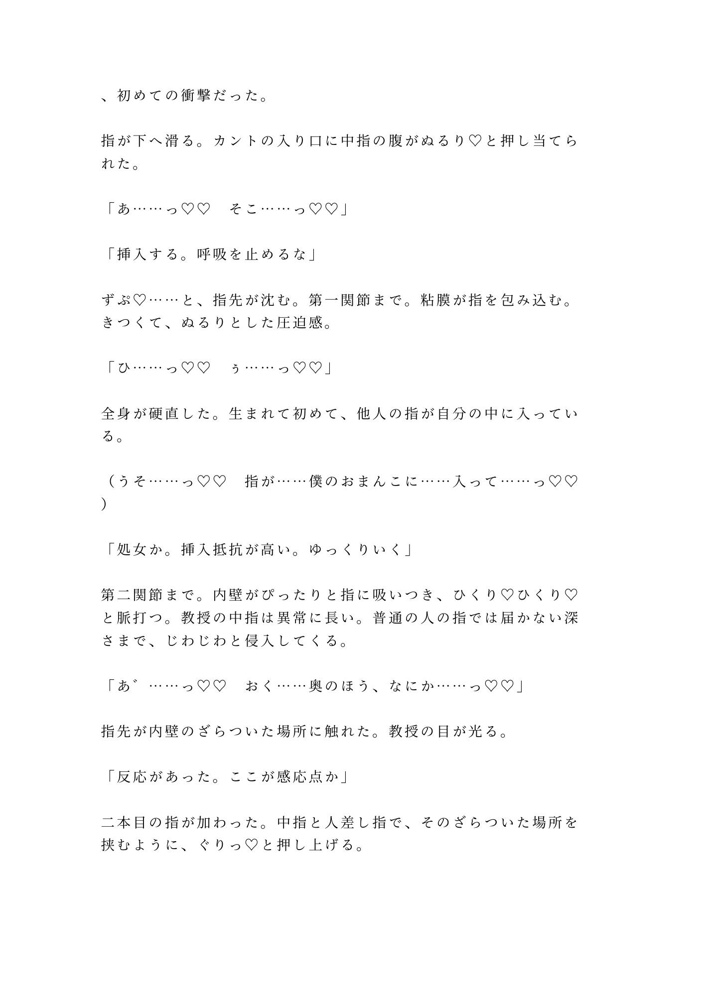 処女カントを指で、舌で、そして五回の中出しで徹底的に開発される助手。博士論文の審査を盾に取られ、車の鍵を握られ、それでもお腹の奥がきゅんと疼いてしまう——抗えない快楽への堕落を、天文台という異空間の中で濃密に描きます。