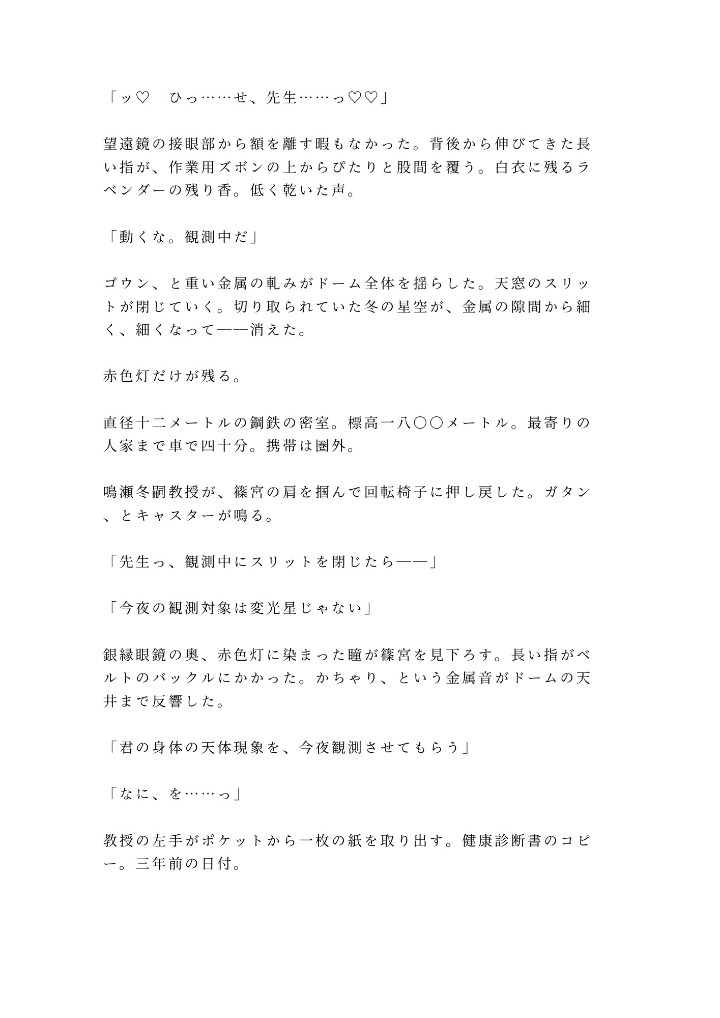 天体物理学の鳴瀬教授と、その助手・篠宮。三年間、教授は知っていた。篠宮がカントボーイであることを。健康診断書のコピーをポケットに忍ばせたまま、二人きりの観測日を静かに組んだ。
