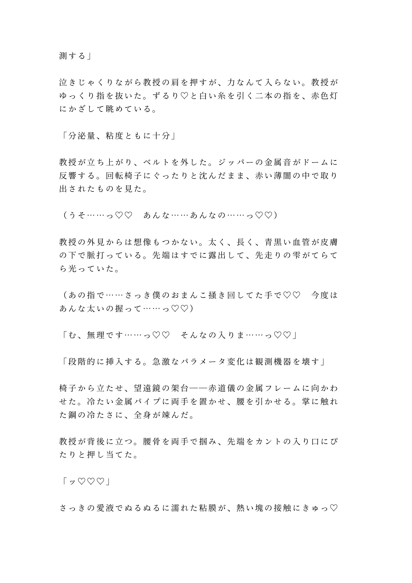 BL / カントボーイ / 教授×助手 / 天文台ドーム / 処女喪失 / 中出し / 二穴同時 / 知的責め / 拘束 / 孕ませ