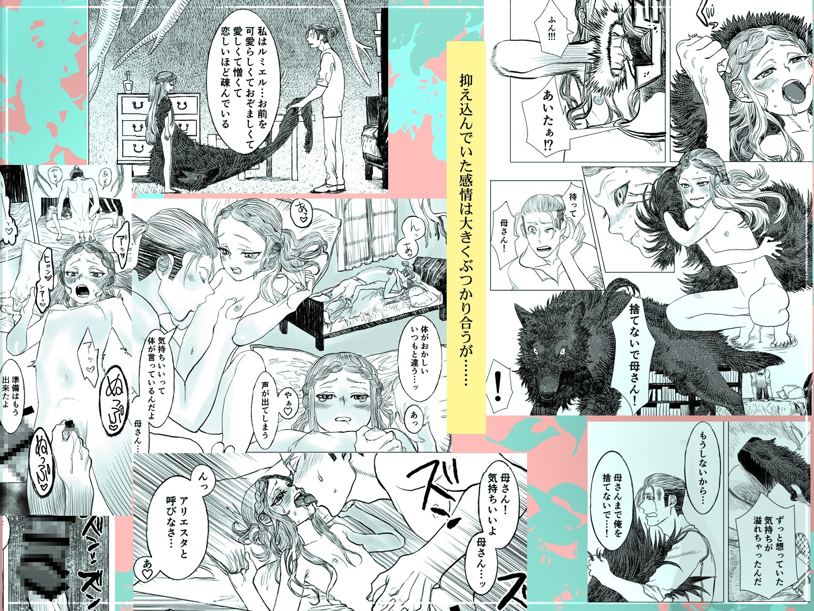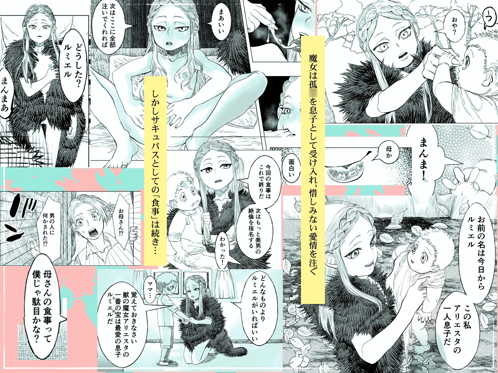 森に棲む齢千年の○リババアの魔女はハーフサキュバスで男性との性交でえた精力を食事としている。ある日、森の家の前に捨てられた赤ん坊の笑顔に絆され育てることにする。赤ん坊は立派な青年に育ち、育ての親の魔女に求婚するようになる。森に棲む魔女千歳○リババア森で拾われ魔女に育てられた青年