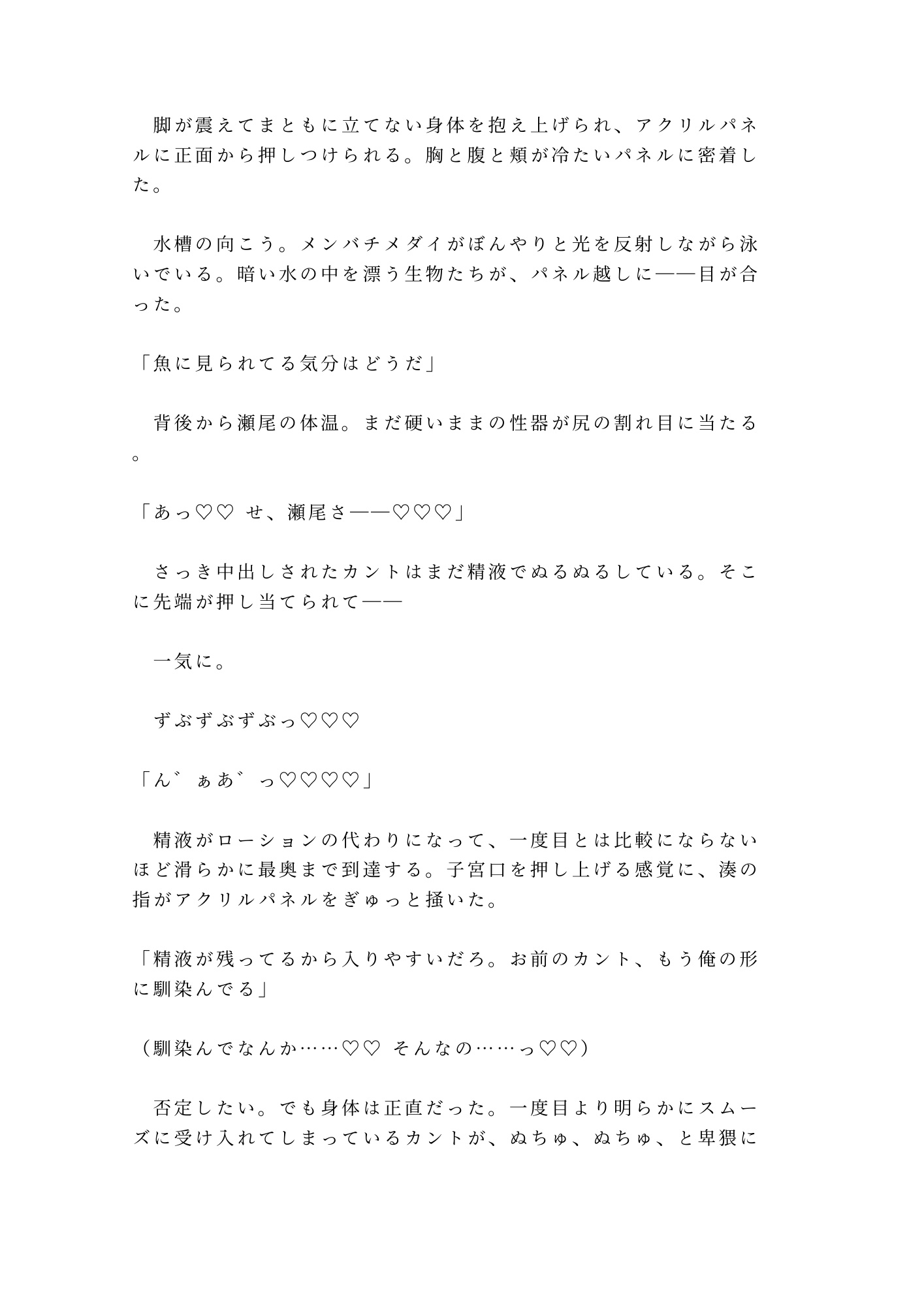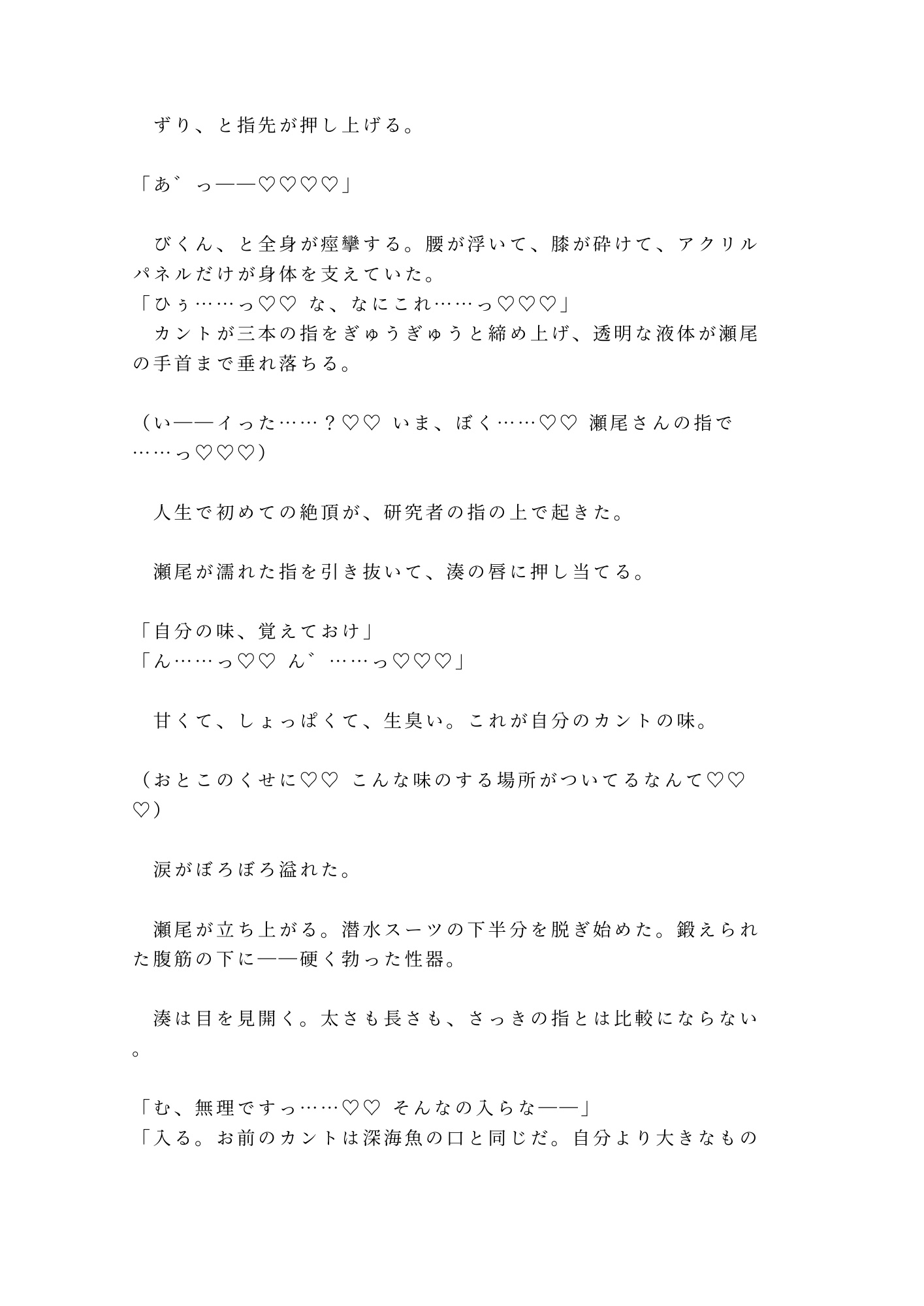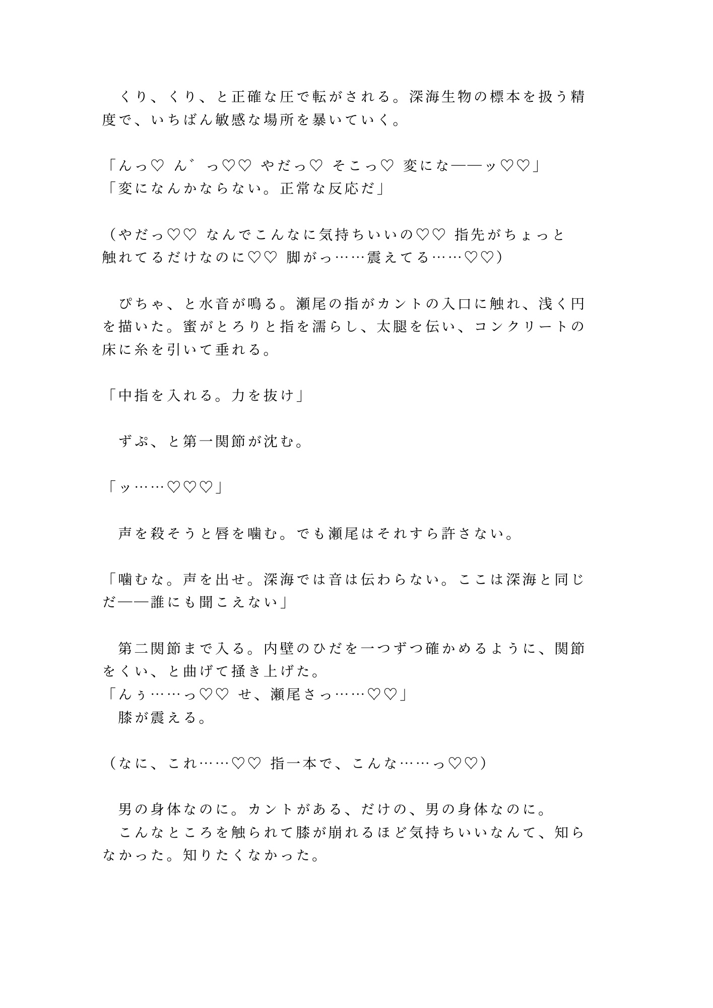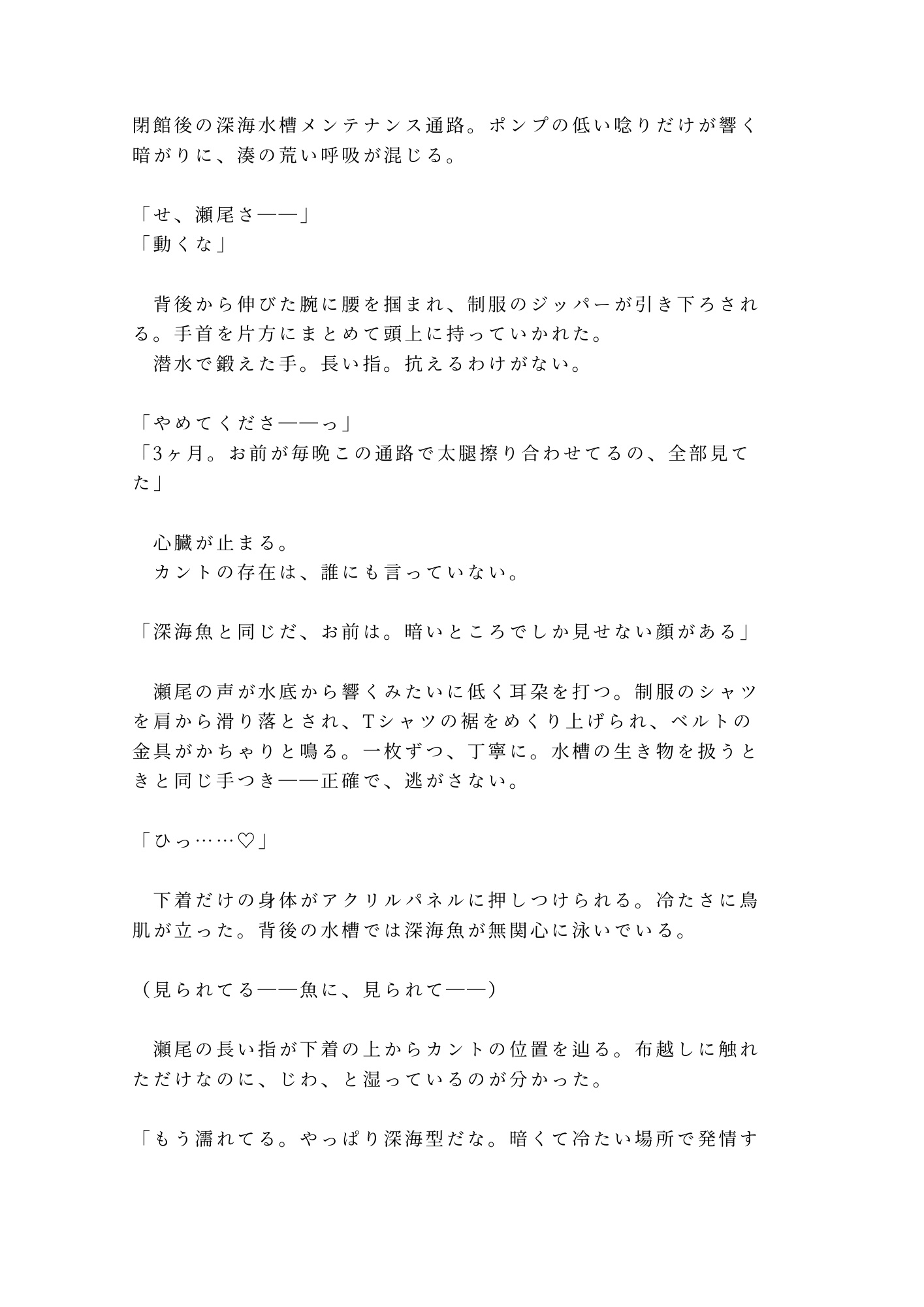 カントボーイの飼育員・湊には、誰にも言えない秘密があった。深海水槽の前を通るたびに疼く身体。暗い通路で太腿を擦り合わせる夜。その全てを、海洋生物学者の瀬尾は三ヶ月間、見ていた。