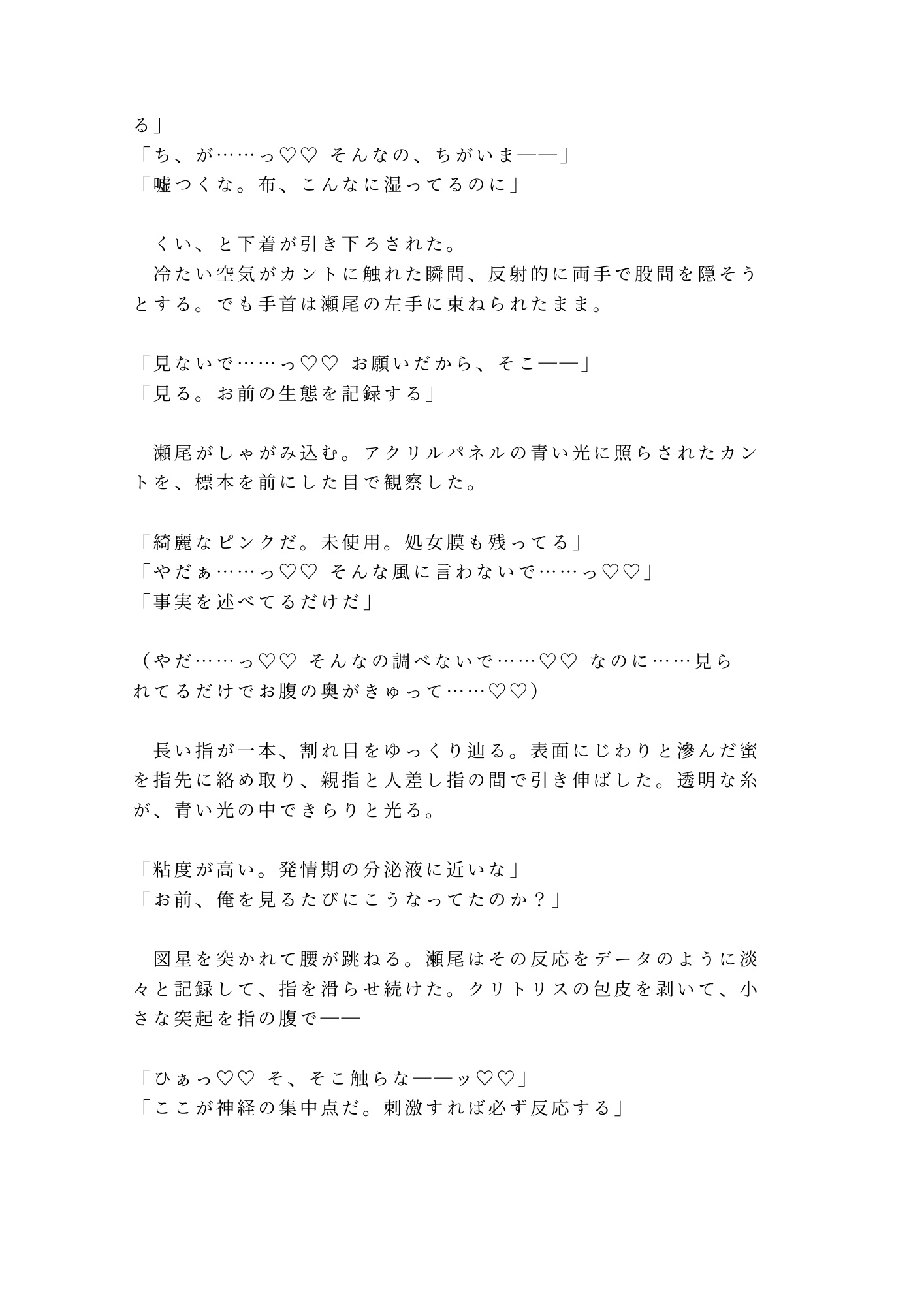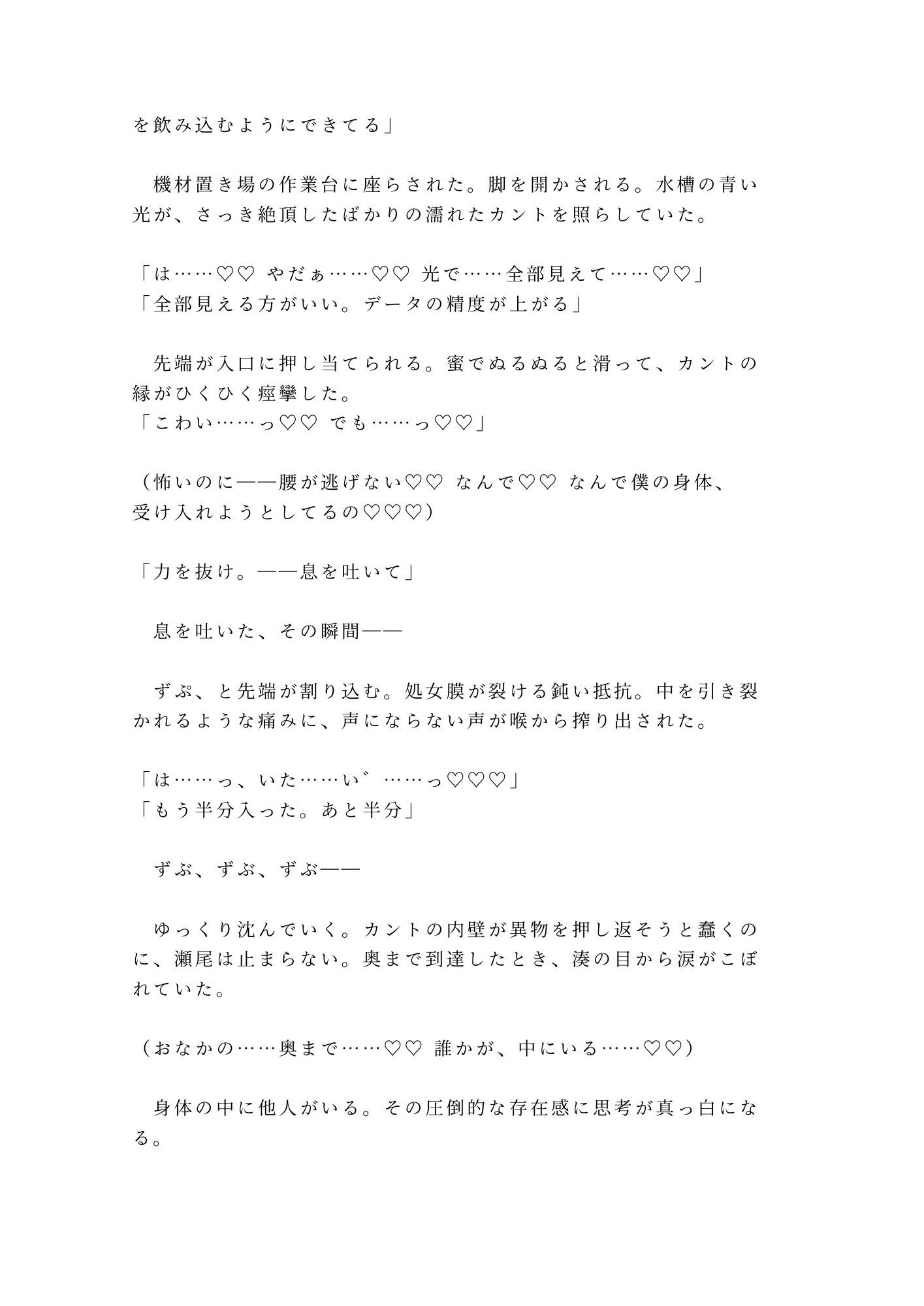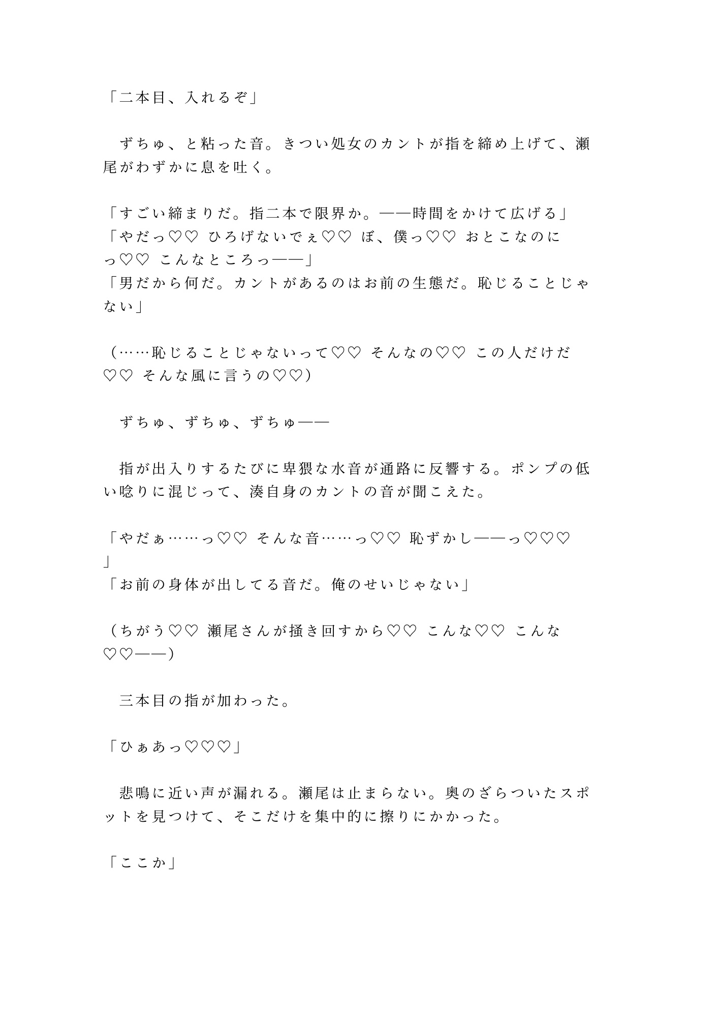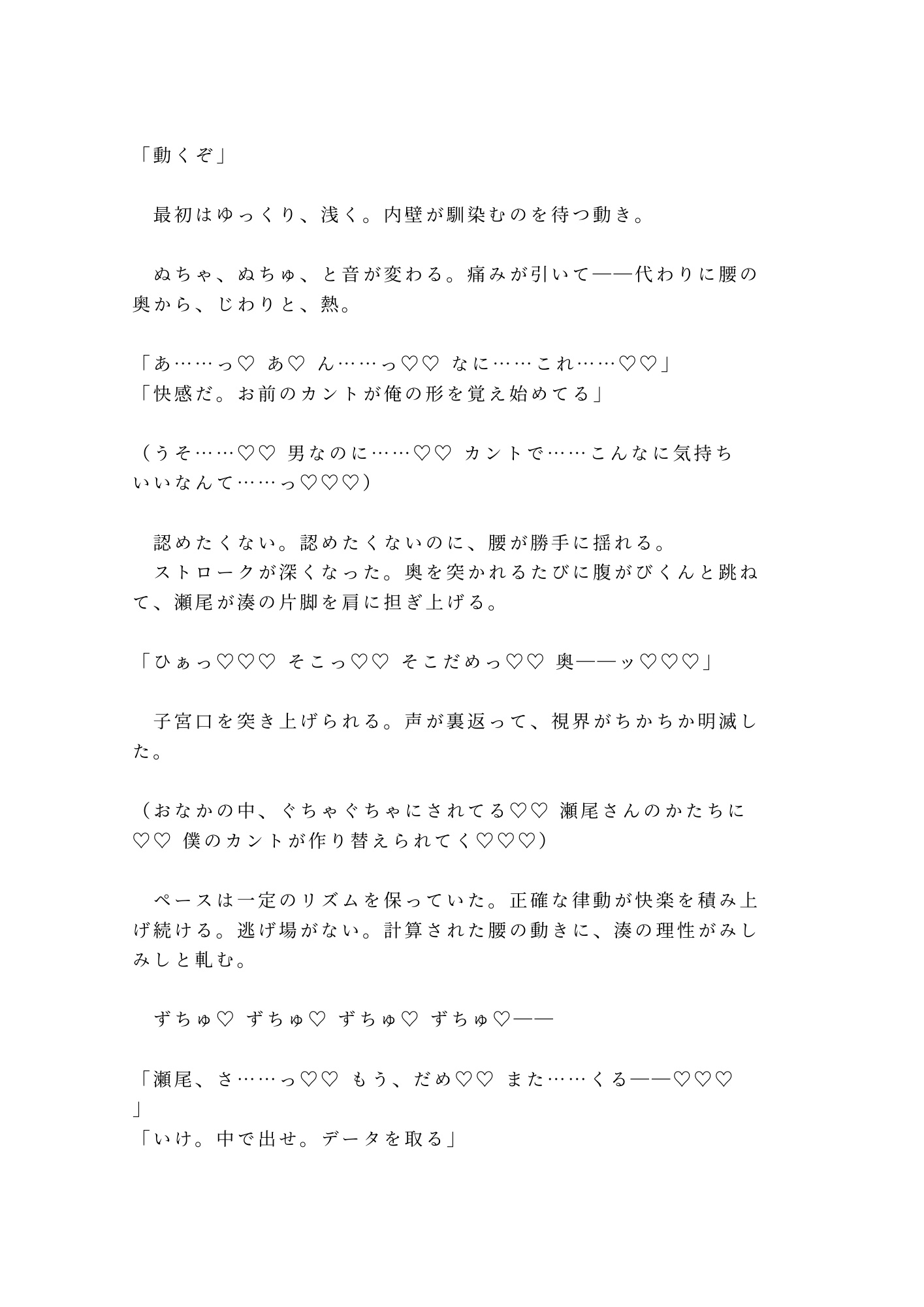 「男なのに中に出されて気持ちいいって思っちゃった」と泣きながら壊れていく湊と、「出た分はまた入れる。何度でも」と淡々と腰を動かし続ける瀬尾。知性と獣性が同居する攻めに、処女を奪われたその日のうちに四回種付けされ、自分から腰を振るまで堕とされる即堕ち展開。閉館後の水族館という密室で繰り広げられる、逃げ場のない快楽漬けの一夜をお楽しみください。