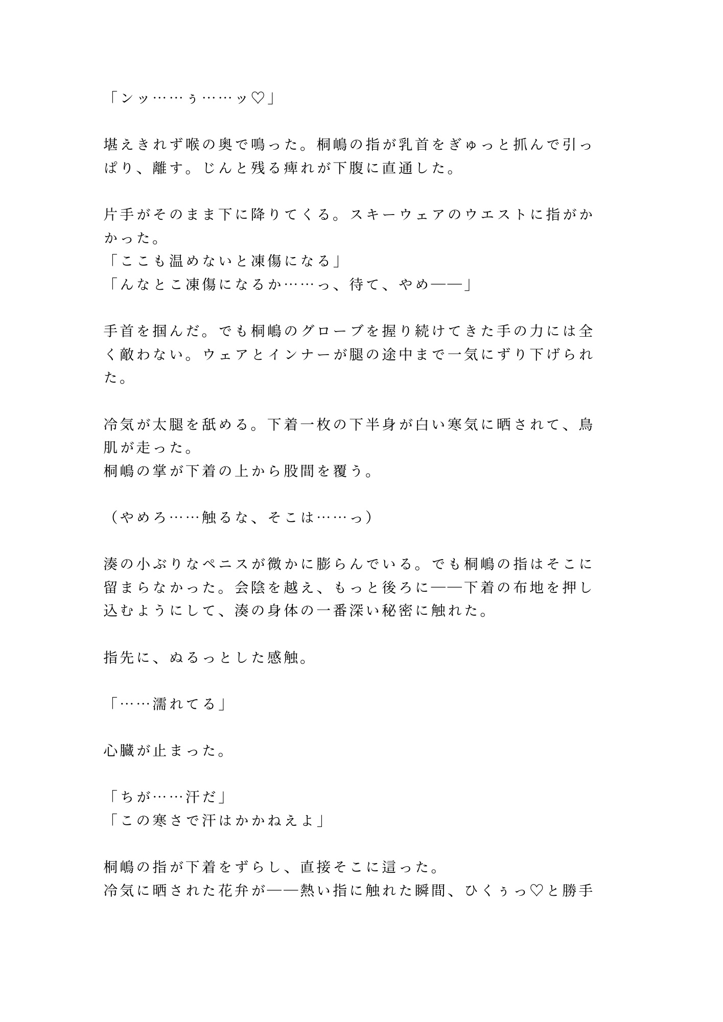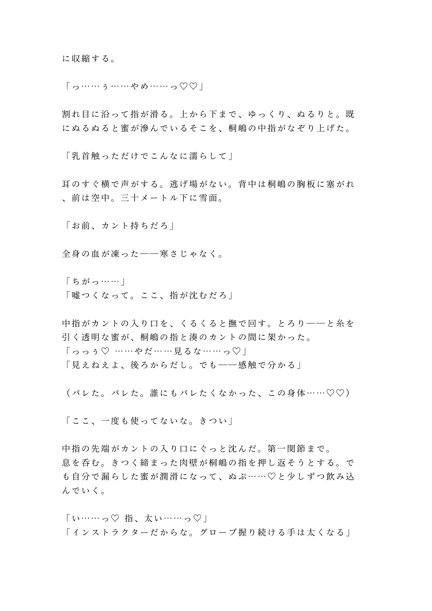 スキーレッスンで散々しごかれた元日本代表候補のインストラクター・桐嶋と、まさかの二人きり。零下十五度、暖房なし、復旧まで一時間——凍えて死ぬか、この男の体温に溺れるか。「寒いなら俺で温まれ」その一言から始まる密室四連戦。誰にも知られたくなかった秘密の身体を暴かれ、雪山の上空で何度も何度も中を熱で満たされて——。逃げ場なし。プライドも理性も、全部キレイに溶かされる。