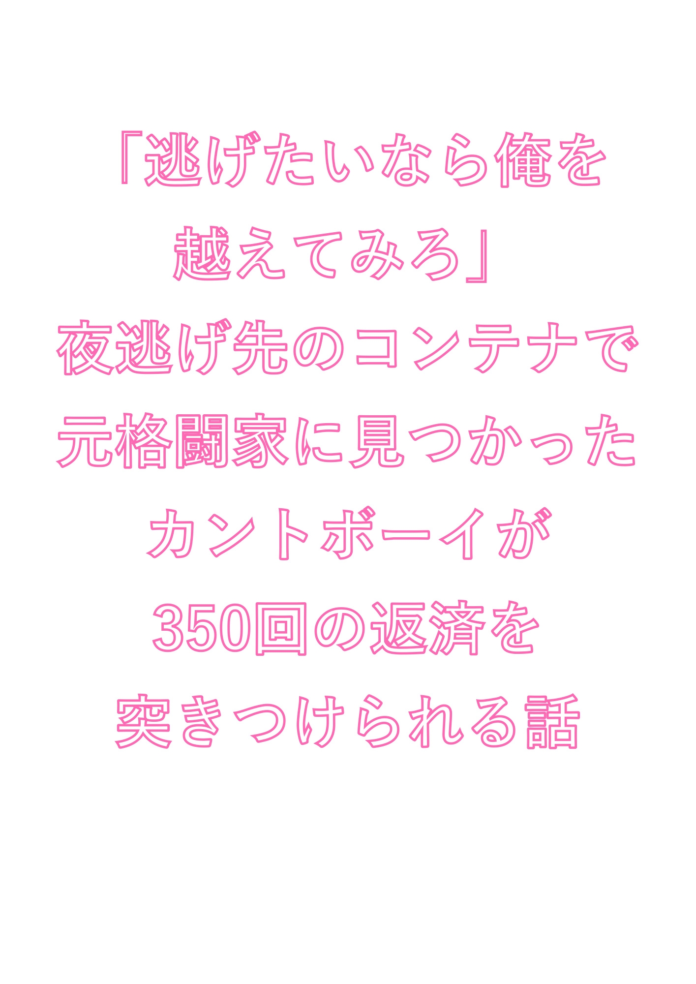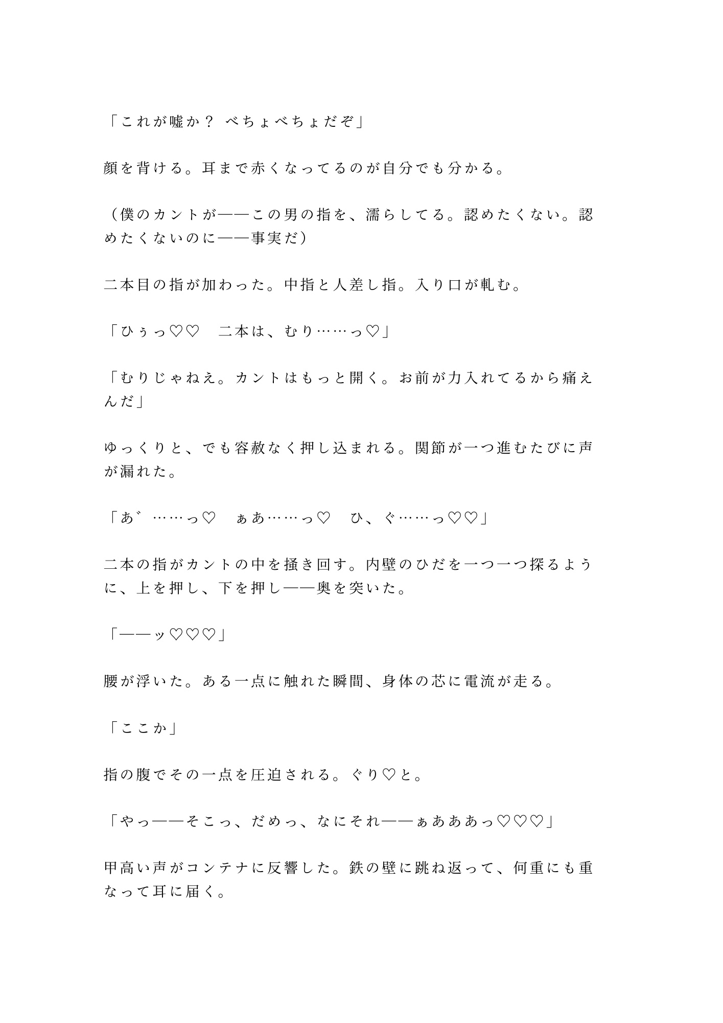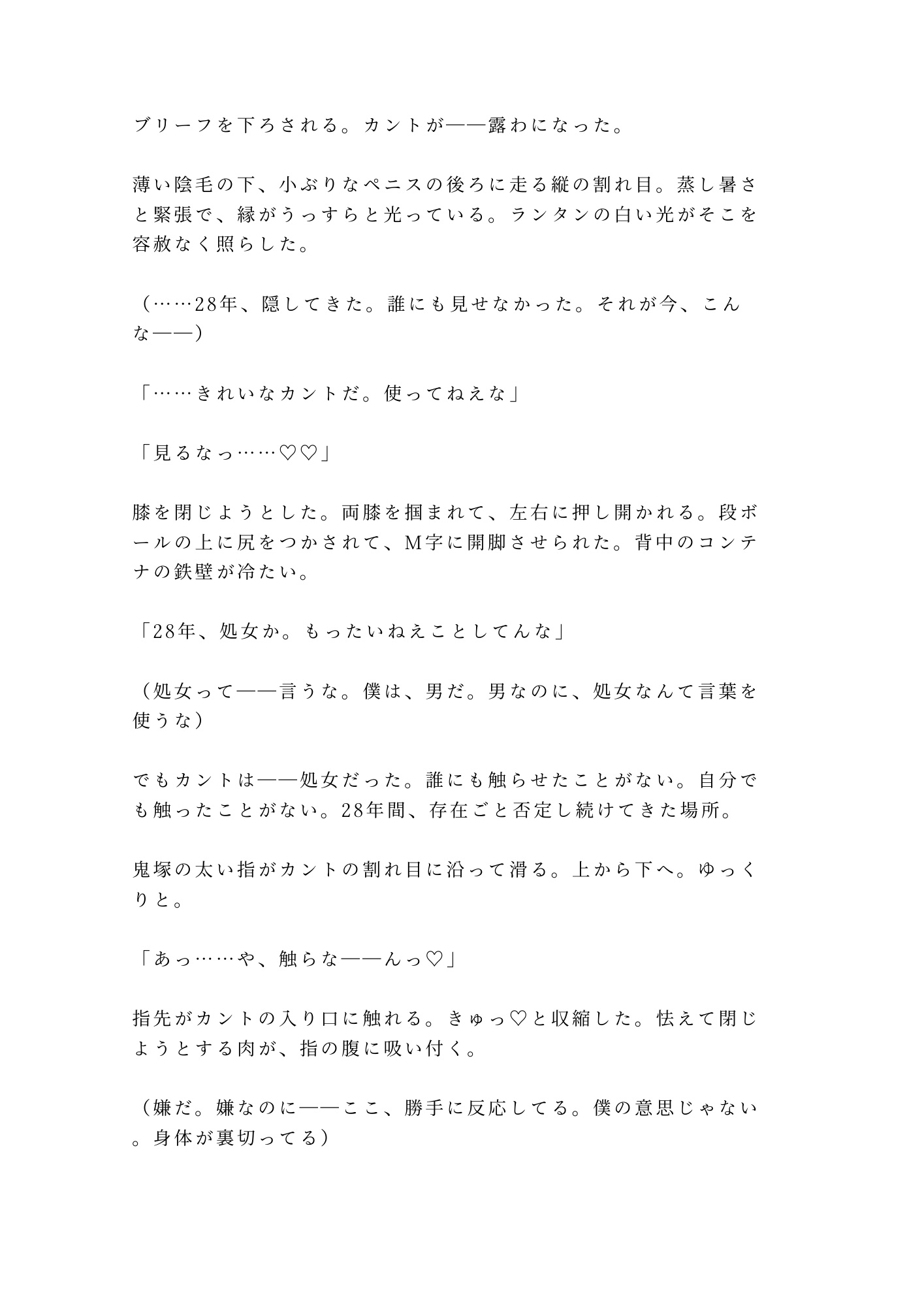 借金350万、夜逃げ先のレンタルコンテナで見つかったのは元格闘家の管理人。189cm・96kgの巨体に逃げ場を塞がれ、28年間隠し続けたカントを暴かれる。「身体で払え」——350回の返済が始まる。汗と熱気が充満する鉄の箱の中、処女のカントは男の指一本で簡単に堕ちた。逃げられない。逃げたくなくなる。元格闘家×カントボーイ、圧倒的体格差で蹂躙される究極の密室凌○BL
