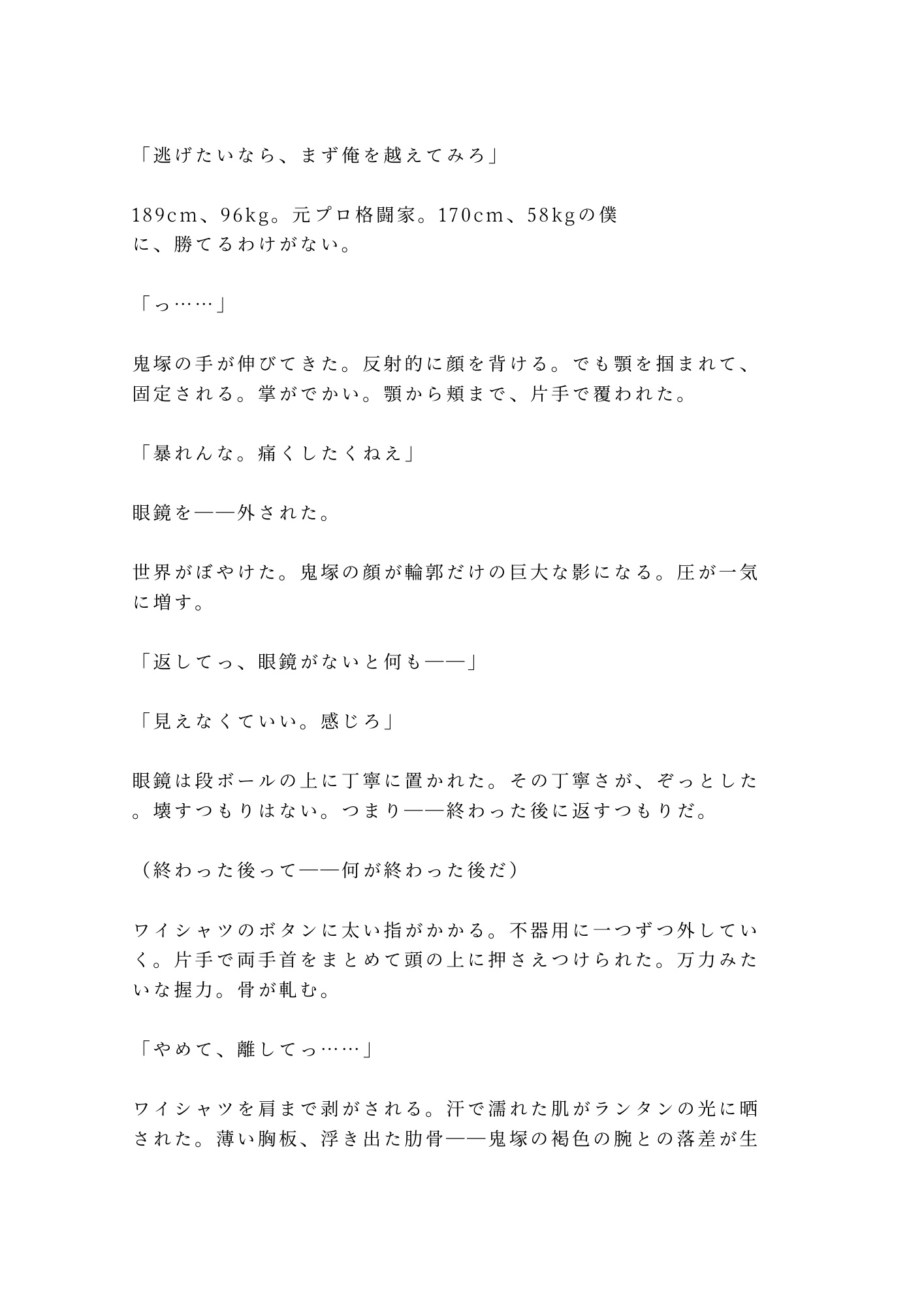 350万の借金を背負い、すべてを捨てて逃げ出した元会社員の瀬尾透(28)。三日間潜伏していたコンテナを開けたのは、倉庫の管理人・鬼塚剛(35)。189cm96kgの元プロ格闘家。逃げ場のない鉄の箱の中で、鬼塚は透の秘密を一瞬で見抜いた。