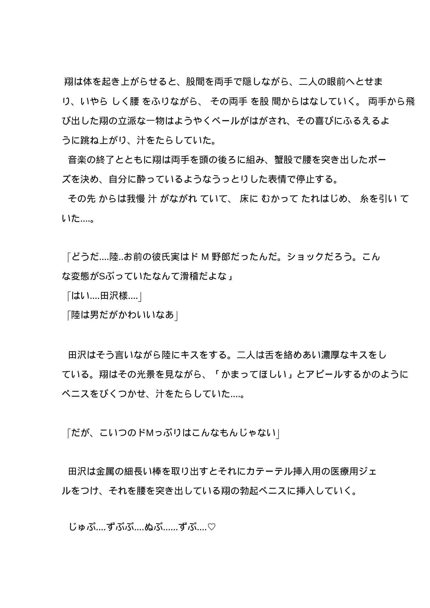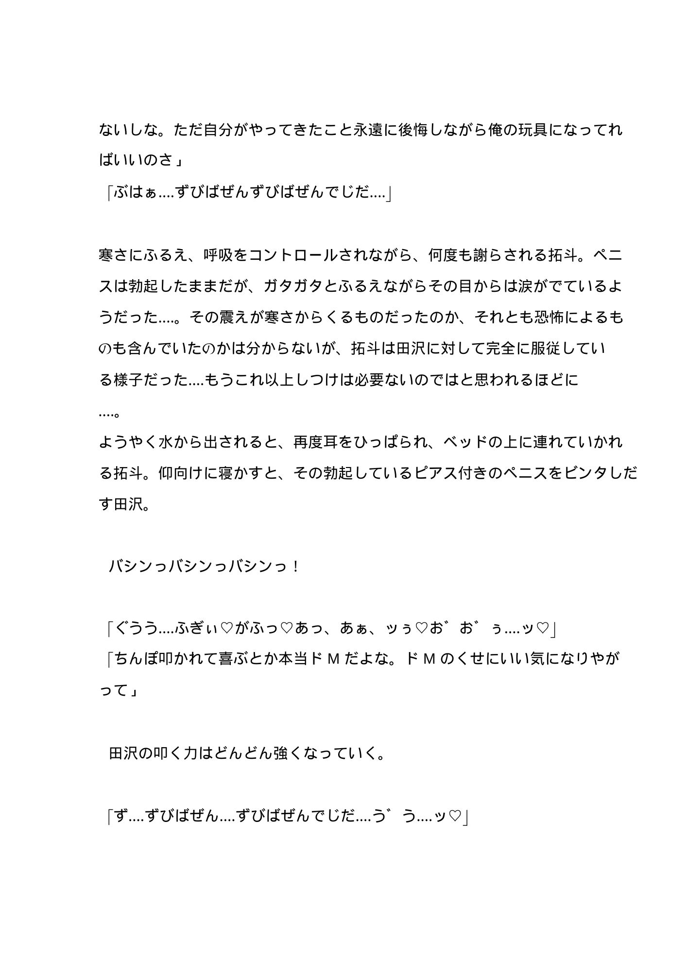 盗撮カメラ付きのホテルで行為に及んでいたゲイカップルが催涙ガスで眠らされ、監禁。〇漬けにされながら調教されていくお話。 本編ではノンケの拓斗が寝取られた上で、調教され、男相手に売りをさせられていましたが、番外編ではゲイのSタチを主人公としています。拓斗も一部登場し、本編のその後の様子を描いています。 言葉責め、蝋燭、中出し、羞恥入墨、スキンヘッド、水責め、ストリップ、尿道責め、ドライオーガズム、輪〇、小便ぶっかけ等