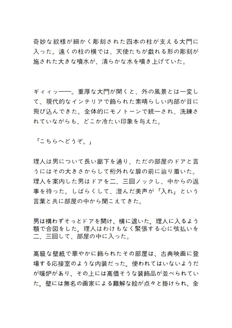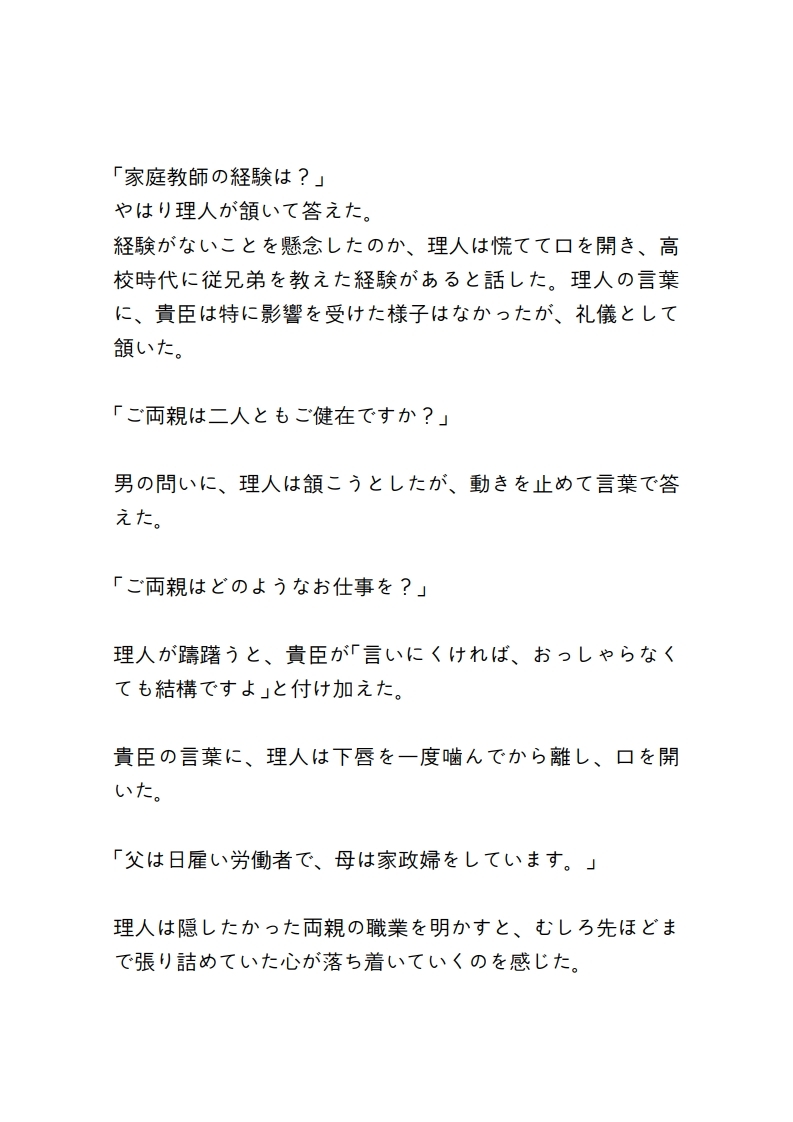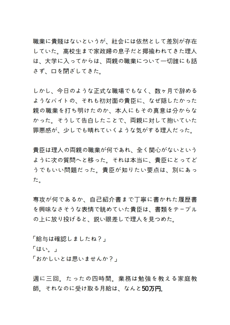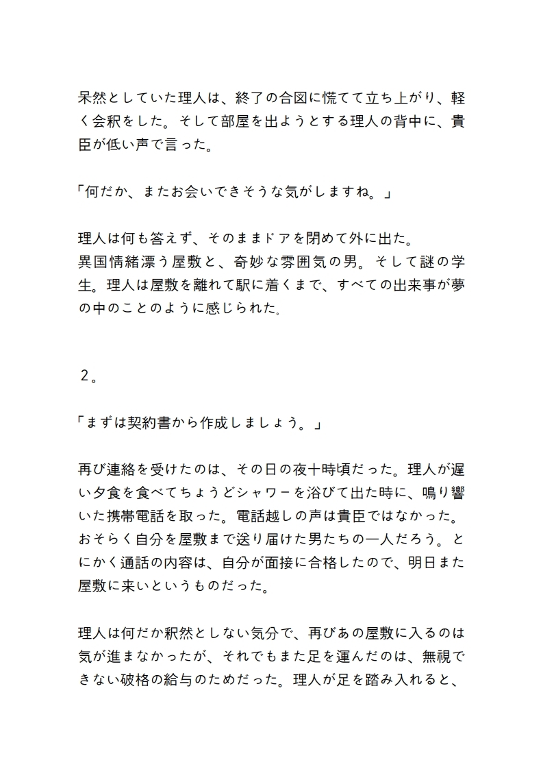 高額の報酬に惹かれ、外界から遮断された邸宅の家庭教師となった理人。