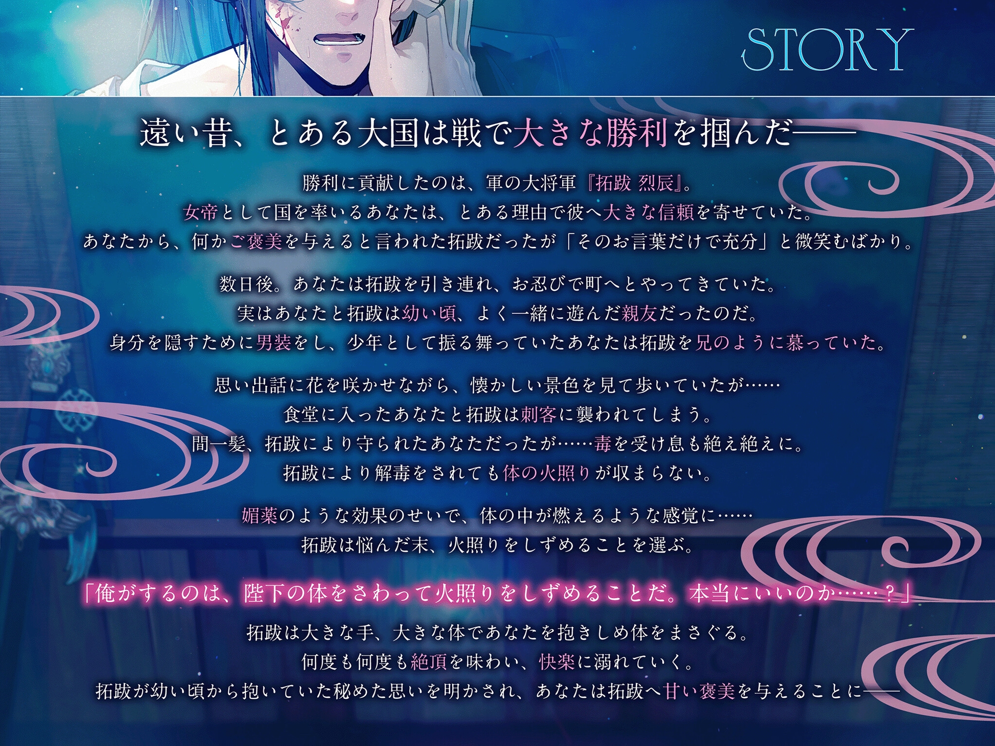 急遽即位した女帝のあなたは、大戦で勝利を収めた大将軍の拓跋 烈辰とお忍びで町へ出る。しかし、あなたは刺客に襲われ、媚薬入りの毒に侵されてしまう。解毒を試みる拓跋だが、体の火照りが収まらないあなたは大きな手に弄ばれ、ただ快楽に溺れていく。そして、拓跋の秘めた想いを知ってしまったあなたは彼に甘い褒美を与えることを決意する──。