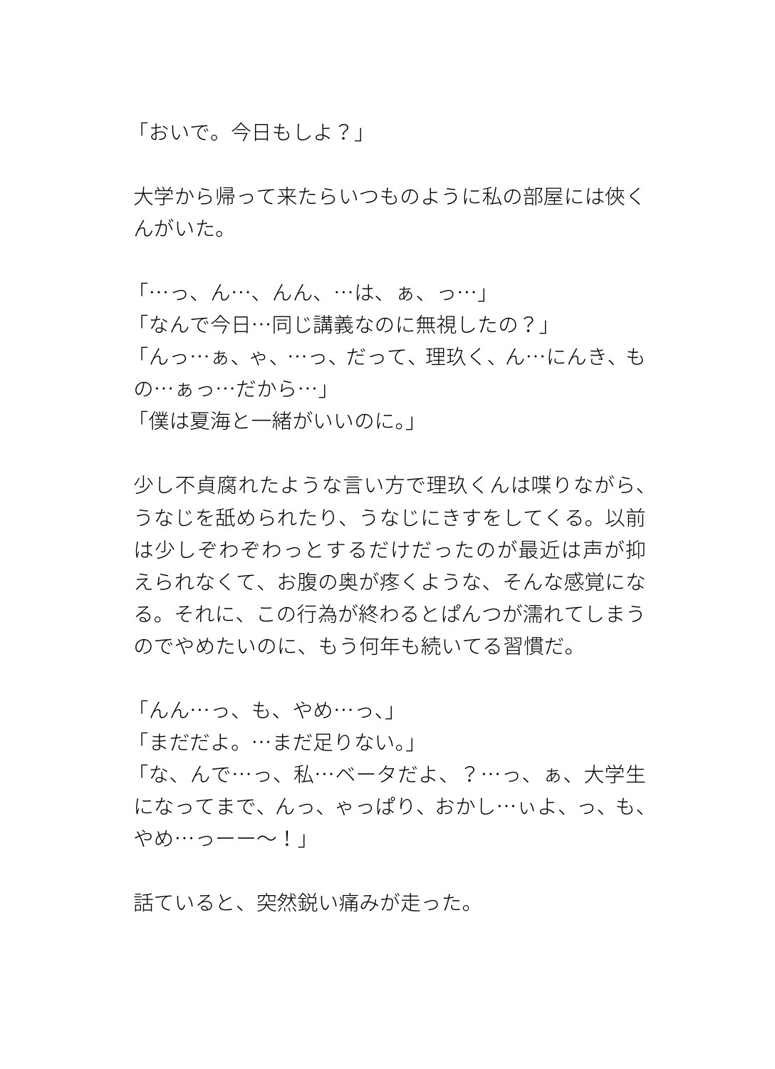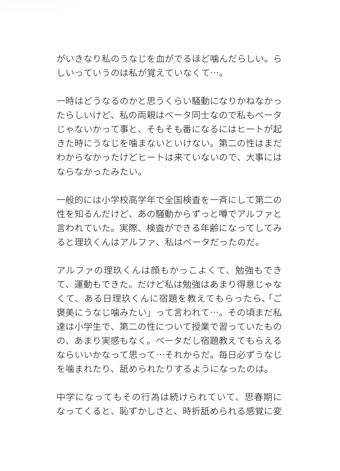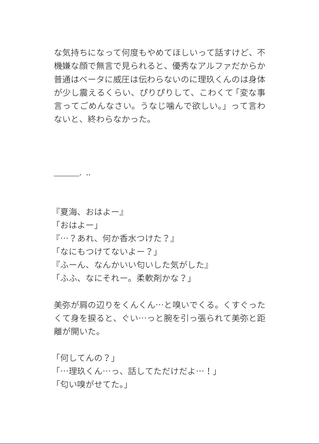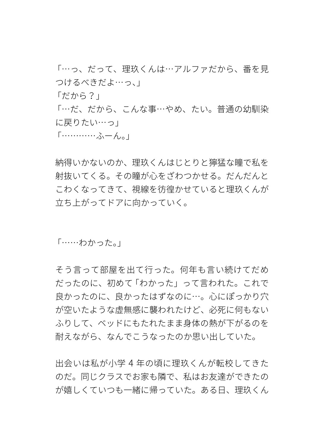 オメガバース物。ベータなのに幼馴染の彼にうなじを噛まれる習慣に、だんだんと身体が変化していって、初めてのクリ責め、潮吹きしながら最後はとろとろになるお話です。