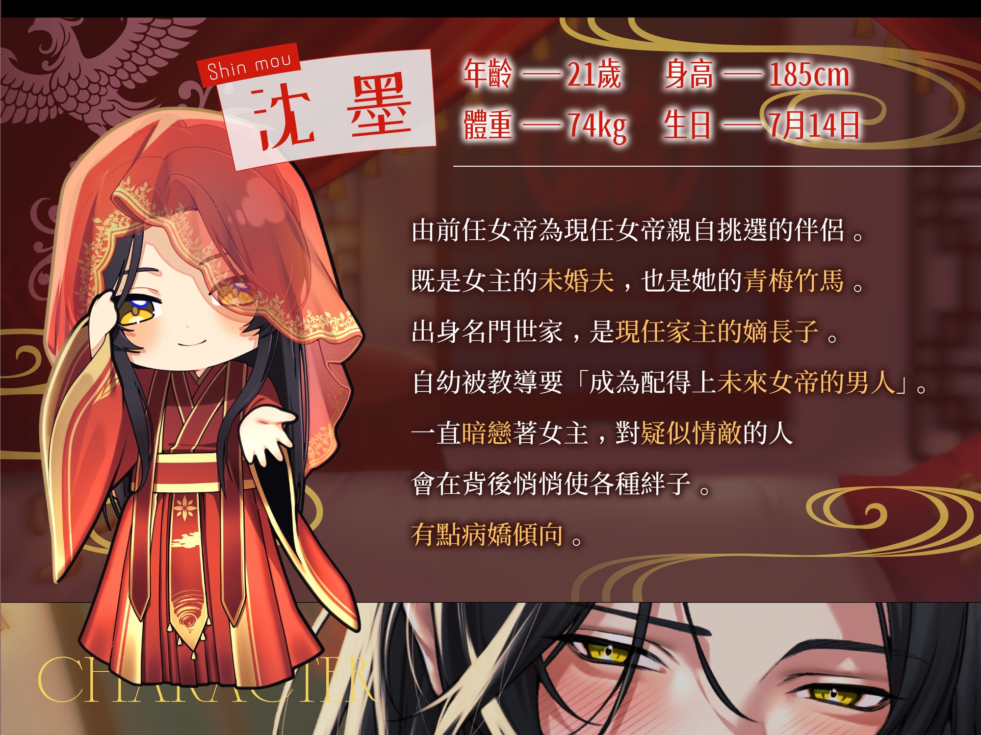 倉促即位的你,與先帝所指定的未婚夫——沈墨結為了夫妻。深深愛著你的他,在新婚生活中為每日忙於政務的你感到「擔心」,並以「寵愛你正是我的職責」為由,甚至會玩弄處理公務時的你。在尚未看清他真正面貌的情況下,你逐漸沉溺於那份過份沉重的愛意——