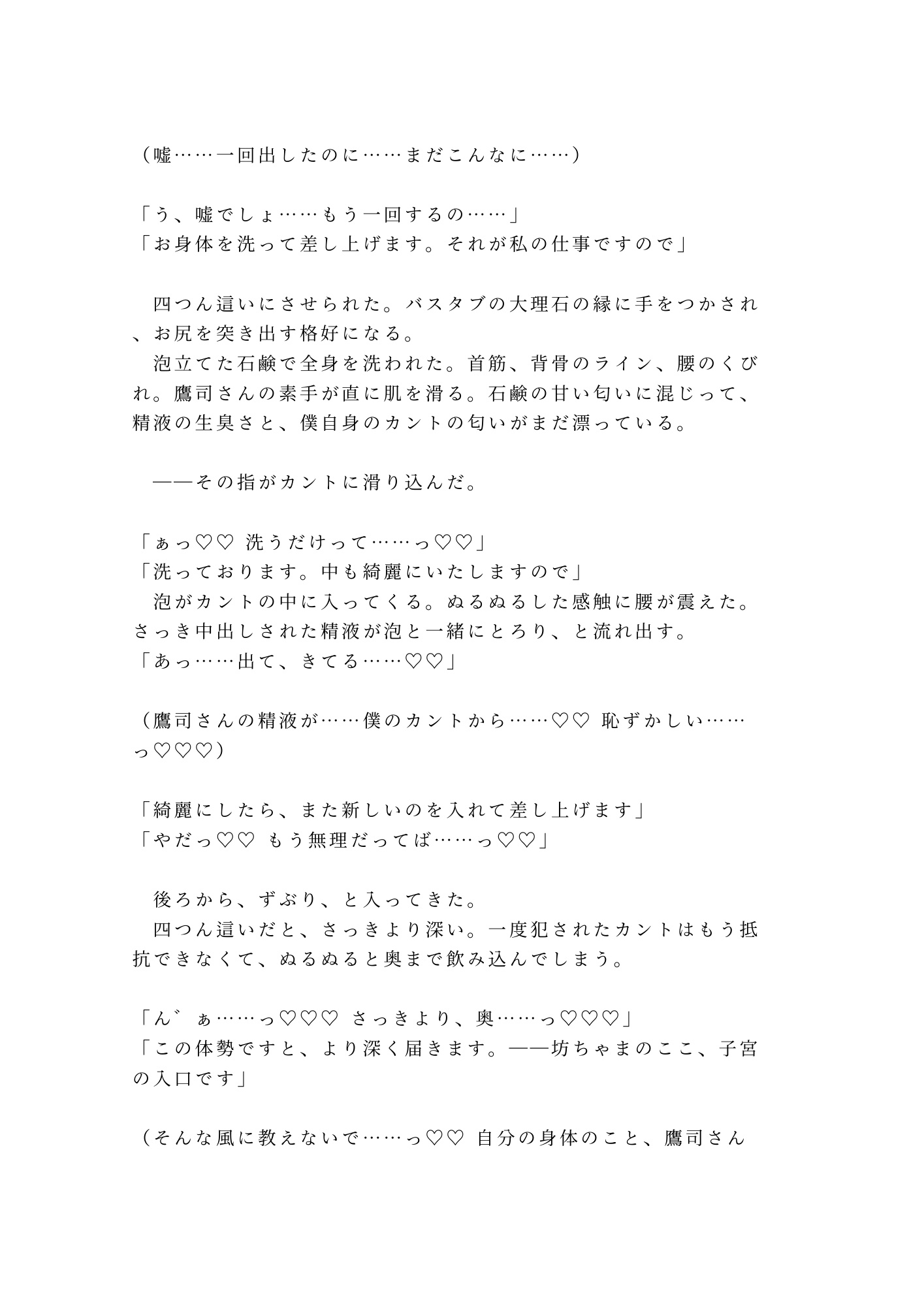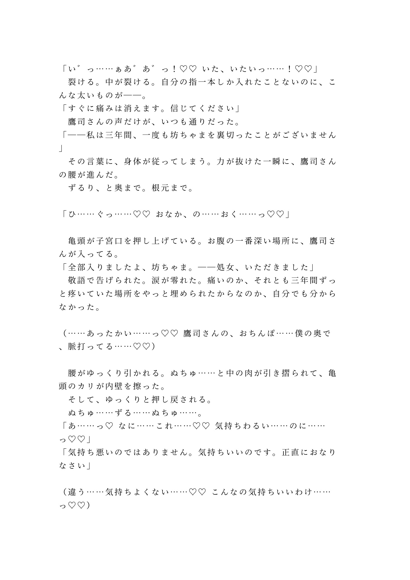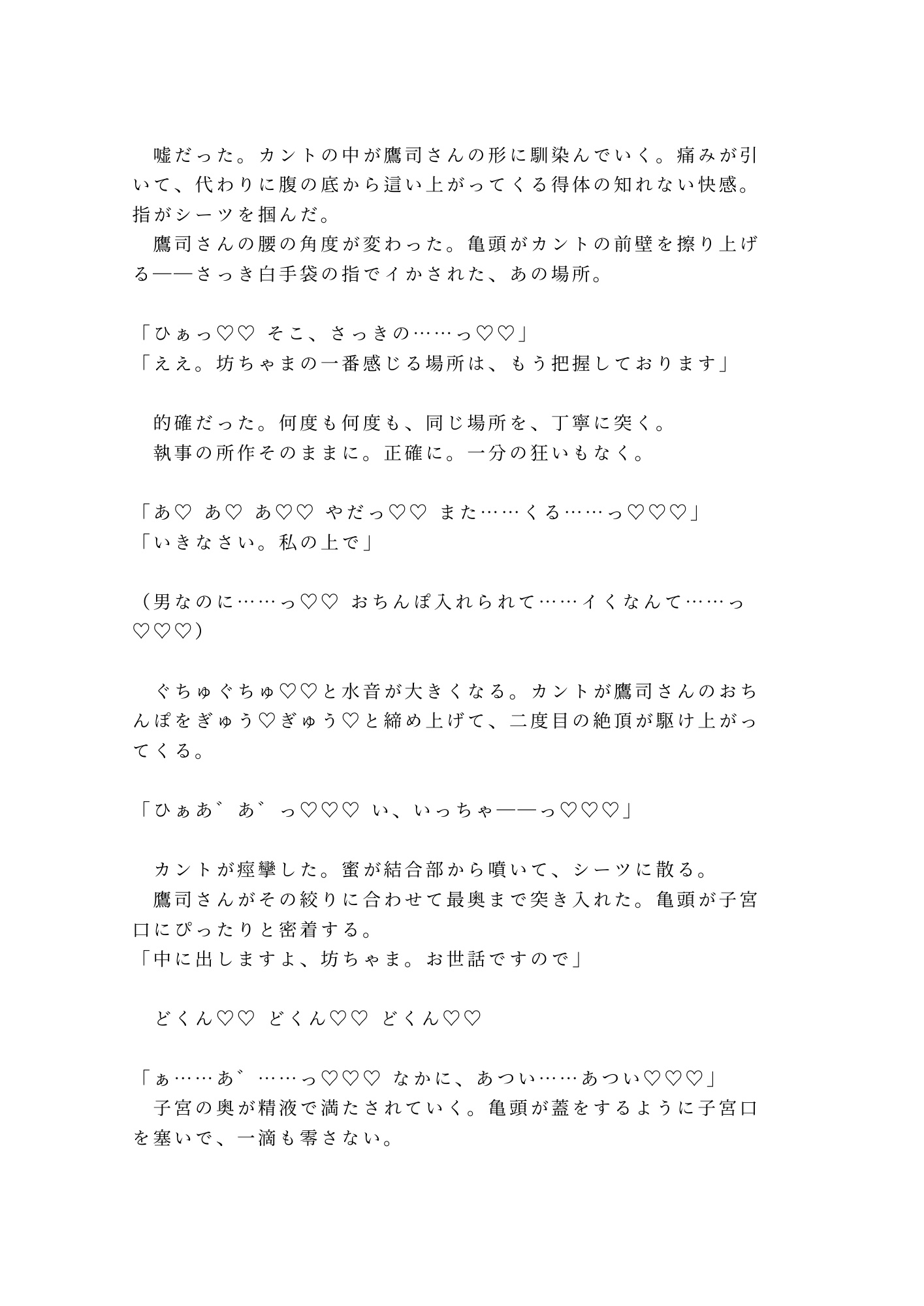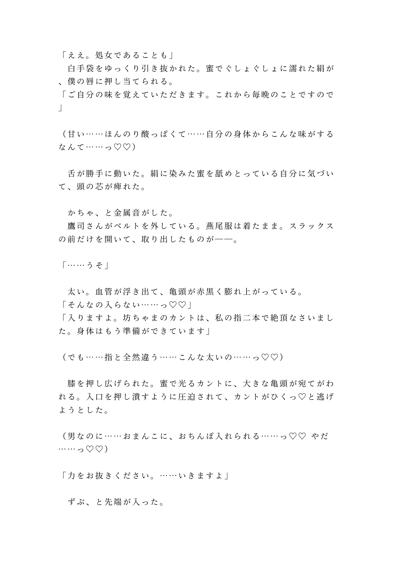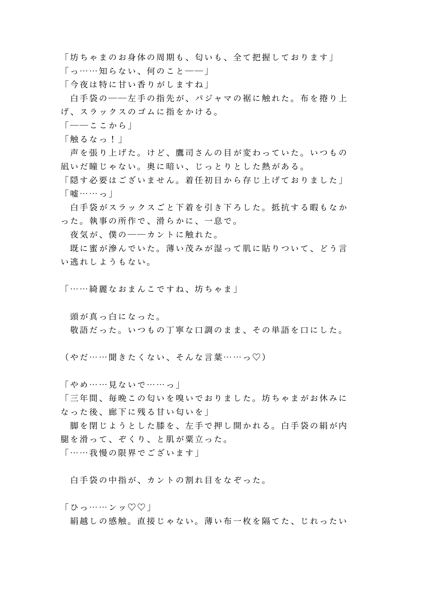 名門の坊ちゃまには秘密がある。股の間に隠した、誰にも知られてはならない淫らなカント。——けれど完璧な執事・鷹司は、着任初日から全てを知っていた。梅雨の夜、甘い匂いに我慢の限界を迎えた執事が白手袋のまま処女を暴く。絹越しの愛撫で初絶頂を教え込まれ、敬語で淫語を囁かれ、朝まで五回、奥の奥まで注がれ尽くす主従逆転カント陵○BL