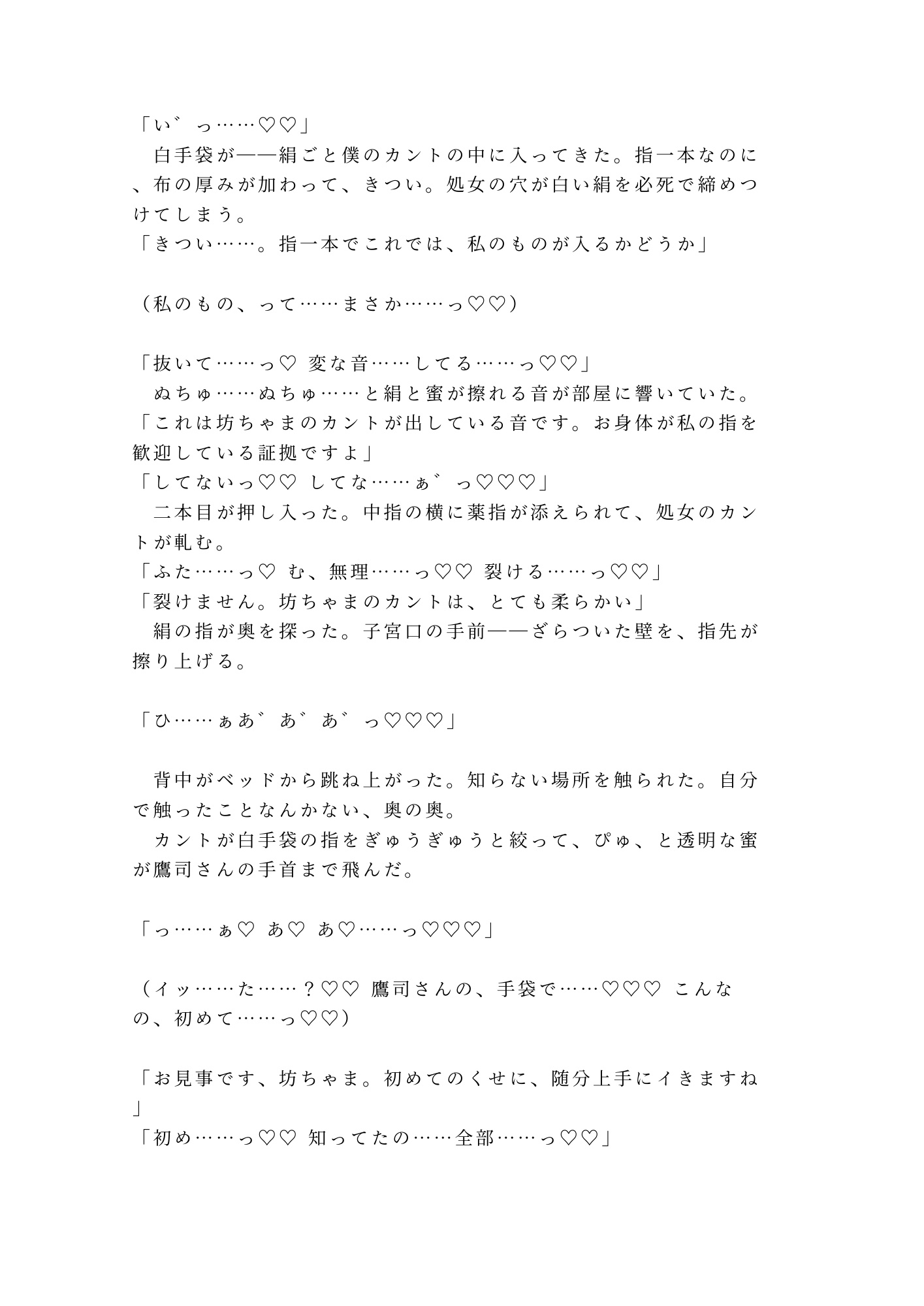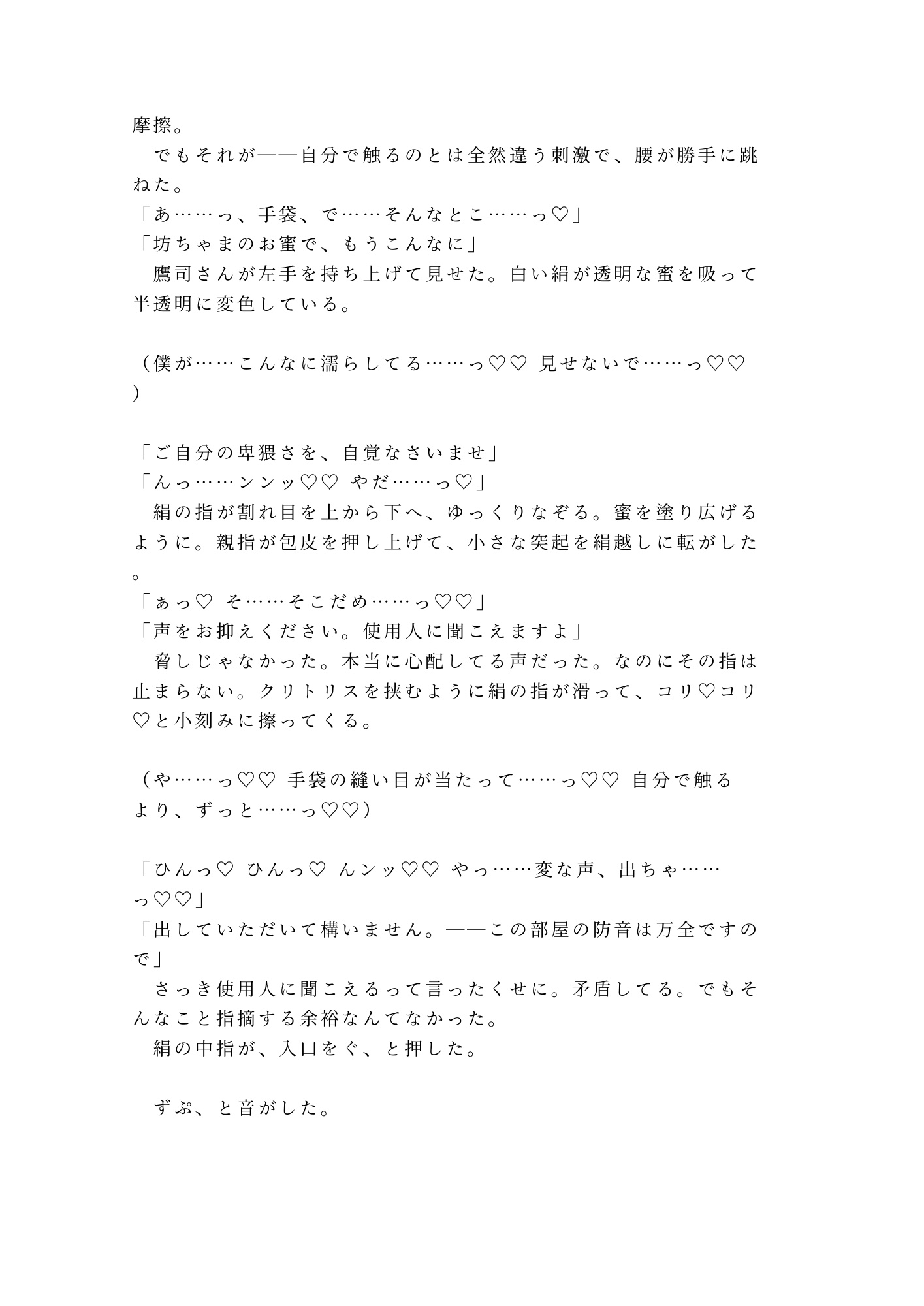 梅雨の夜、限界を迎えた執事がドアに鍵をかける。白手袋の絹越しに処女のカントをなぞり、敬語のまま「綺麗なおまんこですね、坊ちゃま」と囁く。絹の縫い目がクリトリスを擦り上げ、蜜を吸った手袋が半透明に染まっていく——その光景を「ご自分の卑猥さを自覚なさいませ」と見せつけながら。