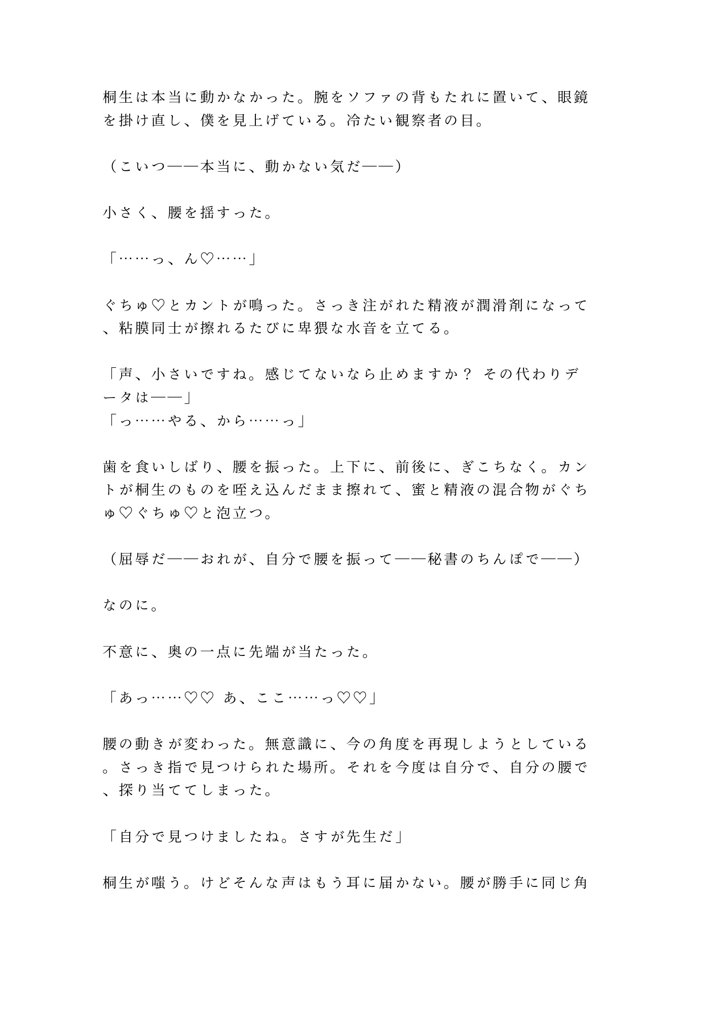 脅迫から始まる四回の交わり。デスクの上で、ソファの上で、体位を変え、主導権を入れ替えながら、「やめろ」が「もっと」に変わるまでの転落を、息つく暇もない密度で描き切ります。