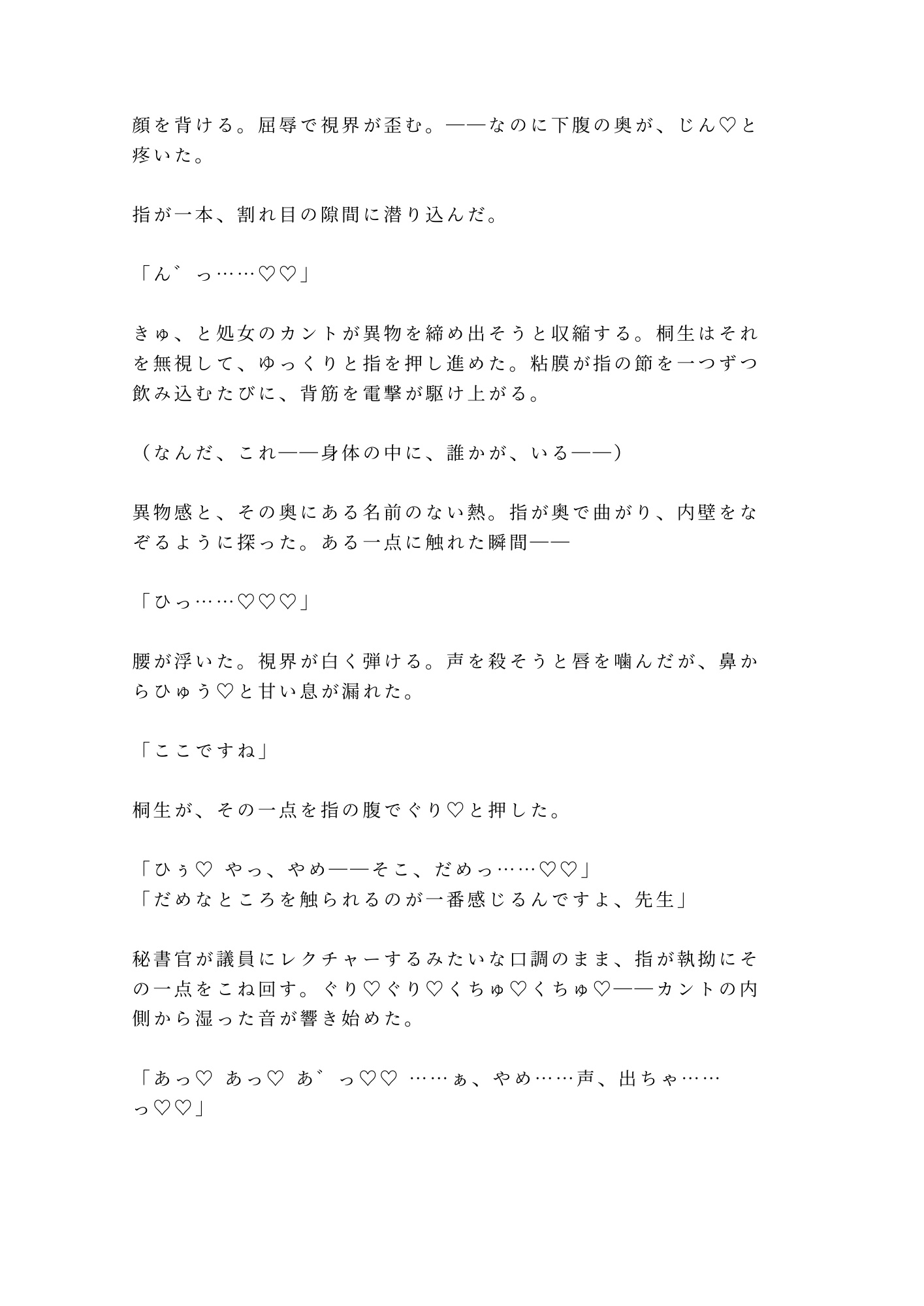 名門議員の息子・柊には誰にも言えない秘密がある——股の間に存在する、もうひとつの性器。三年間忠実に仕えた秘書・桐生がその秘密を握り、議員会館の執務室で牙を剥いた。「スキャンダルにしたくなければ腰を振れ」——ネクタイで縛られ、国会資料の上で処女を奪われ、四回中出しされるうちに、二世議員のプライドは快楽の底に沈んでいく。権力と肉体が交錯する密室陵○BL