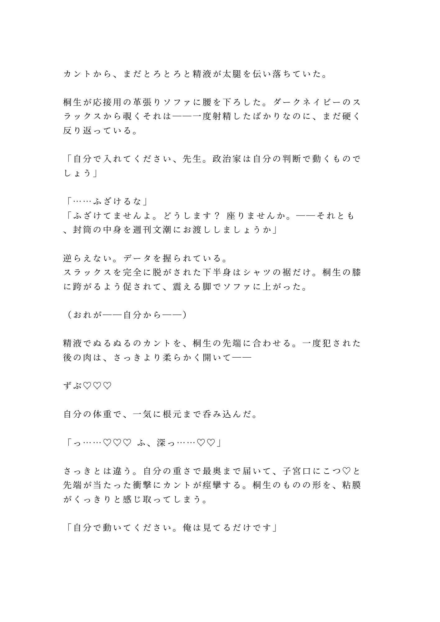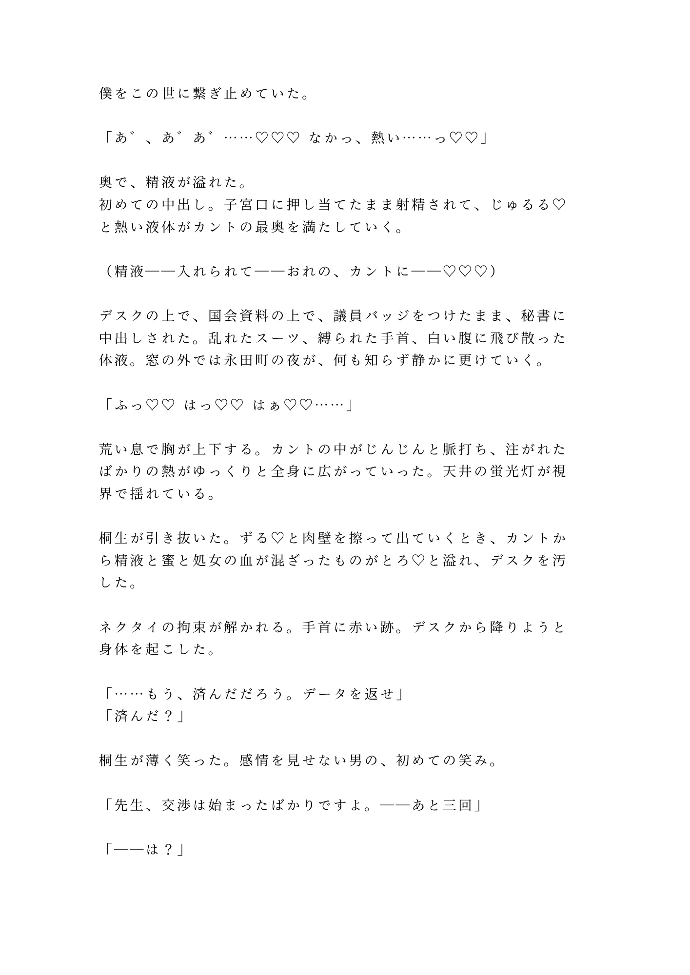 若き二世議員・榊には、政界に知られてはならない秘密があった。戸籍上は男でありながら、股の間にはもうひとつの性器——カントが存在する。父親の権力で封印されたはずの検査記録。それを握っていたのは、三年間忠実に仕えてきた秘書官・桐生だった。
