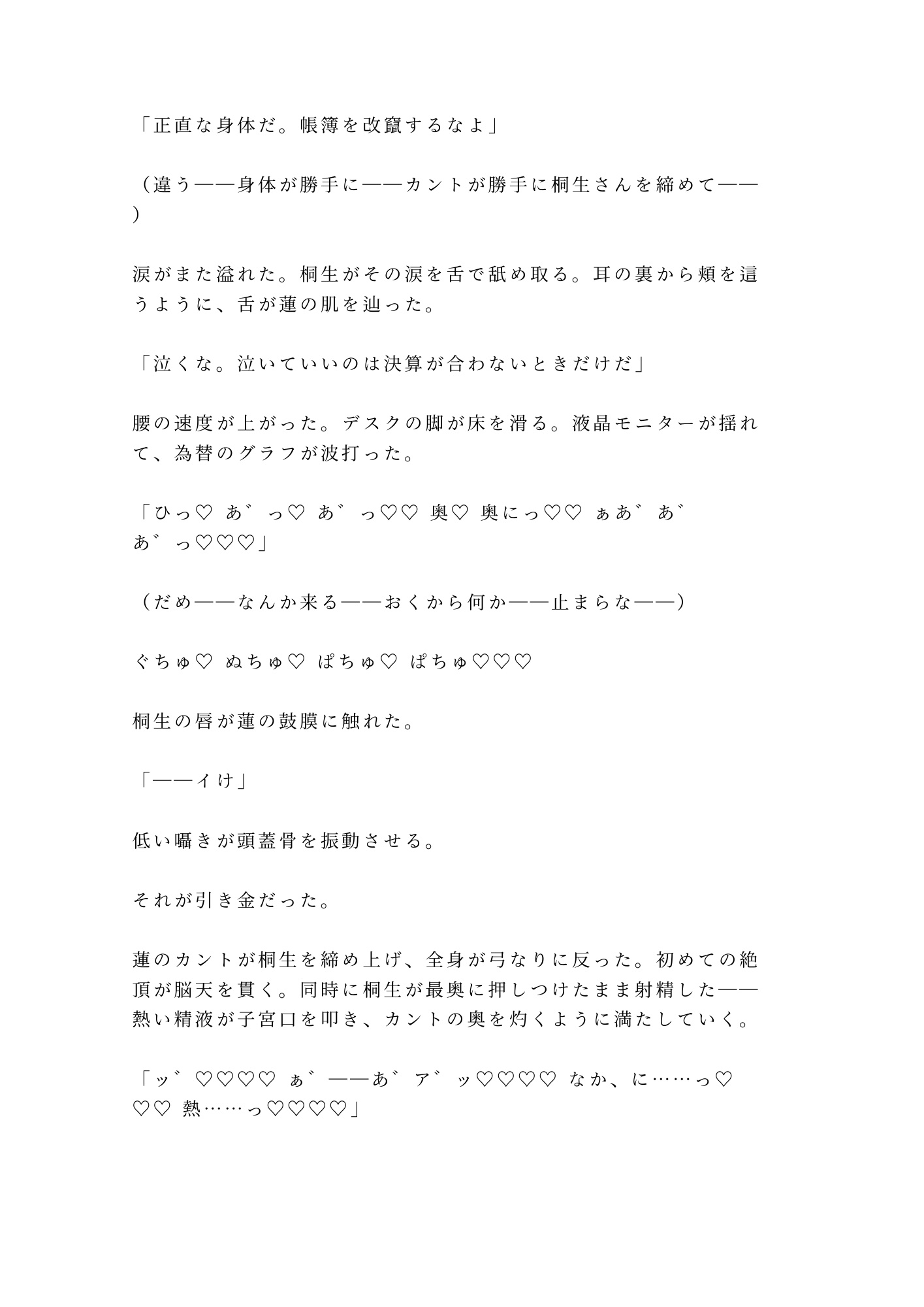 「四半期決算は四回分ある」。一回では終わらない。デスクの上で、エグゼクティブチェアで、体位を変え、関係を変え、四回の中出しが蓮を完全に堕とすまで。最初は涙で拒んでいた身体が、やがて自分から腰を沈める瞬間——「自主開示だな。記録した」。支配と快楽が数字の言葉で綴られる、オフィスBLの極致。