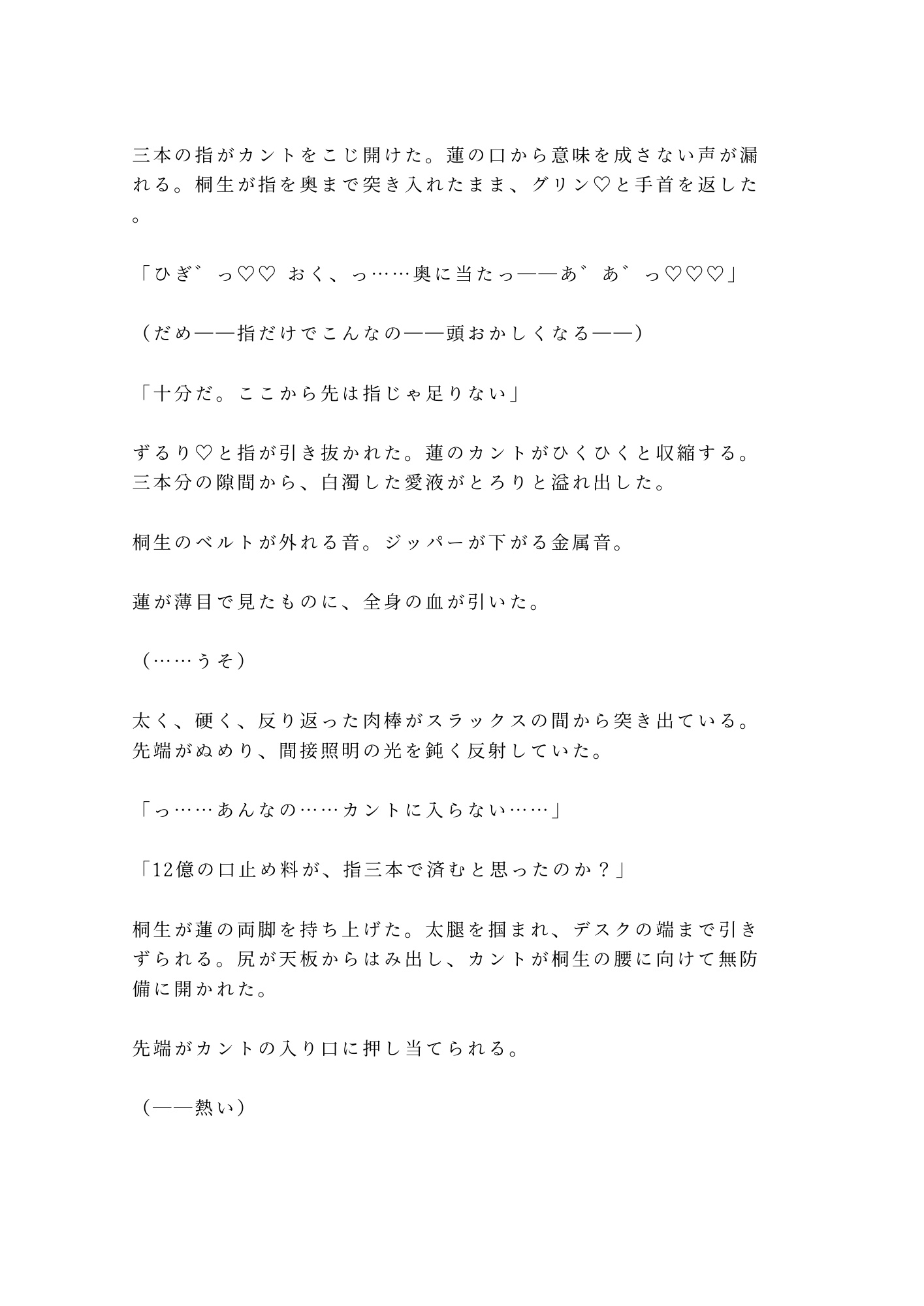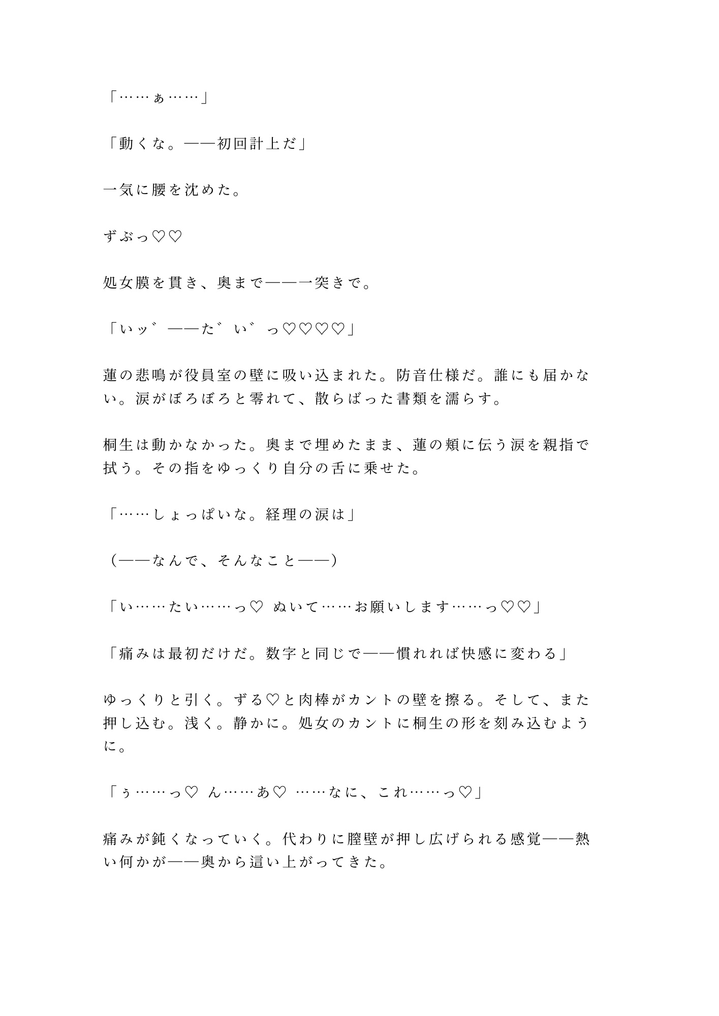 夜景だけが灯る役員室。四半期決算の書類が敷かれたマホガニーのデスクの上で、蓮の秘密は暴かれる。処女のカントを「未監査の帳簿」と呼ぶ男は、経理の数字を扱うように正確に、冷酷に、蓮の身体を開いていく。抵抗する理性を嘲笑うかのように溢れる蜜。「正直な帳簿だな」——その一言で、蓮の羞恥は限界を超えた。