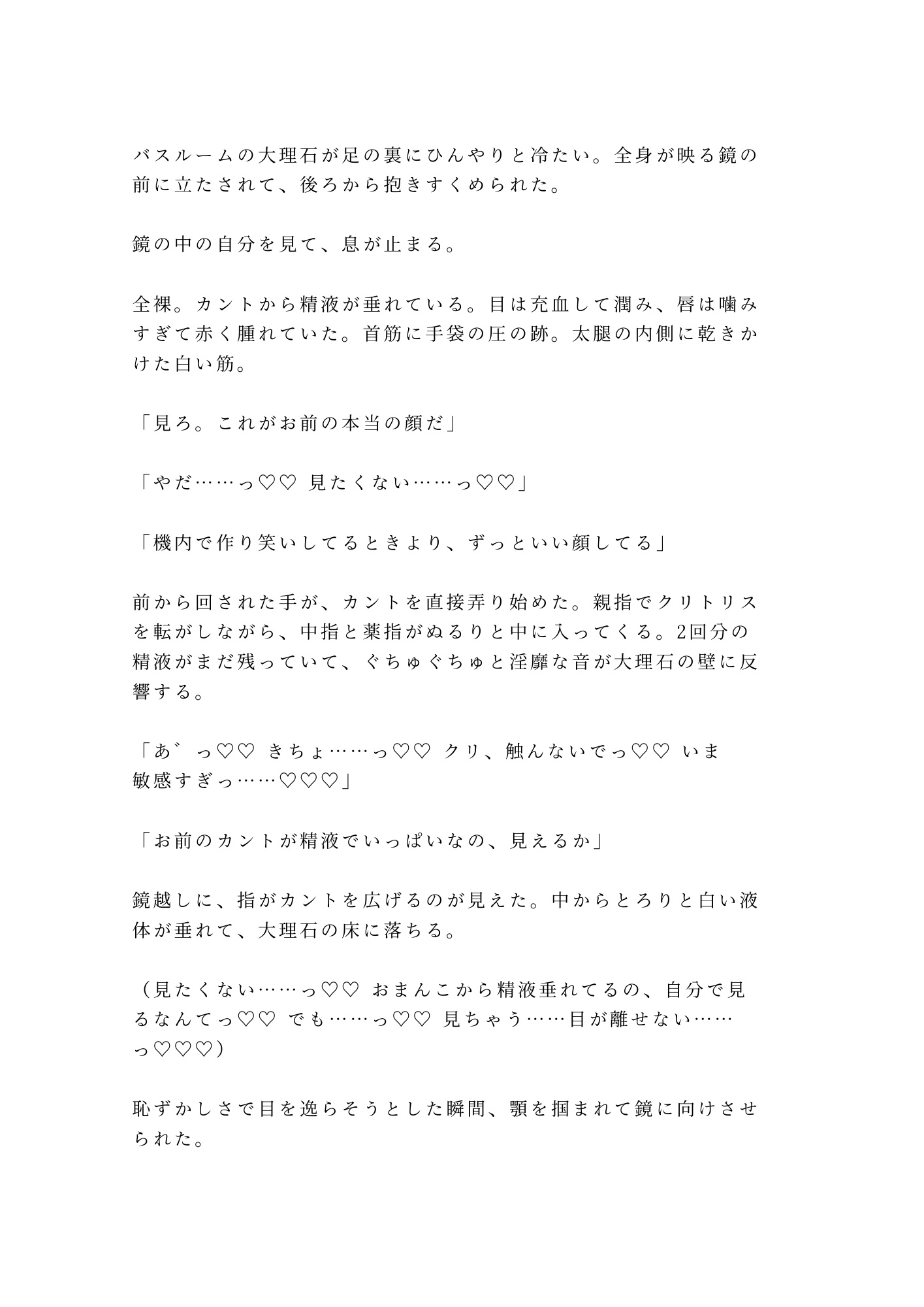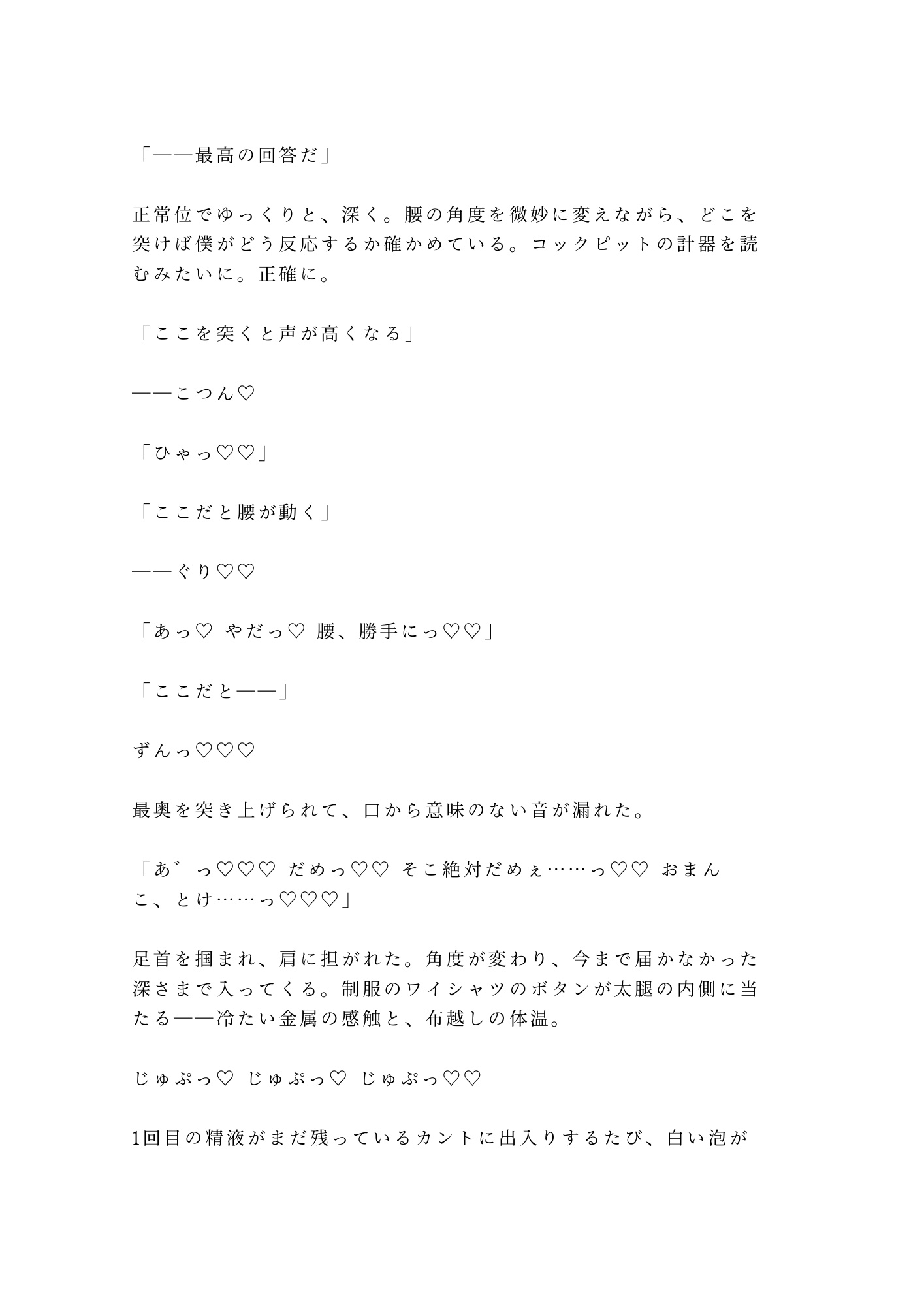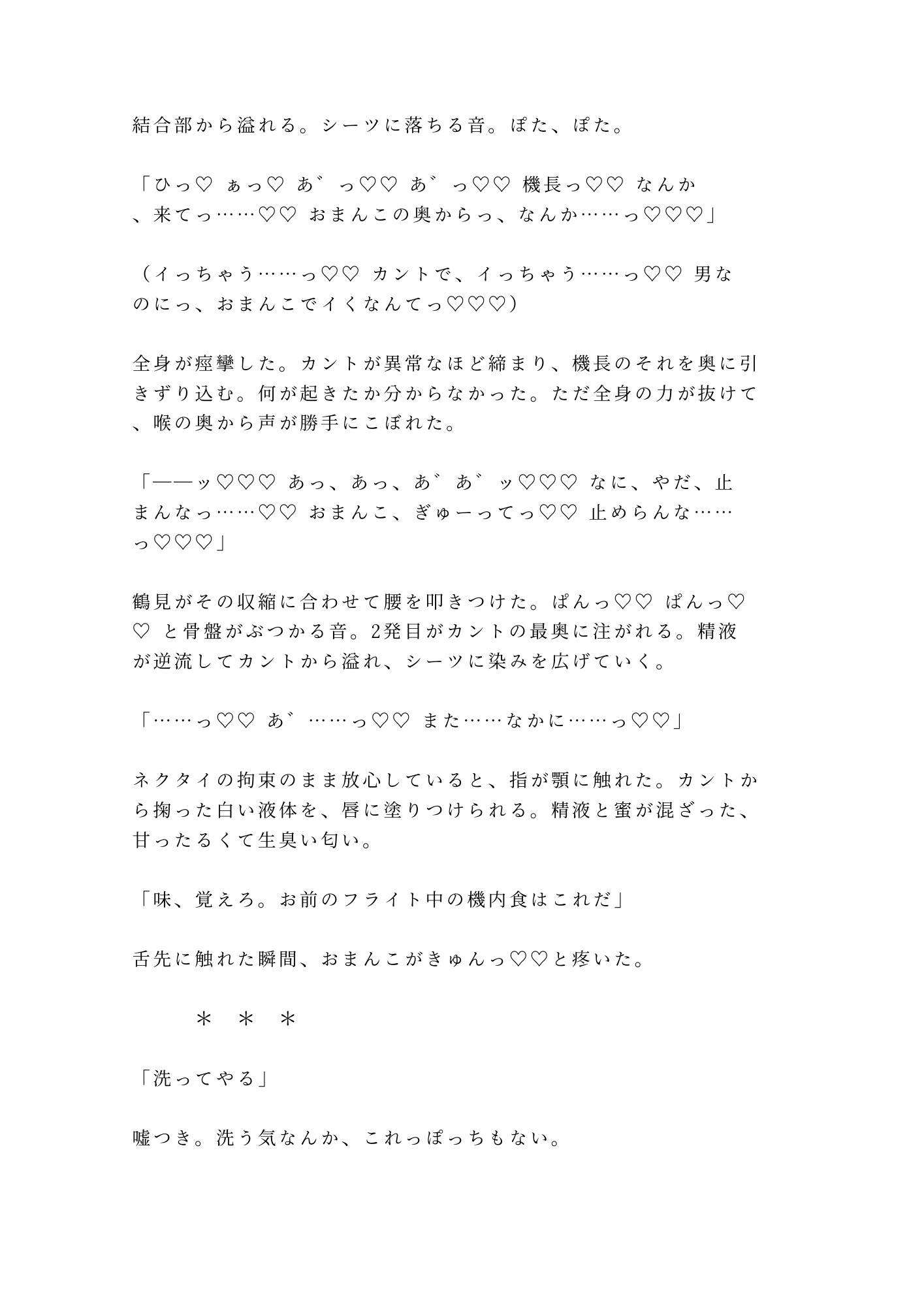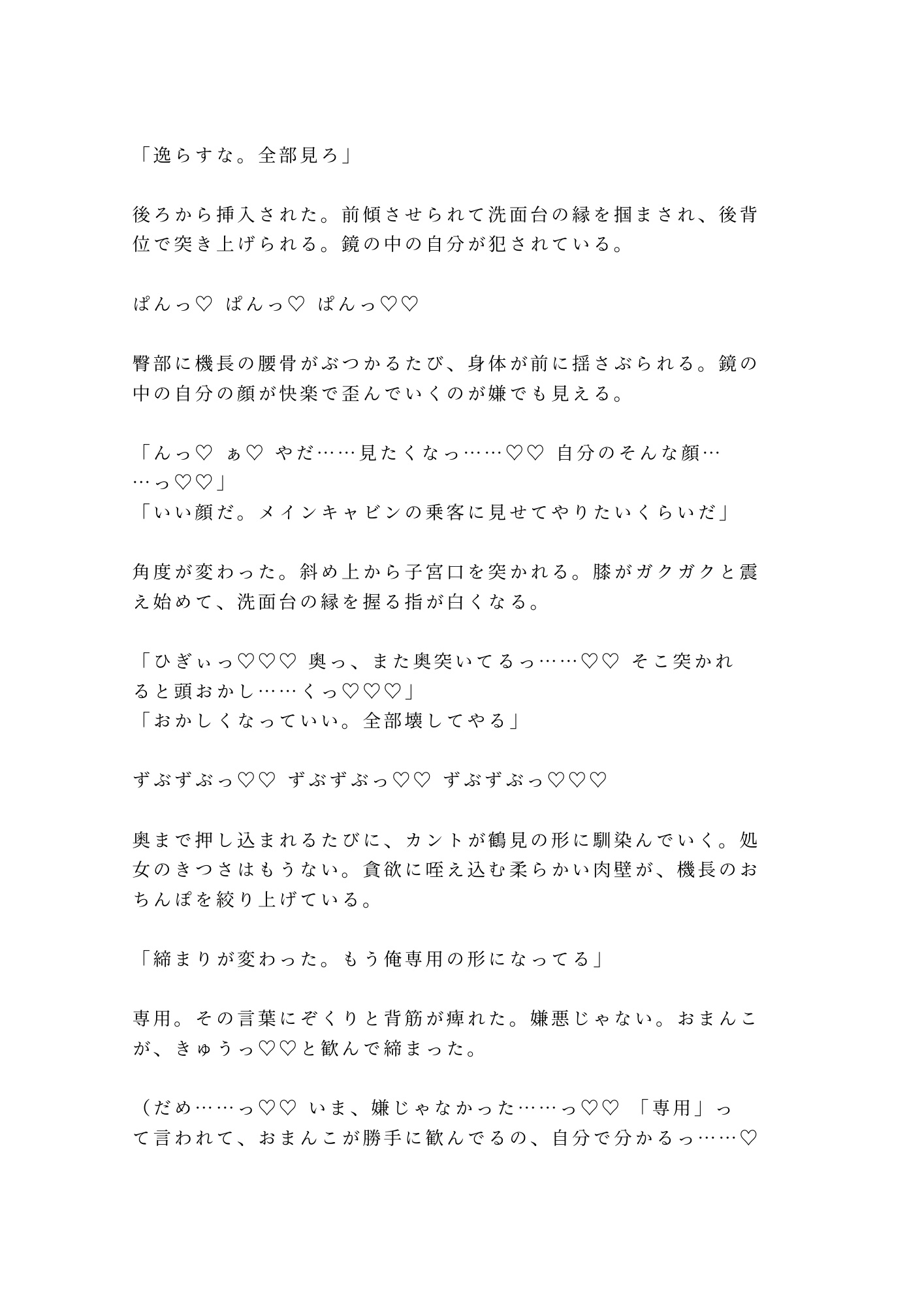 壁際で、ベッドで、バスルームの鏡の前で。一回ごとに身体が機長の形に作り変えられていく。抵抗していたはずのカントが、いつしか自分から貪欲に求め始める。六回の種付けの果てに、新人CAの理性と誇りがすべて溶け落ちる一夜の物語。
